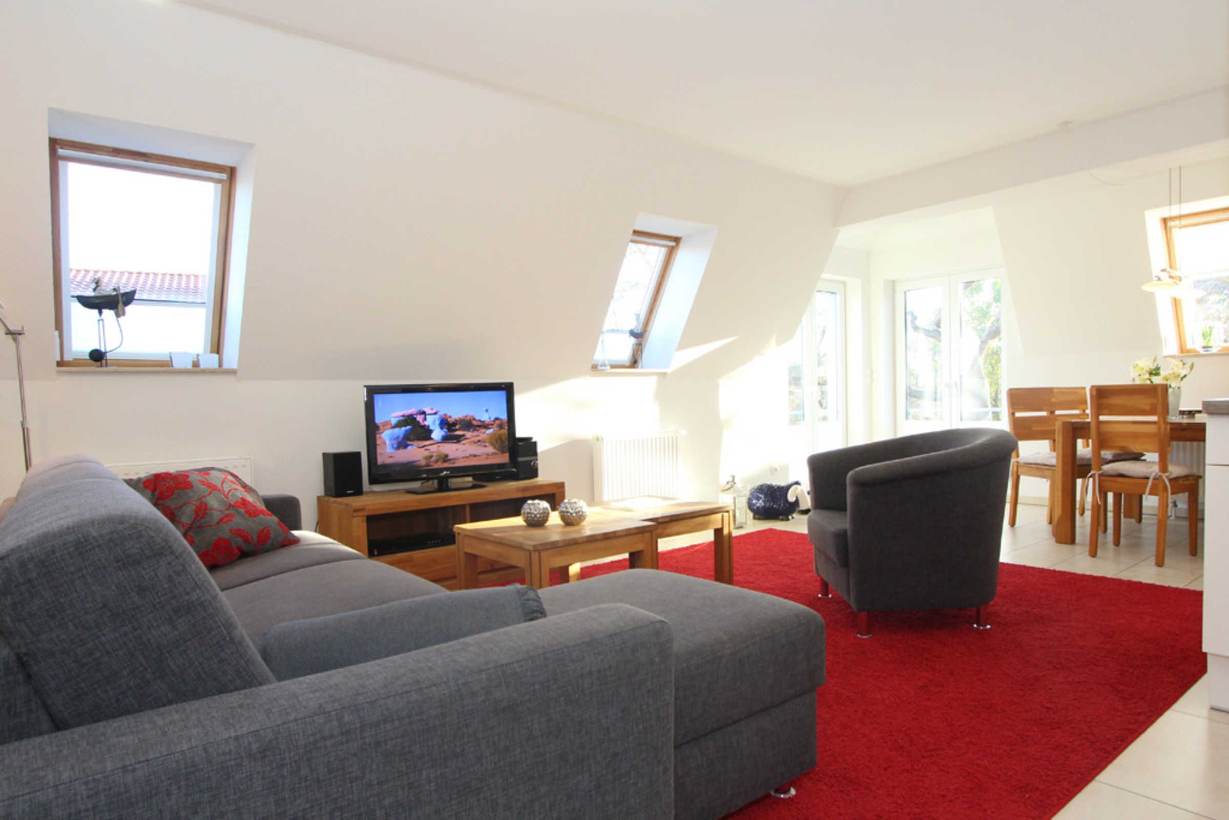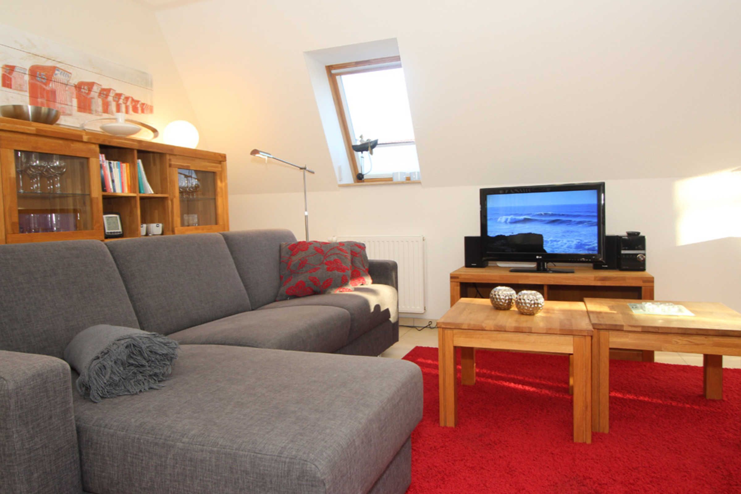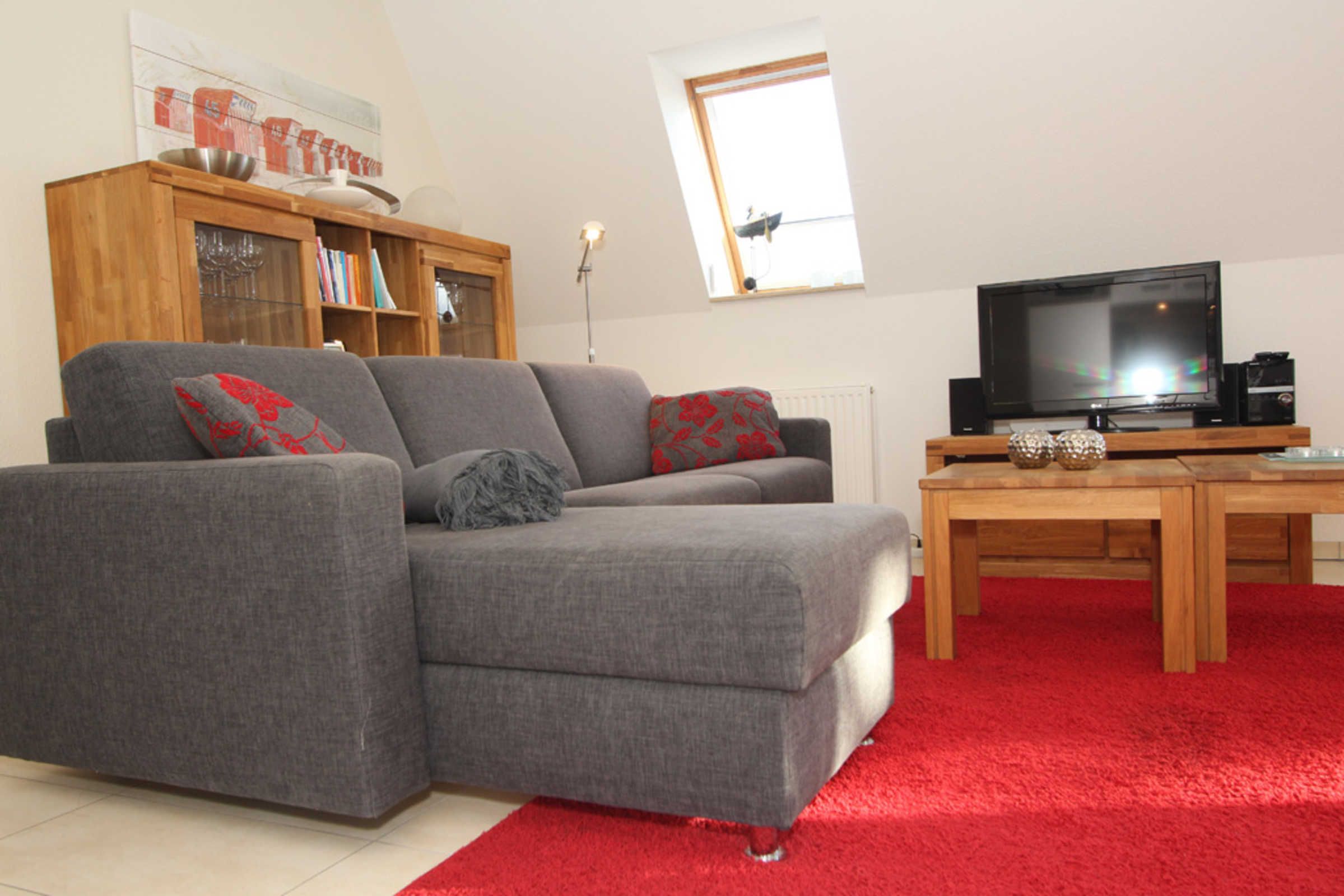 Im Wohn- und Esszimmer im unteren Bereich der Wohnung steht zentral das gemütliche Sofa mit Flatscreen-TV mit Waipu-TV (zum Streamen bspw. von Netflix und Amazon Video [eigener Account erforderlich]) DVD-Player, Radio und Musikanlage. Das Sofa lädt im Sommer und im Winter zum Lesen und Entspannen ein.