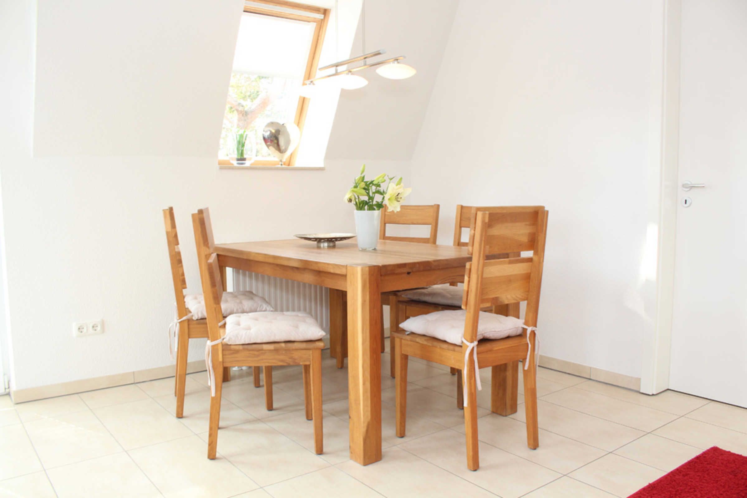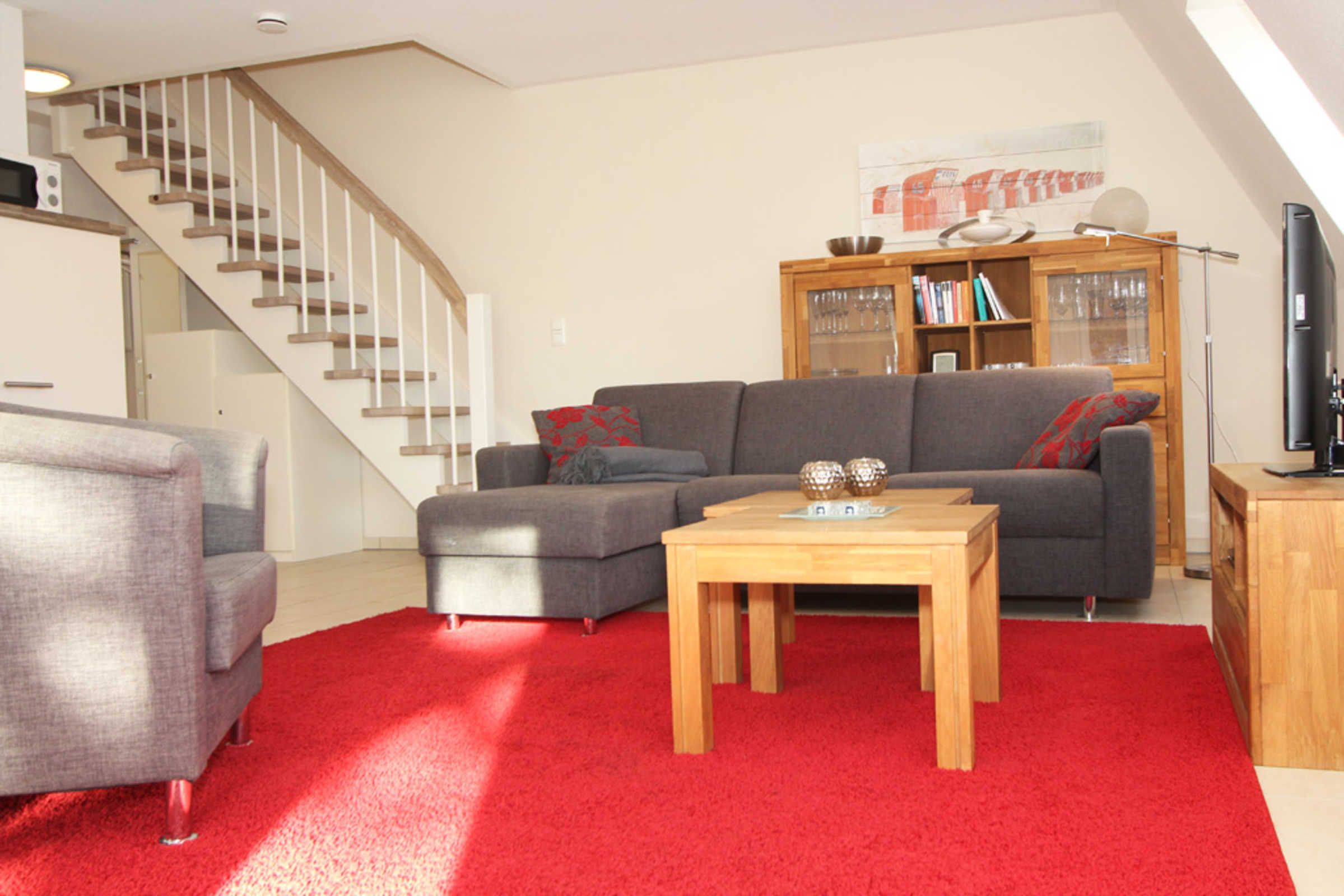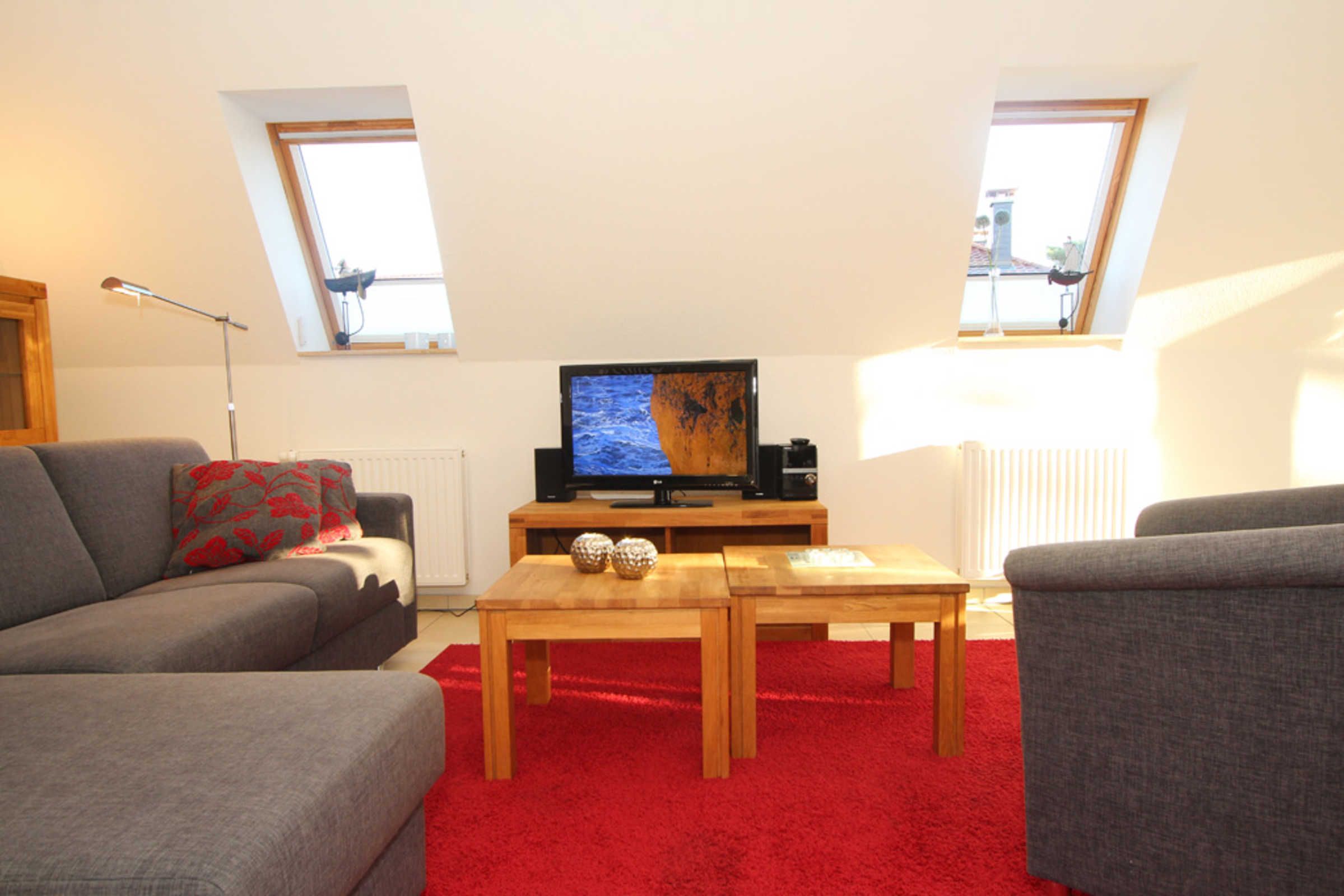 Im Wohn- und Esszimmer im unteren Bereich der Wohnung steht zentral das gemütliche Sofa mit Flatscreen-TV mit Waipu-TV (zum Streamen bspw. von Netflix und Amazon Video [eigener Account erforderlich]) DVD-Player, Radio und Musikanlage. Das Sofa lädt im Sommer und im Winter zum Lesen und Entspannen ein.