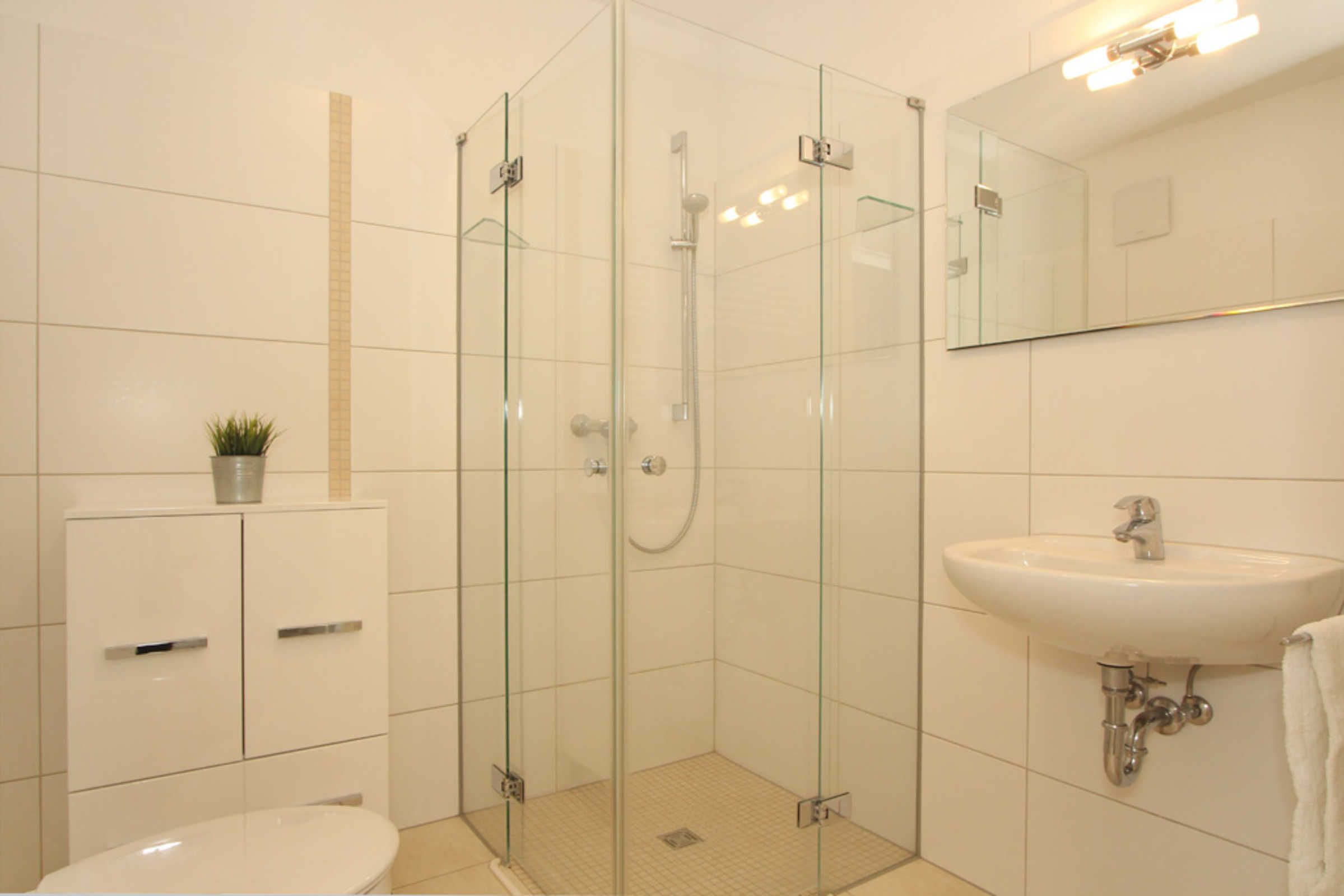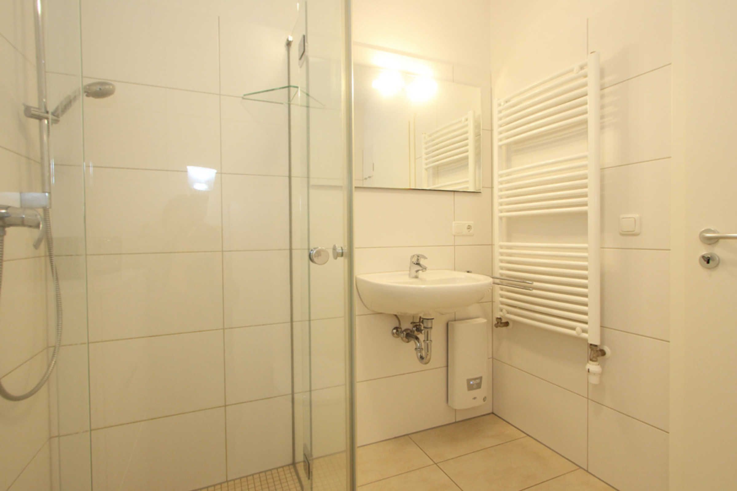 Das Bad ist mit einer ebenerdigen Regenschauer-Dusche, einem WC und einem praktischen Handtuchtrockner und LED-Spiegel eingerichtet.