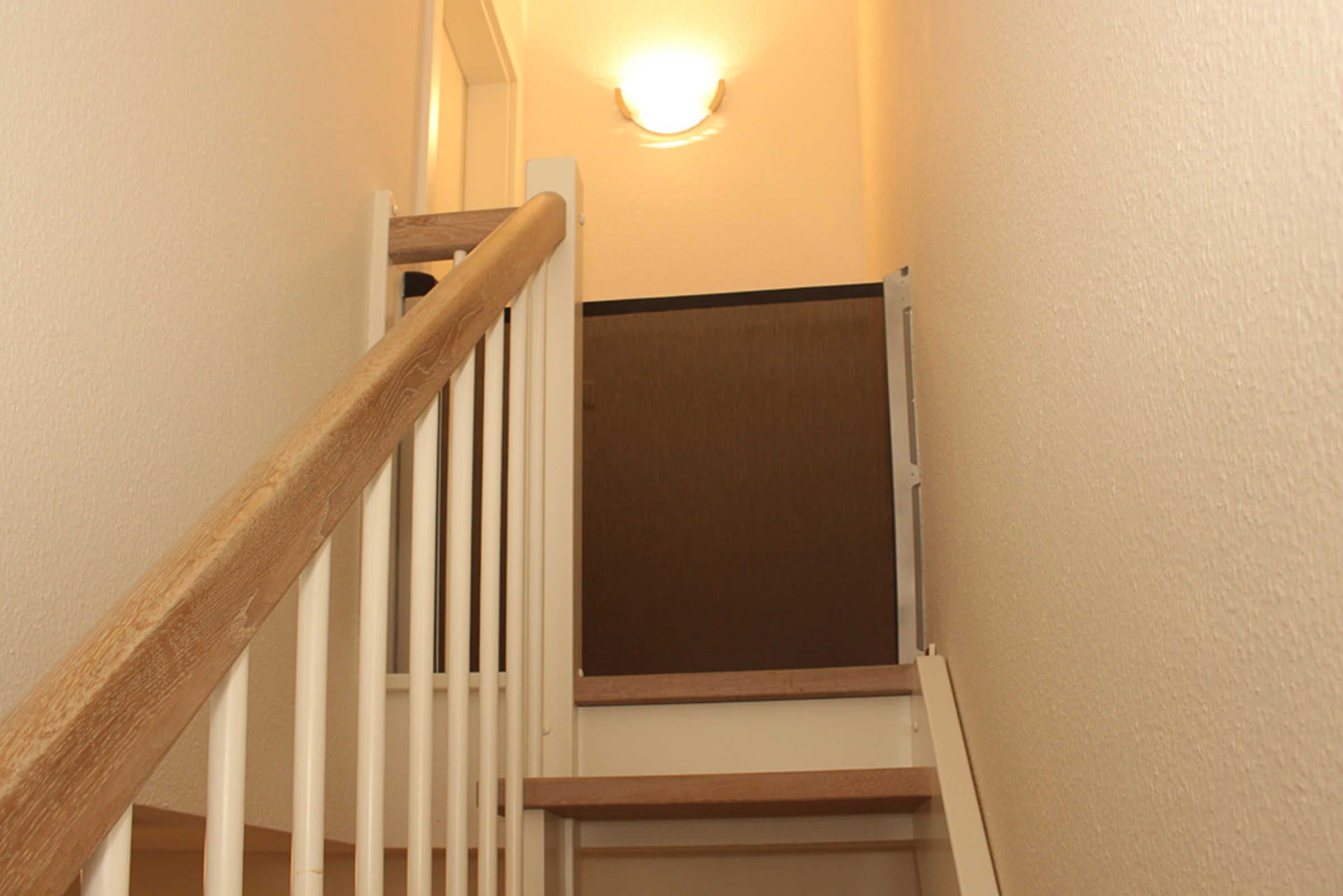 Vom Wohn-/ Küchenbereich aus führt eine Holztreppe in die zweite Wohnebene, ins Dachgeschoss. Die Treppe ist oben mit einem Treppenschutz gesichert.