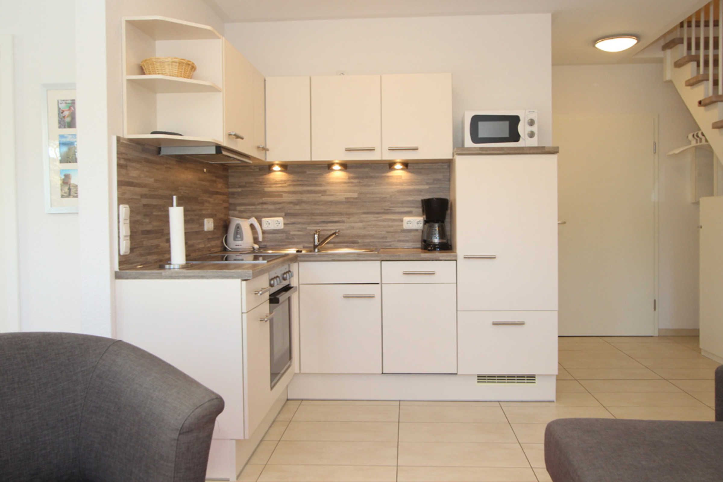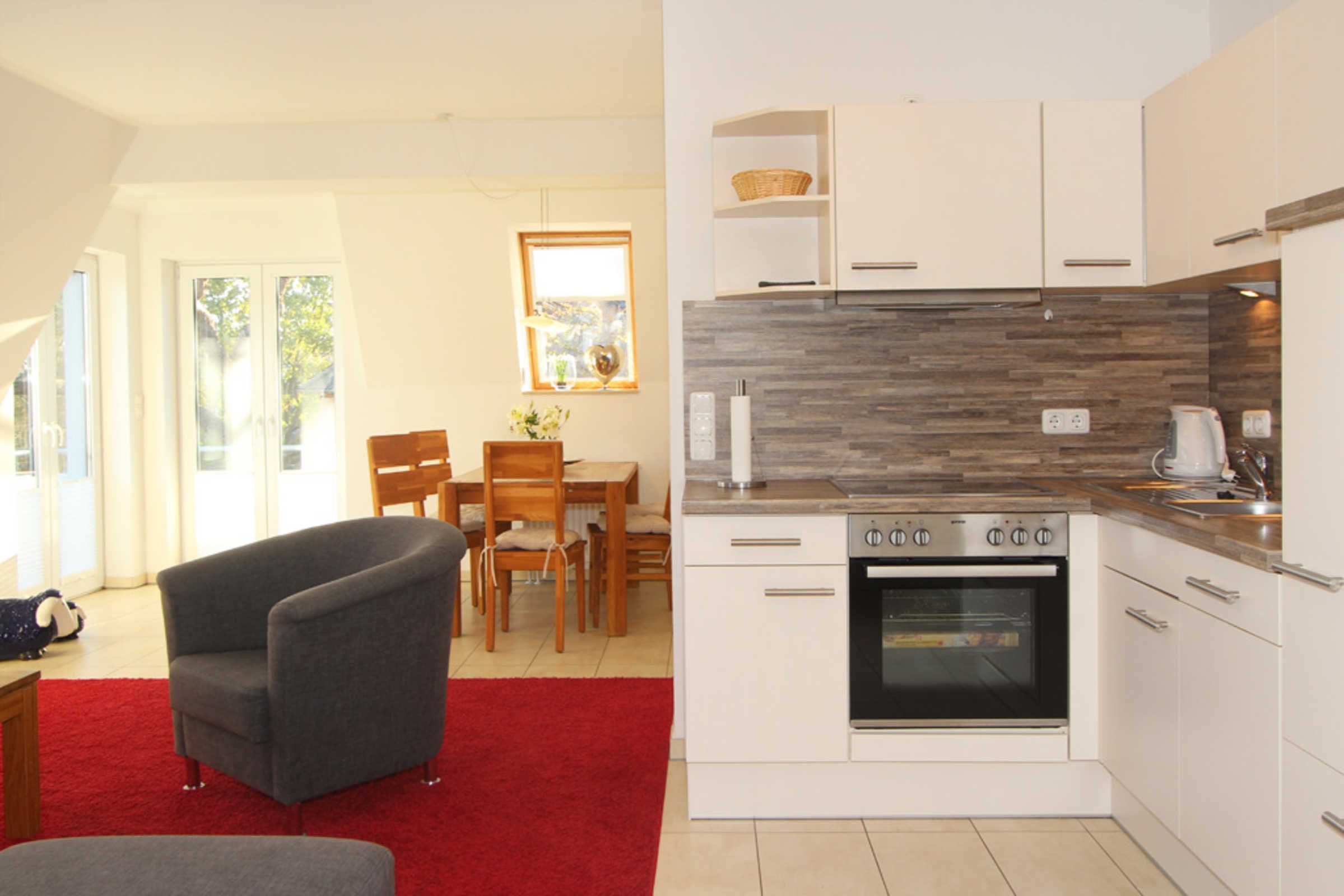 Daneben befindet sich eine helle Essecke mit fünf Sitzplätzen. Die offene Küche mit Cerankochfeld, Backofen, Kühlschrank mit Gefrierfach, Spülmaschine und Mikrowelle bietet eine umfangreiche Ausstattung, um nach Lust und Laune zu Kochen.