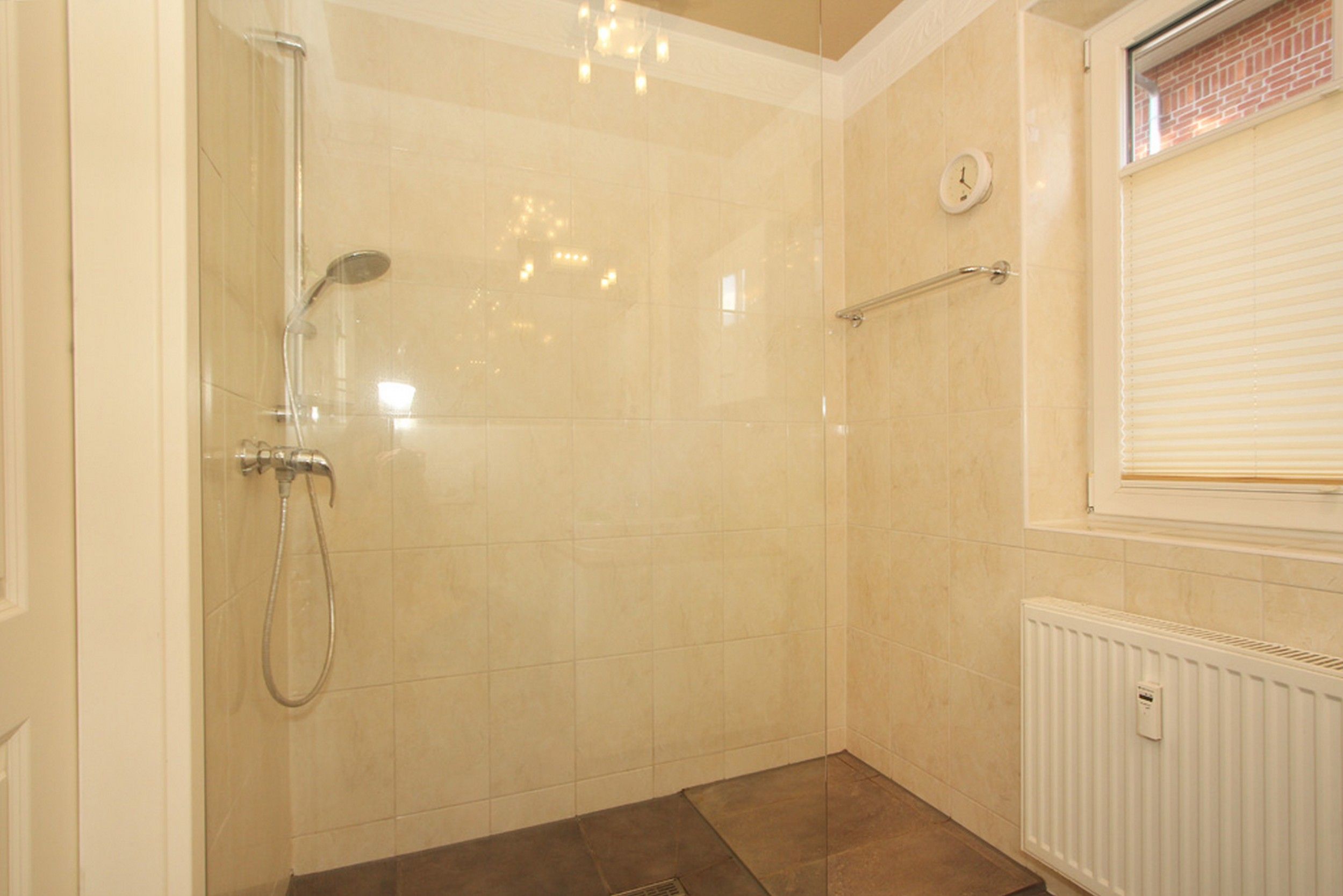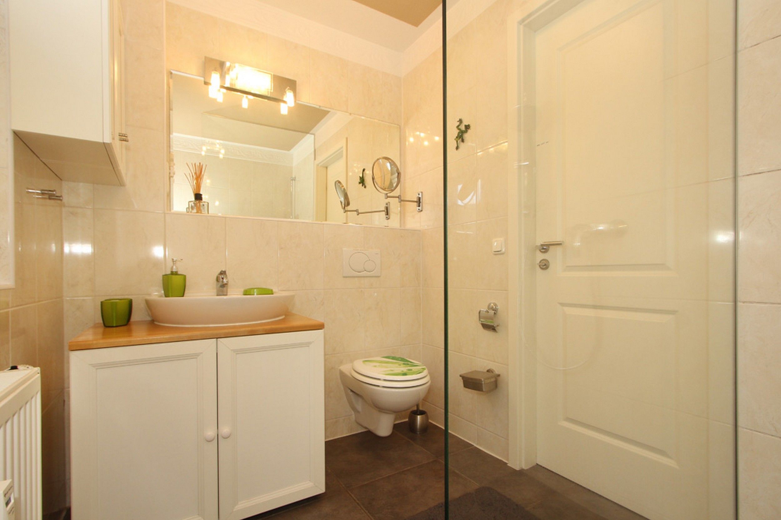 Das Badezimmer mit Fenster ist mit einer bodenebenen Dusche (ca. 1cm Höhe) und einem WC ausgestattet. Zusätzlich gibt es ein separates Gäste-WC.