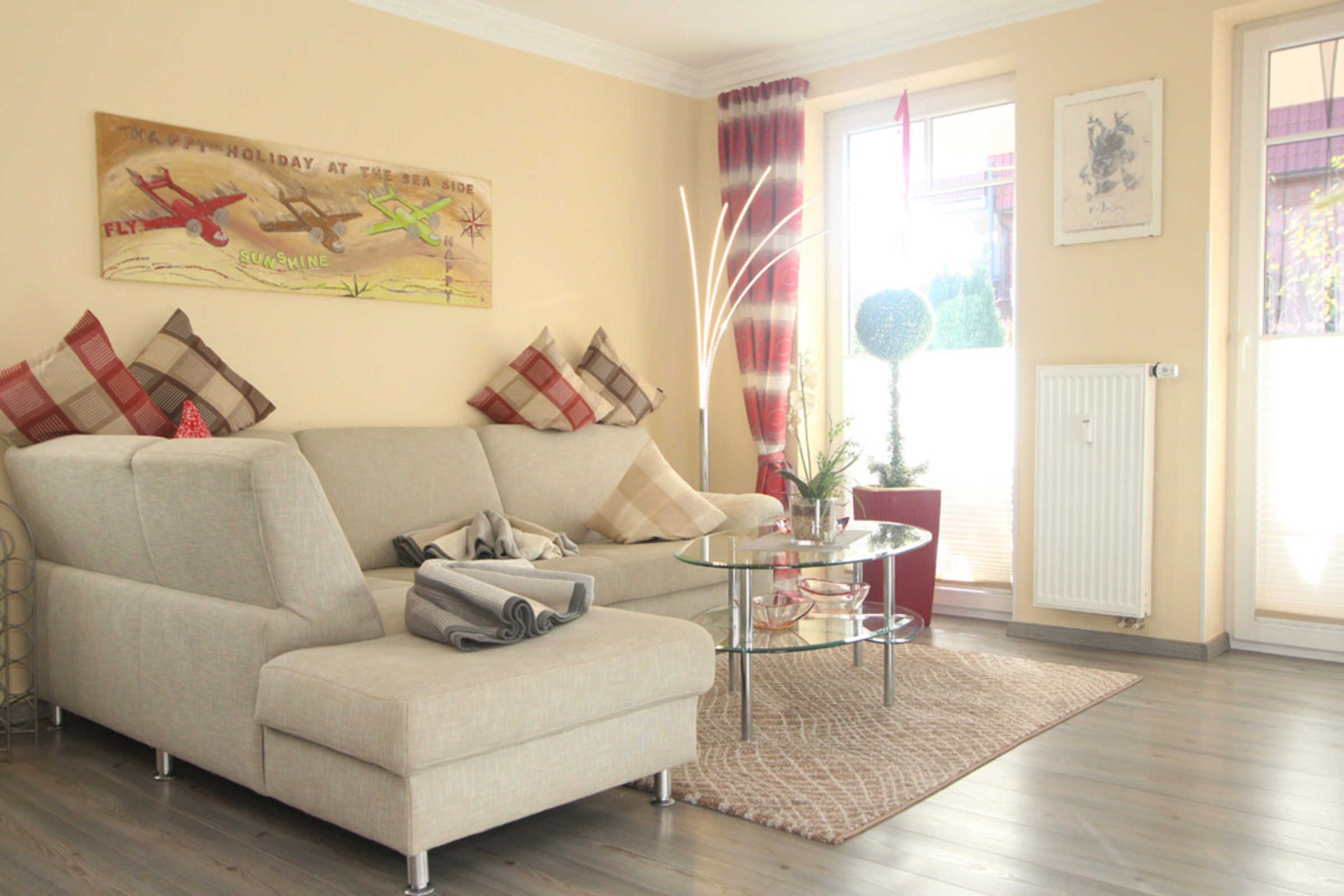 Der Wohnbereich verfügt über eine bequeme Sofalandschaft. Flatscreen-TV, DVD-Player/ BlueRay sowie eine größere Auswahl an CDs schaffen die Voraussetzungen für entspannende Urlaubsabende nach ereignisreichen Tagen an der Ostsee. Hier kann bei Bedarf auch ein Kinderreisebett aufgestellt werden.