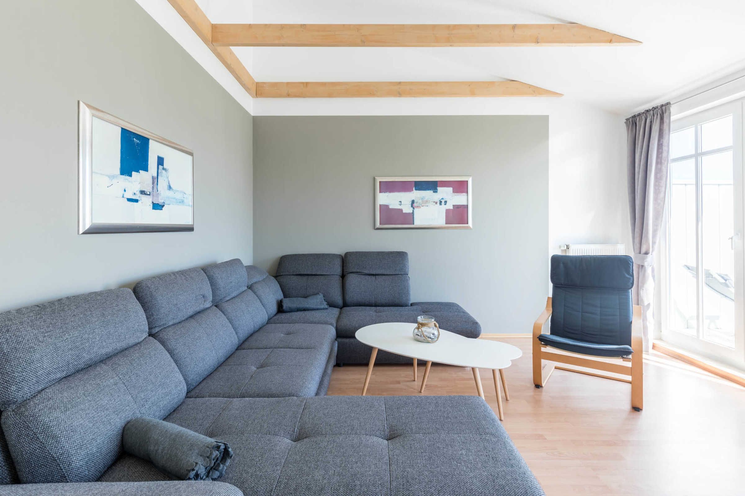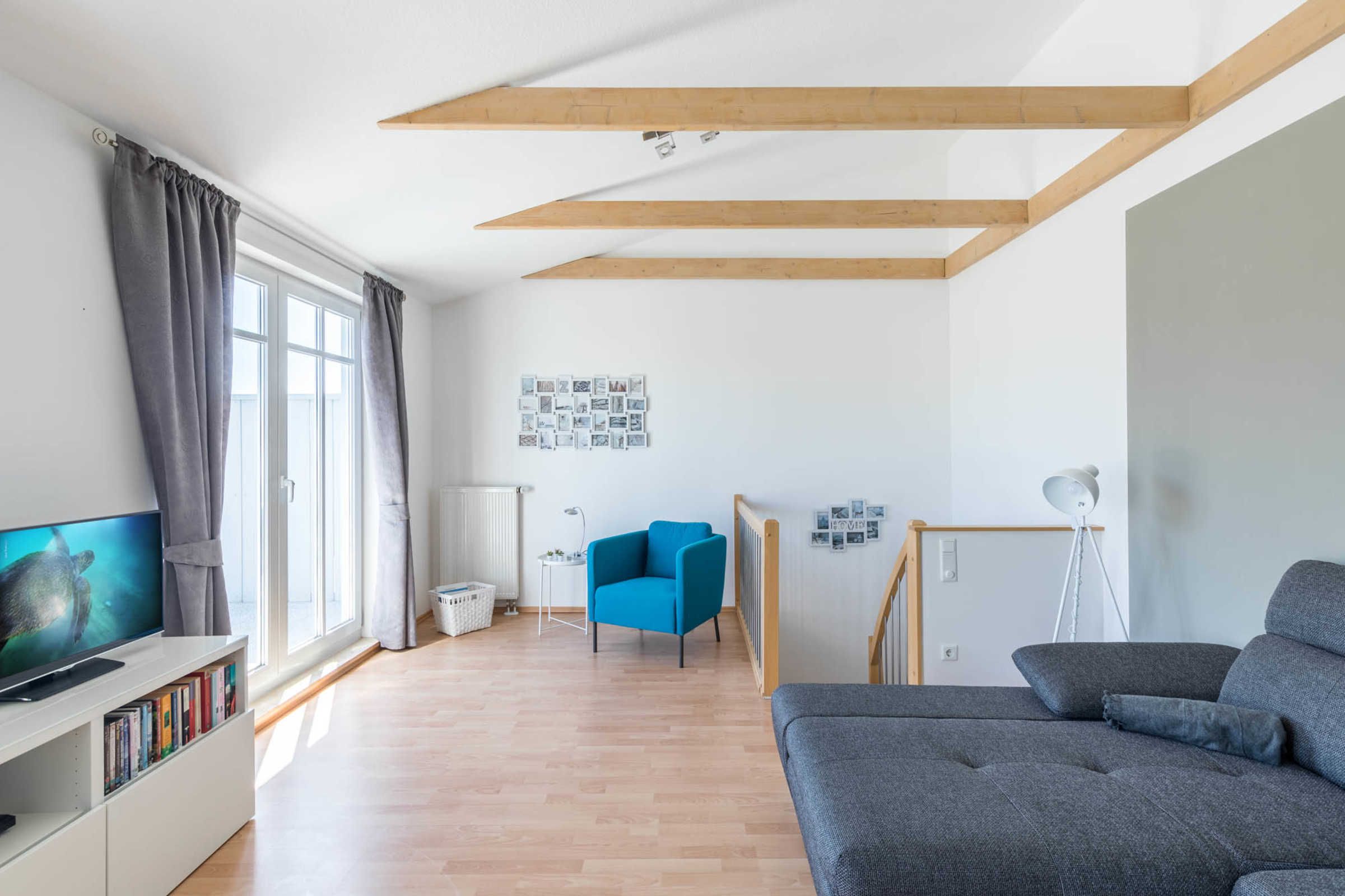 Auf der zweiten Ebene finden Sie die geschmackvoll eingerichtete, offene Galerie als Wohnbereich mit SAT-TV inklusive Doppel-Schlafcouch zum Entspannen.