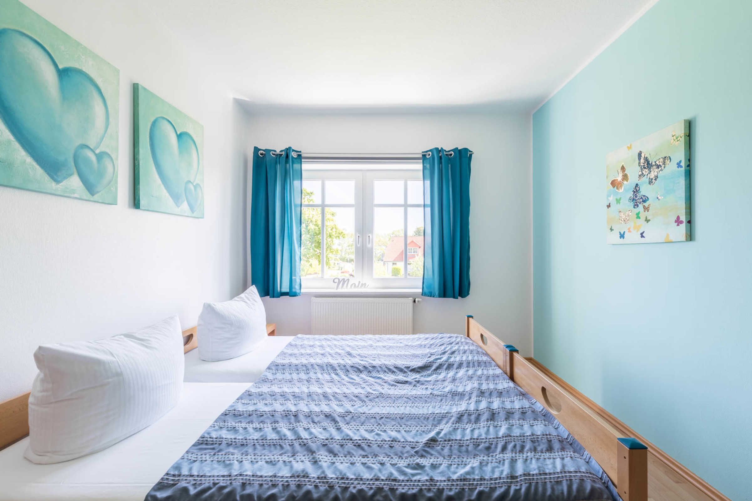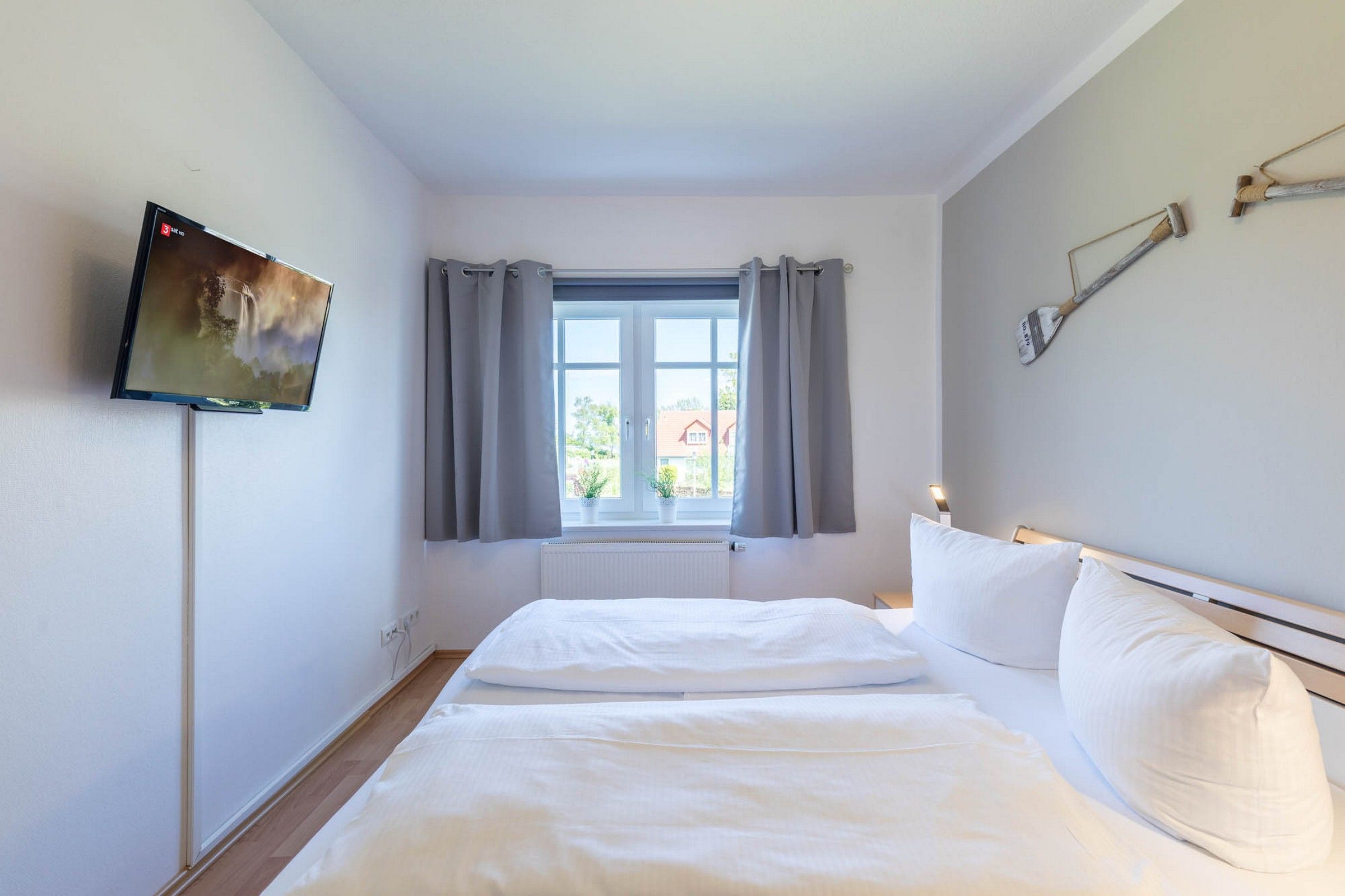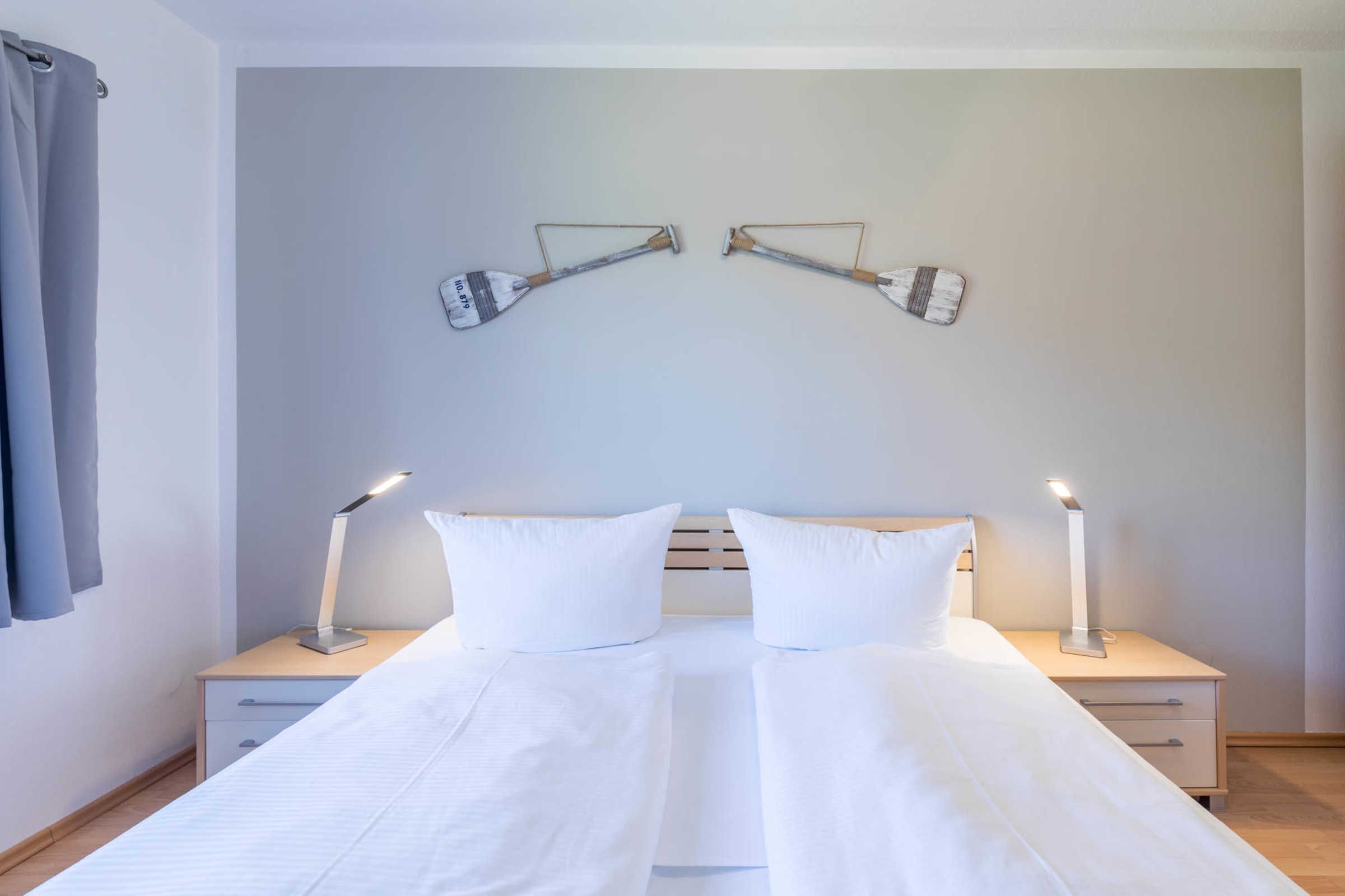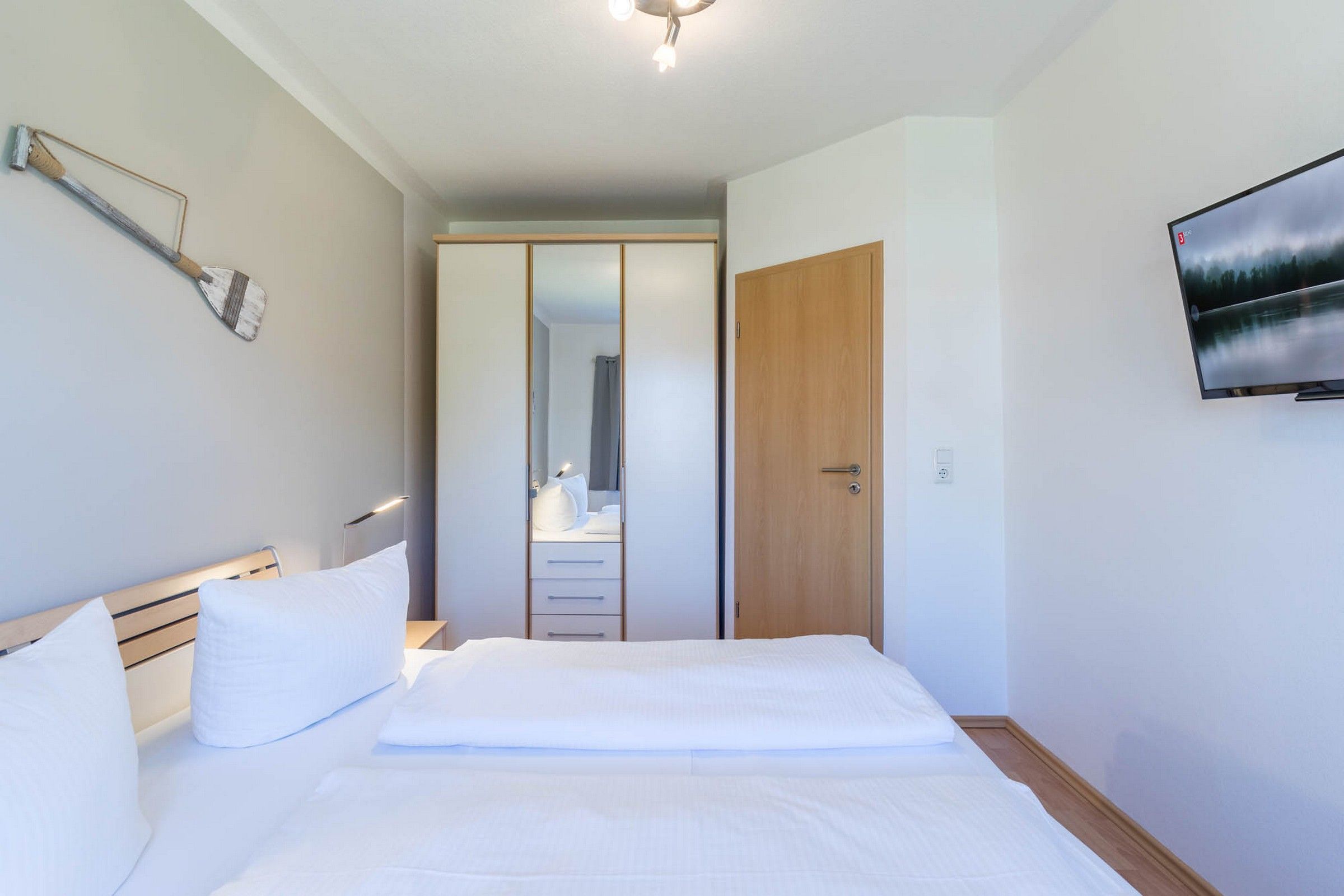Ein Schlafzimmer ist mit einem komfortablen Doppelbett, Kleiderschrank sowie einem SAT-TV, das zweite ist mit zwei direkt zusammenstehenden Einzelbetten und einem weiteren Kleiderschrank ausgestattet. Hier können Sie entweder ein Kinderreisebettchen bei Bedarf aufstellen oder ein weiteres Bett unten ausziehen.