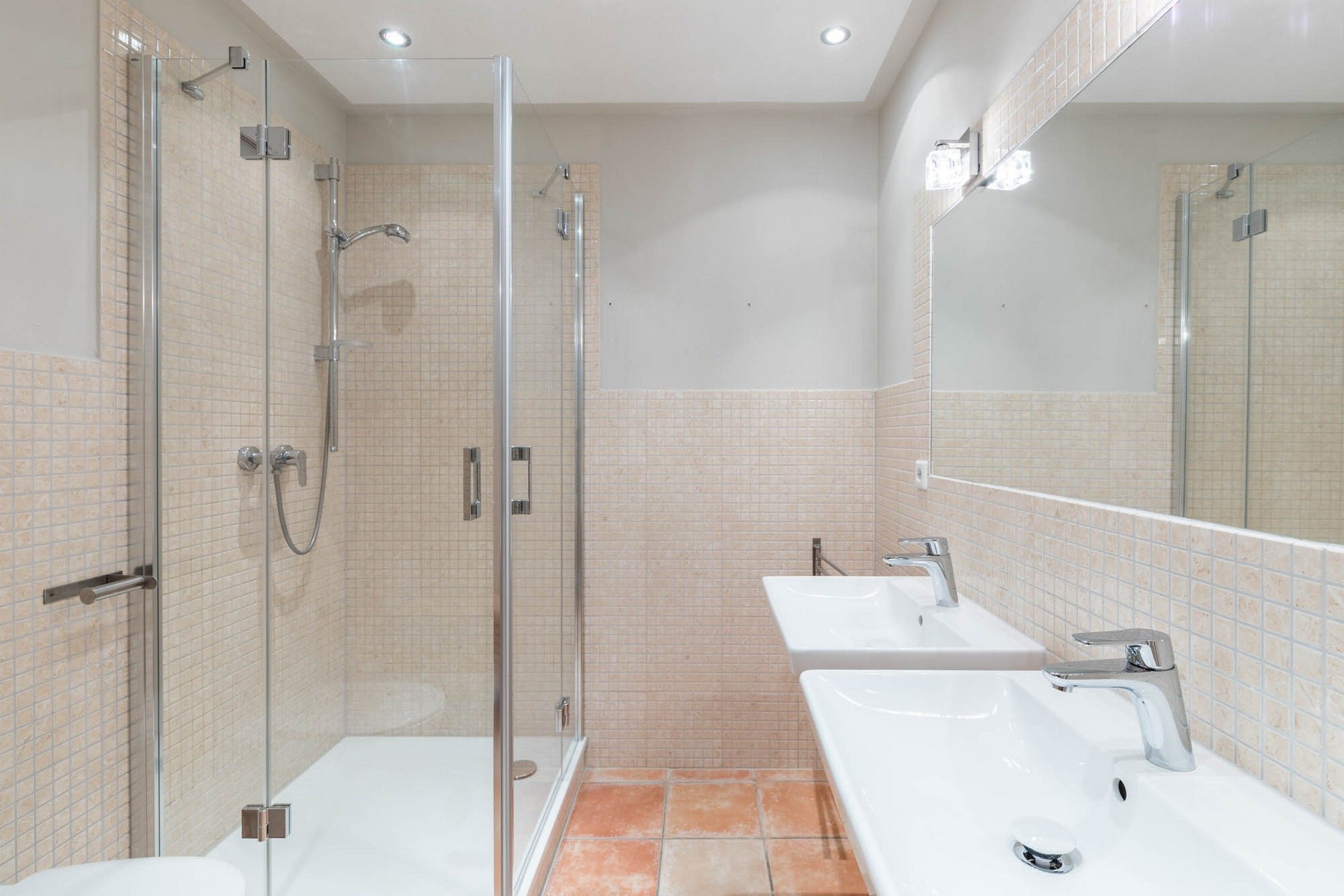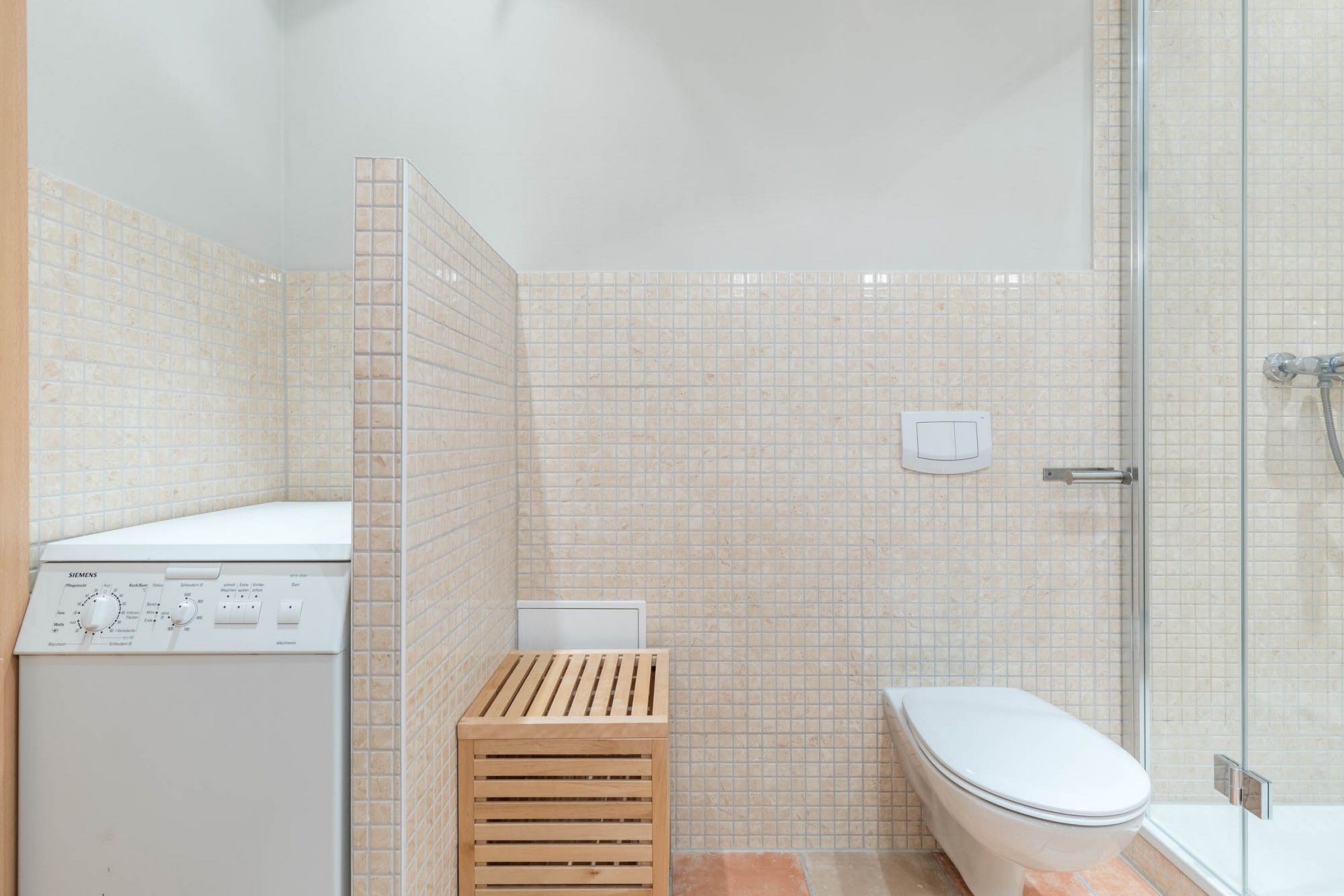 Im gepflegten Duschbad mit WC stehen zwei Waschbecken und eine Waschmaschine zur Verfügung.