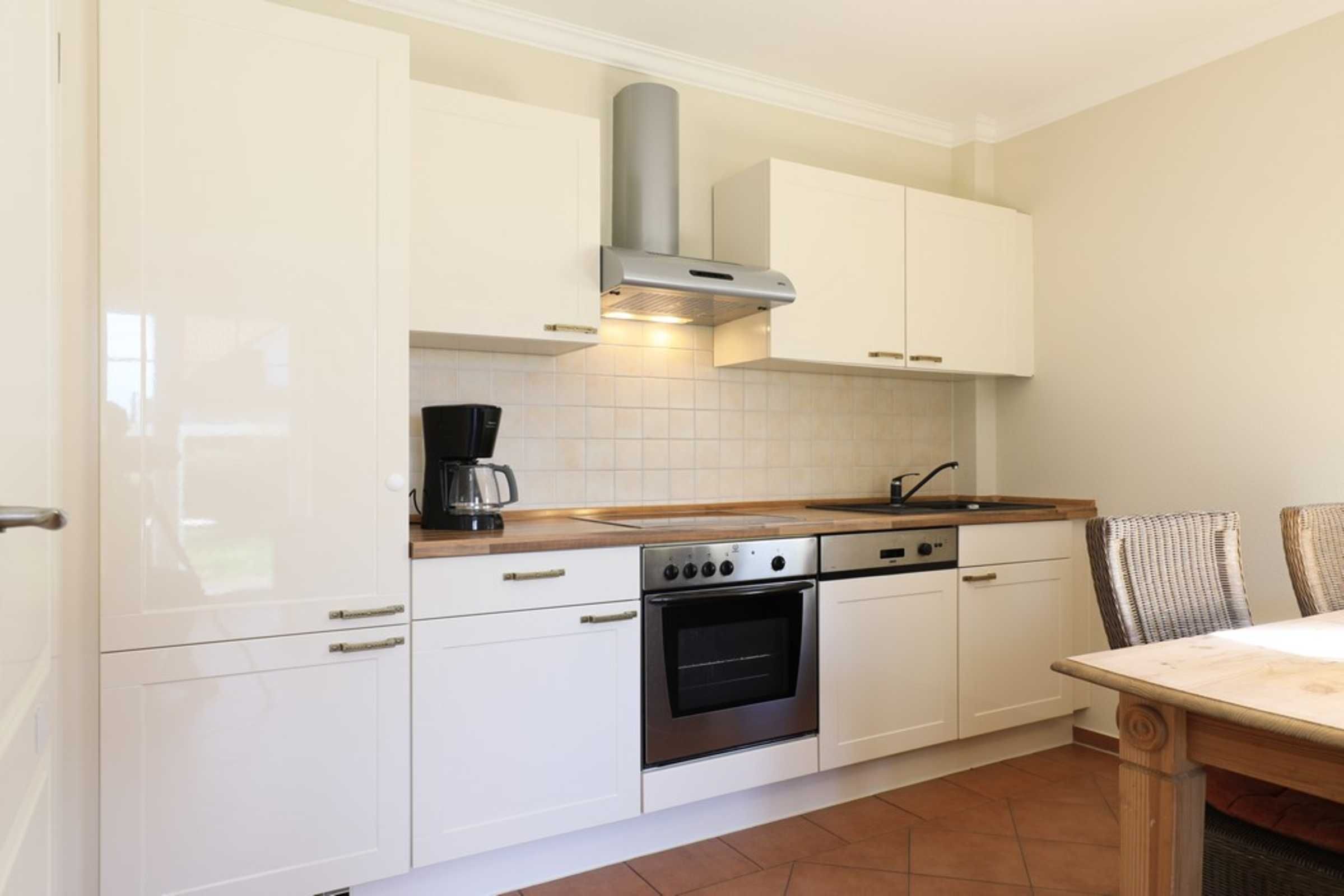 In der Küche mit angeschlossener Essecke erwartet Sie eine Küchenzeile mit Herd und Backofen, einen Kühlschrank mit Gefrierfach, Spülmaschine uvm.