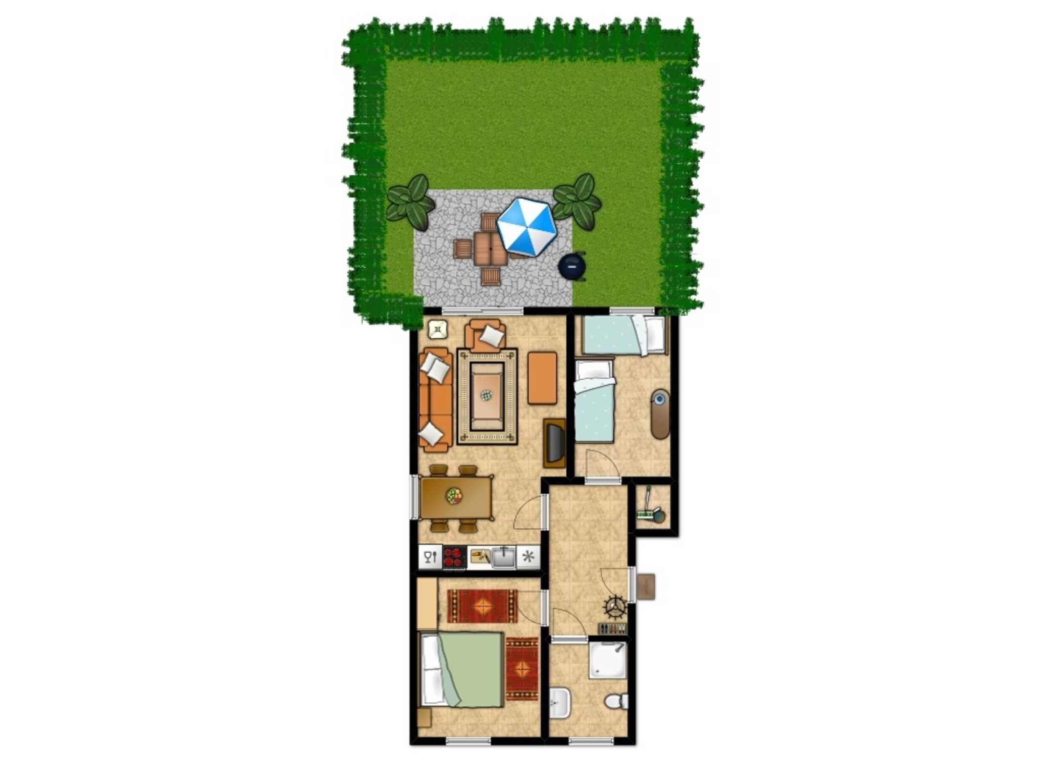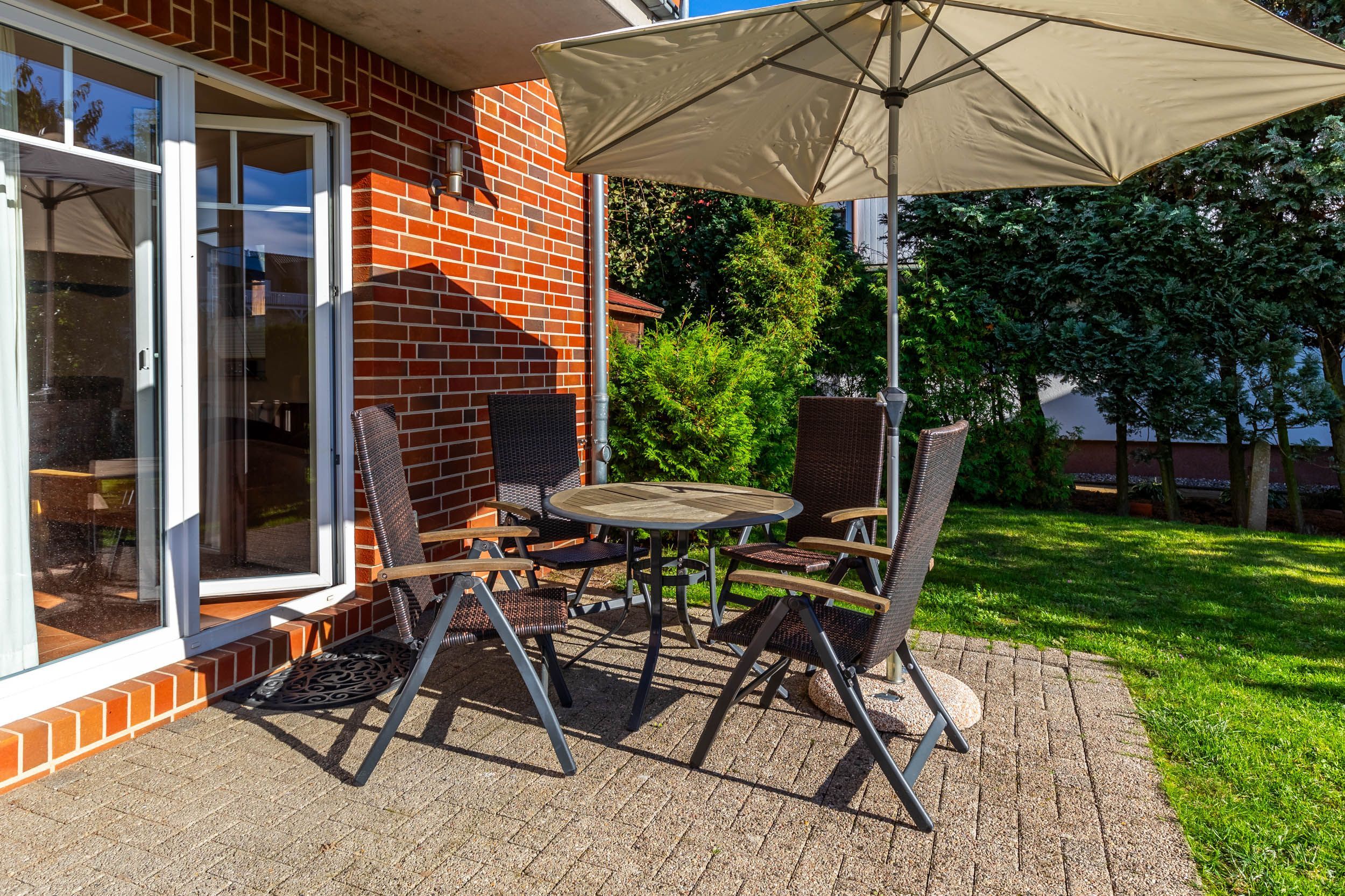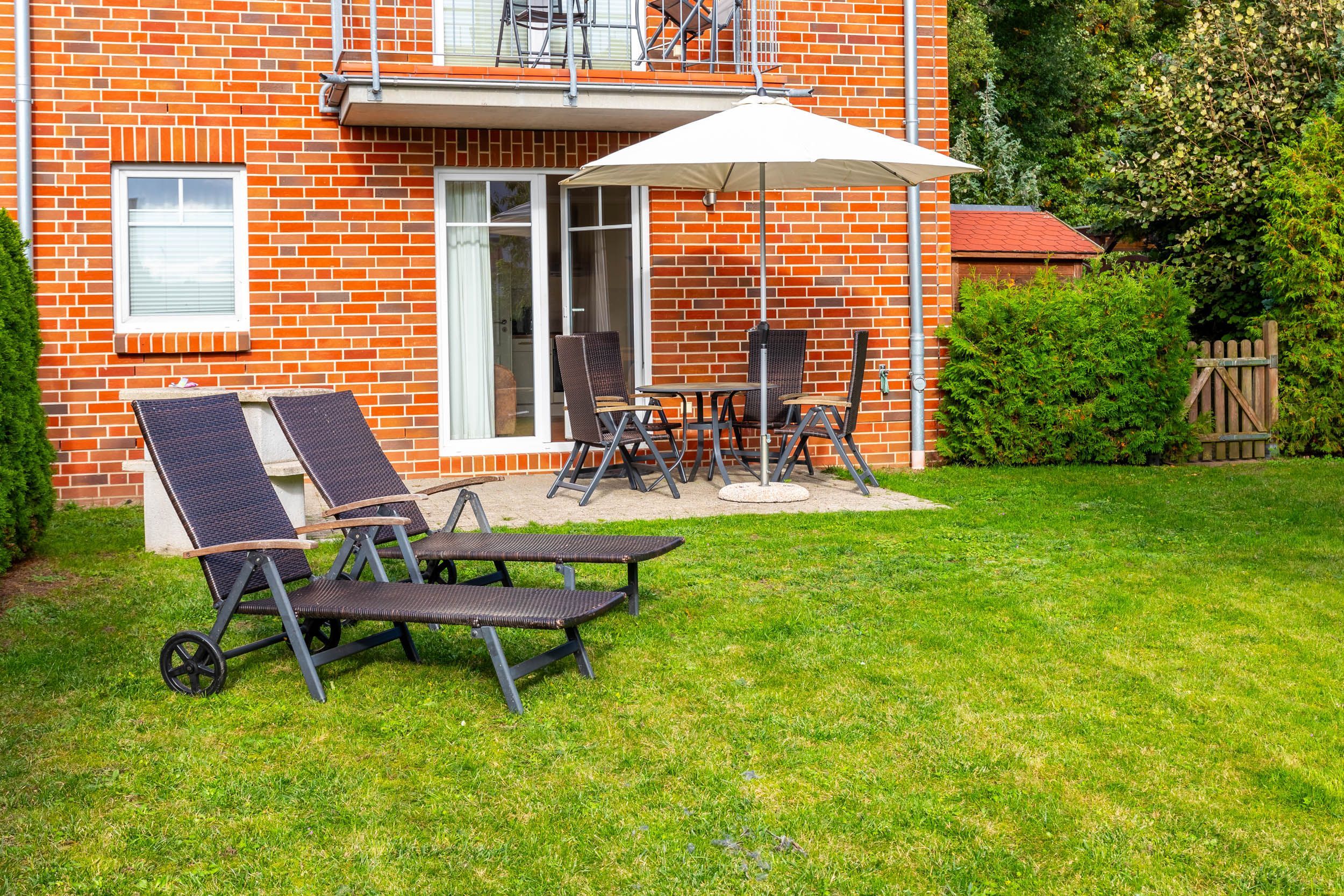 Die Wohnung verfügt weiterhin über eine möblierte Südterrasse sowie über ein eigenes Gartengrundstück mit Grill, Sonnenschirm und Sonnenliegen.