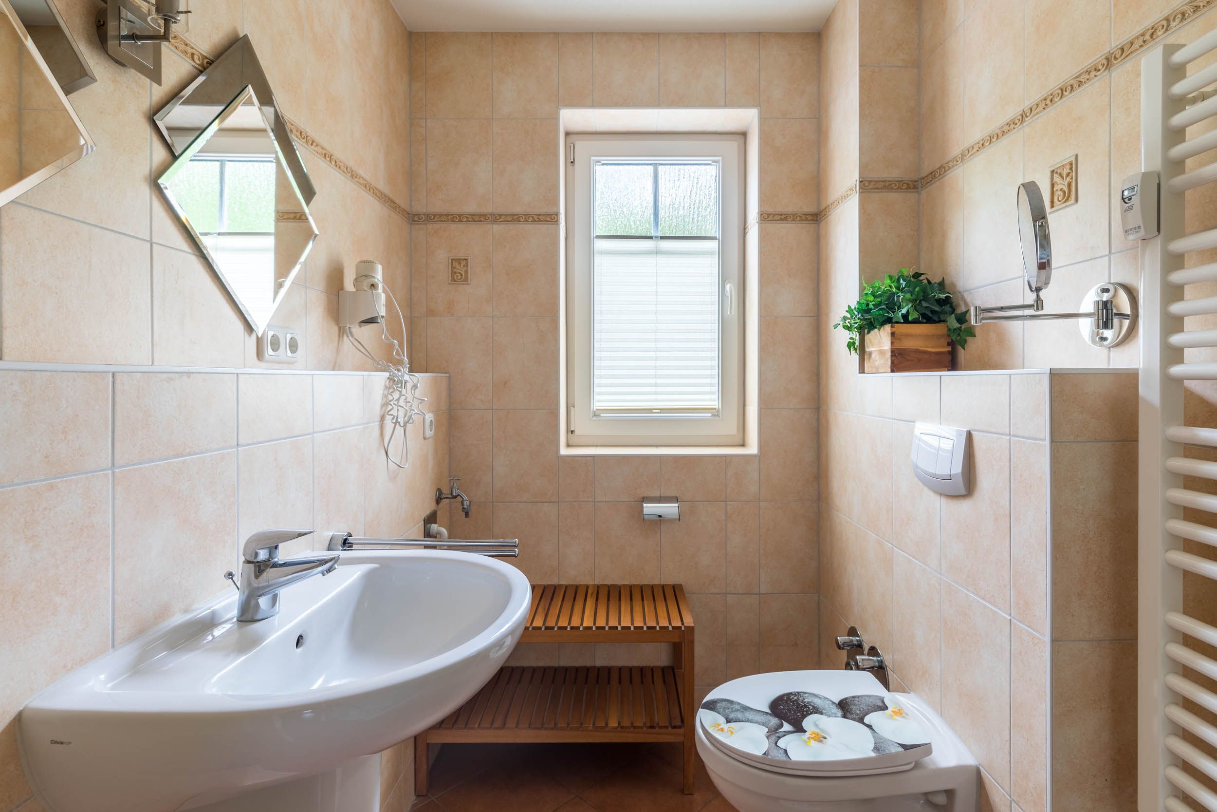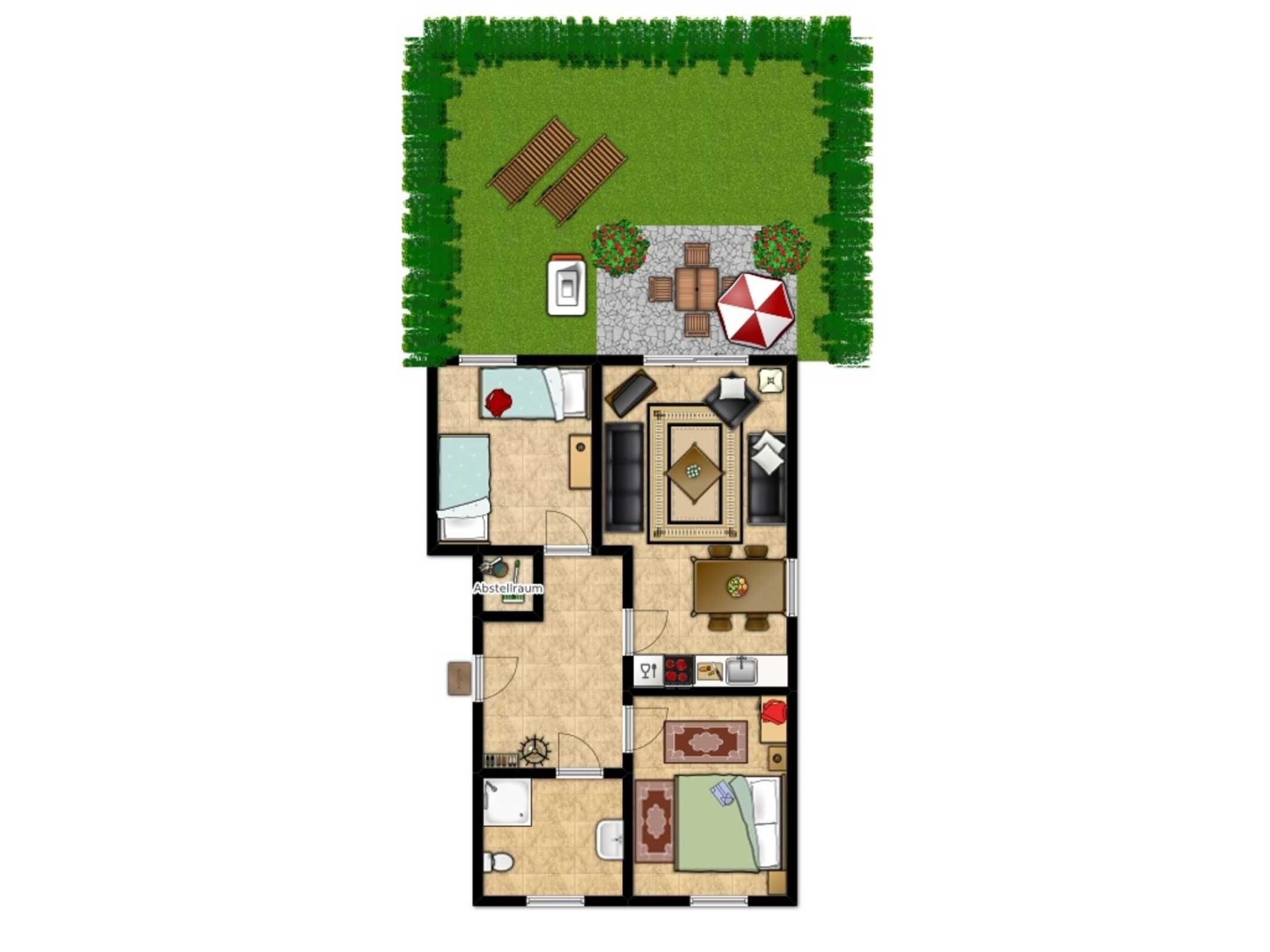 Das Grundstück ist von grüner Hecke (kein Zaun!) umgeben und bietet dadurch mehr Sichtschutz. Die helle Ferienwohnung ist gefliest und mit Fußbodenheizung ausgestattet.