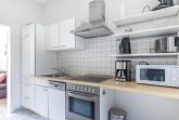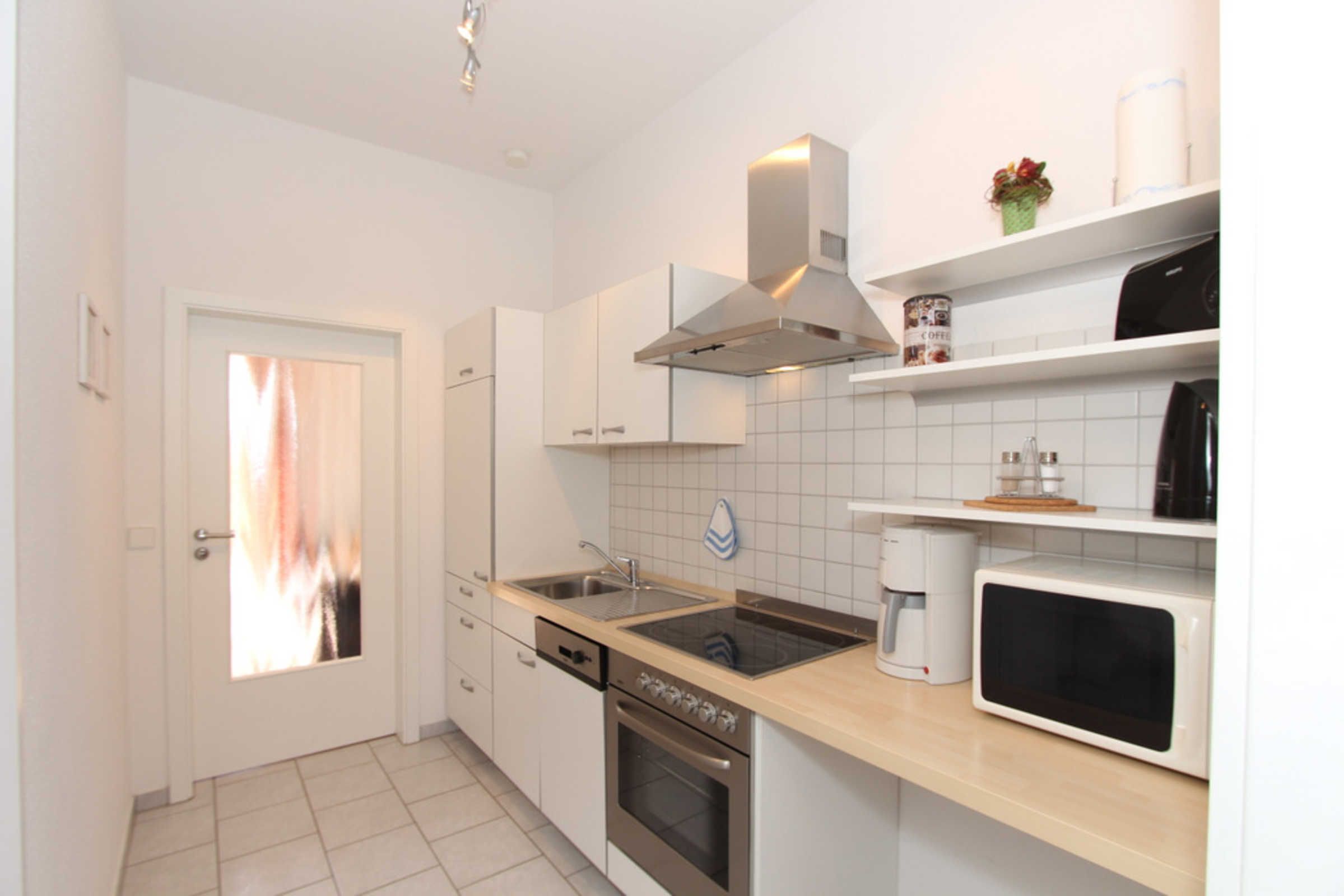In der offen gestalteten Küchenzeile gibt es neben einem Herd mit Backofen einen Kühlschrank mit Gefrierfach, eine Spülmaschine, eine Mikrowelle, einen Toaster, einen Wasserkocher und Kaffeemaschine (1x Filter, 1x Pad).