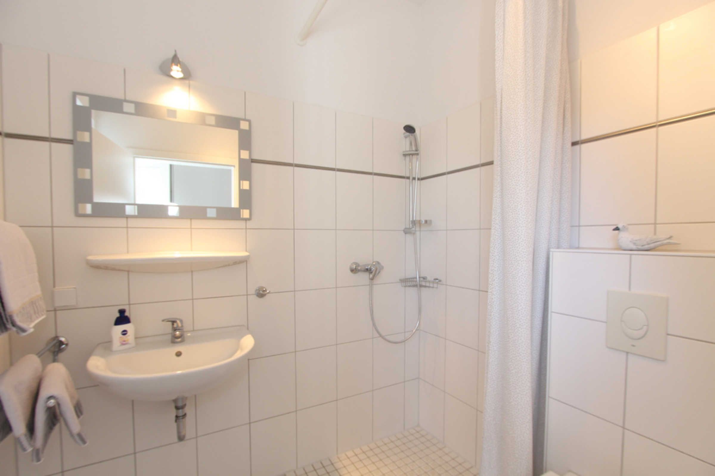 Das hell geflieste Bad mit Fenster bietet eine barrierefreie Dusche (mit Vorhang) und WC.
