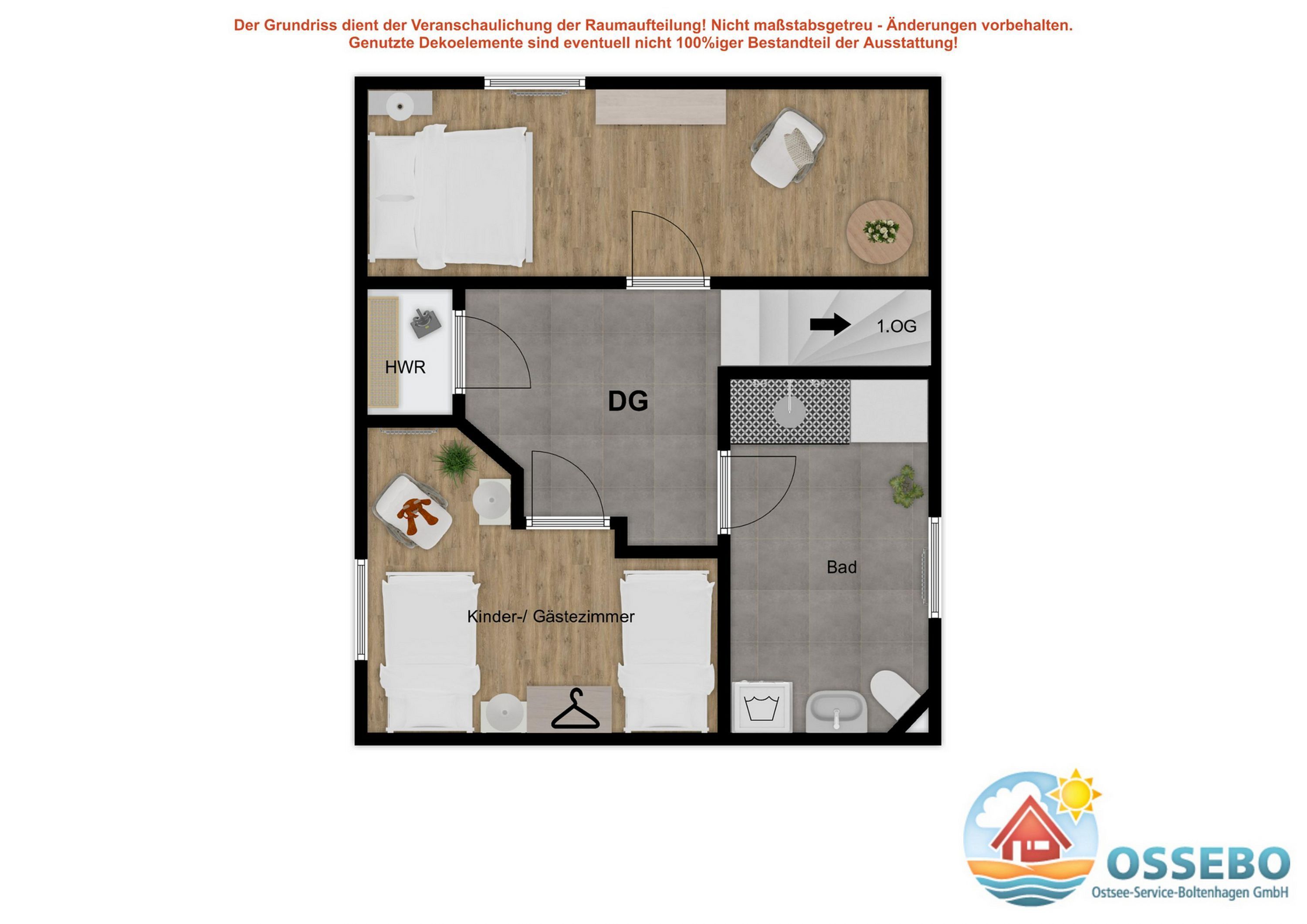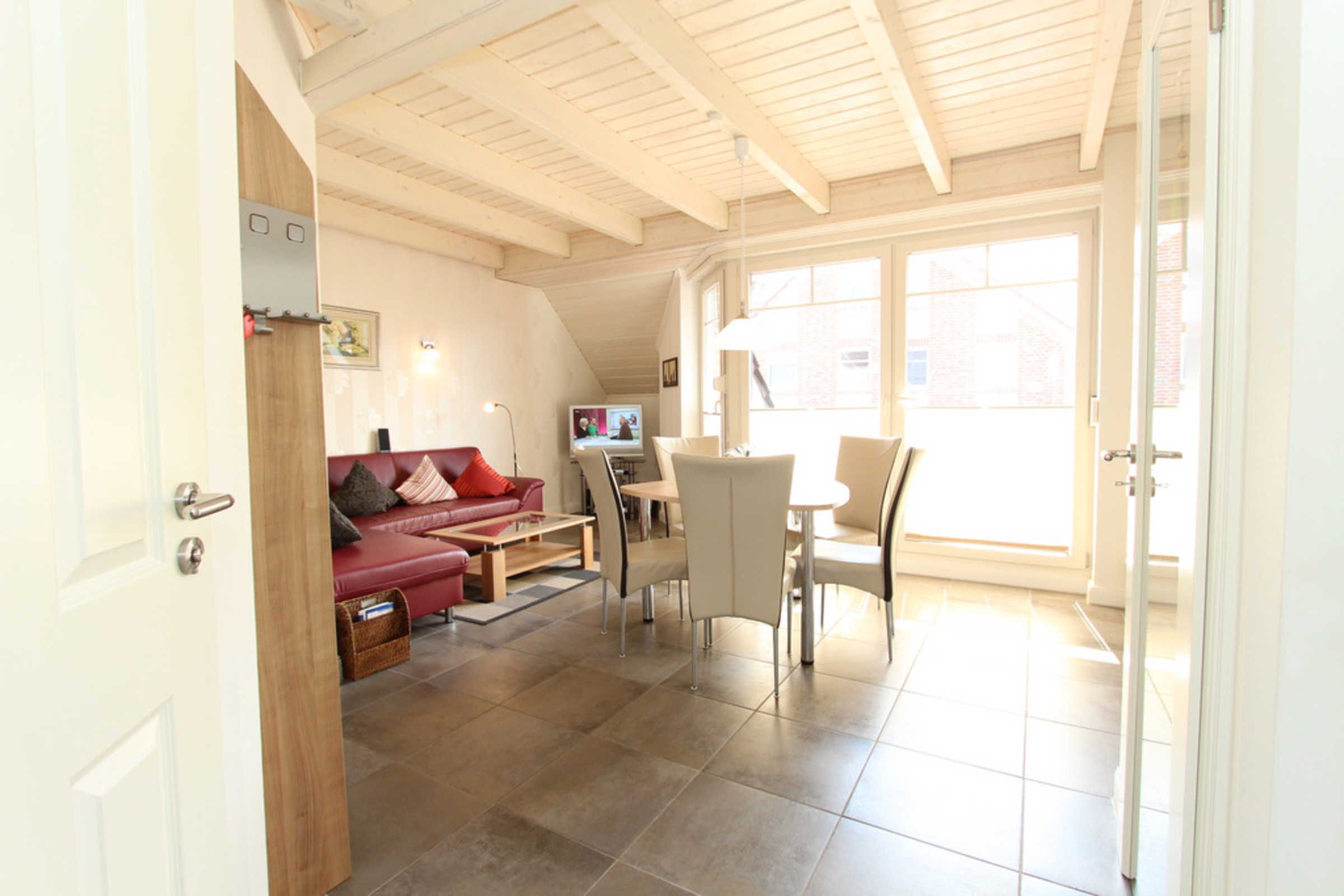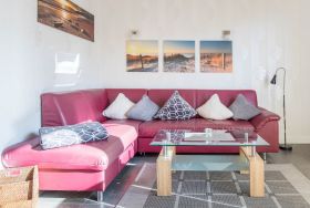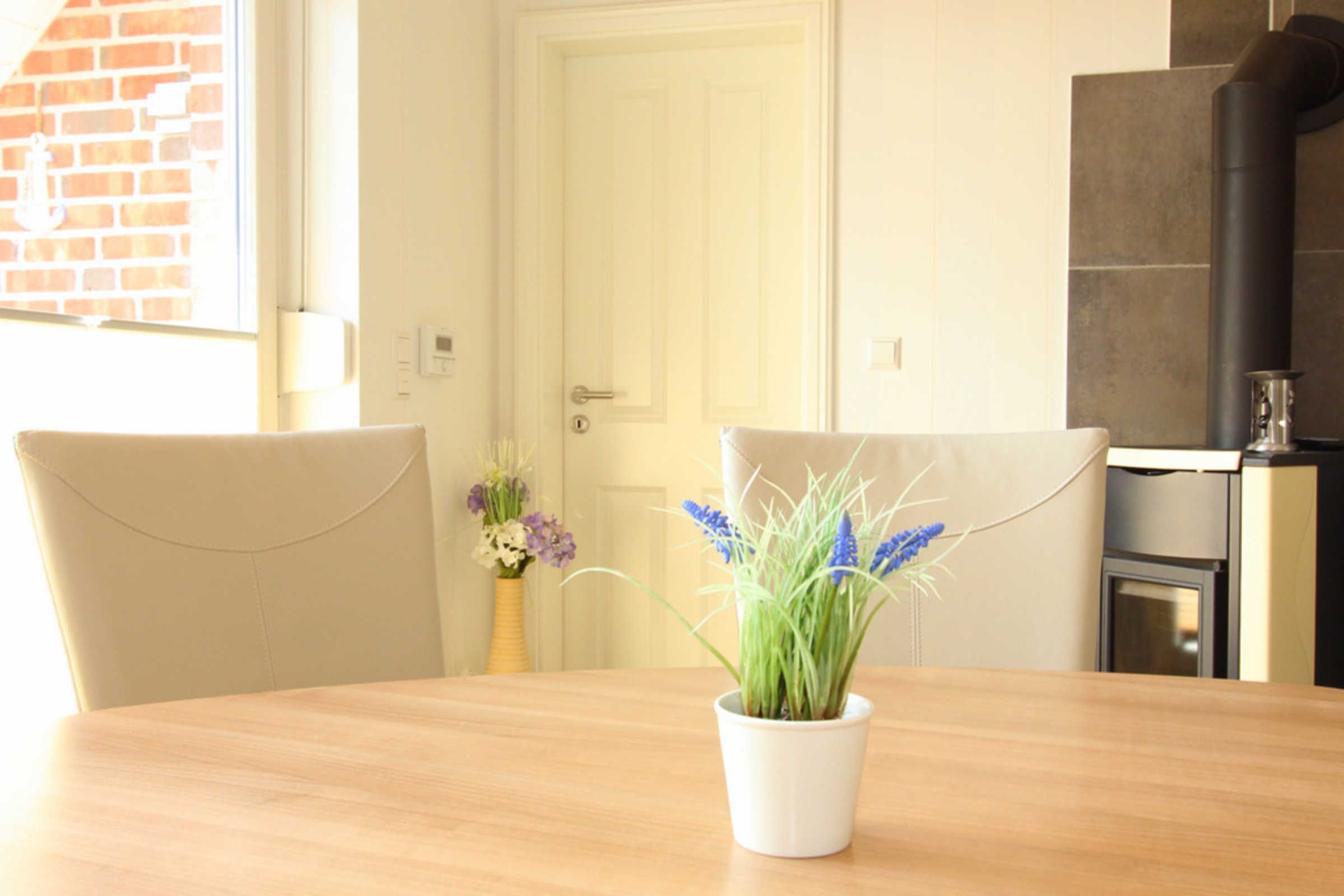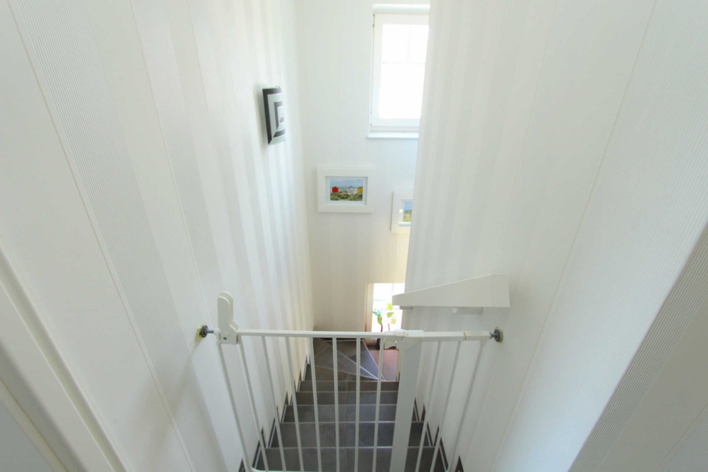 In dieser Nichtraucher-Wohnung steht für unsere kleinen Gäste bei Bedarf ein Reisebettchen (ohne Zubehör) mit passender Matratze kostenfrei zur Nutzung bereit, ein Hochstuhl für die Kleinen kann gern gegen Gebühr ausgeliehen werden. Ebenso kann an der Treppe ein Treppenschutzgitter angebracht werden (steht im Hauswirtschaftsraum bereit). Da sich die Wohnung allerdings im 1. Stock über zwei Wohnebenen befindet, muss mindestens eine Treppe überwunden werden. Wohnzimmer, Küche, die unteren Bäder sowie die beiden Schlafzimmer mit den Doppelbetten verfügen über Außenrollläden. Das Kinder-/ Gästezimmer mit den Einzelbetten bietet ein Rollo am Dachfenster.