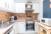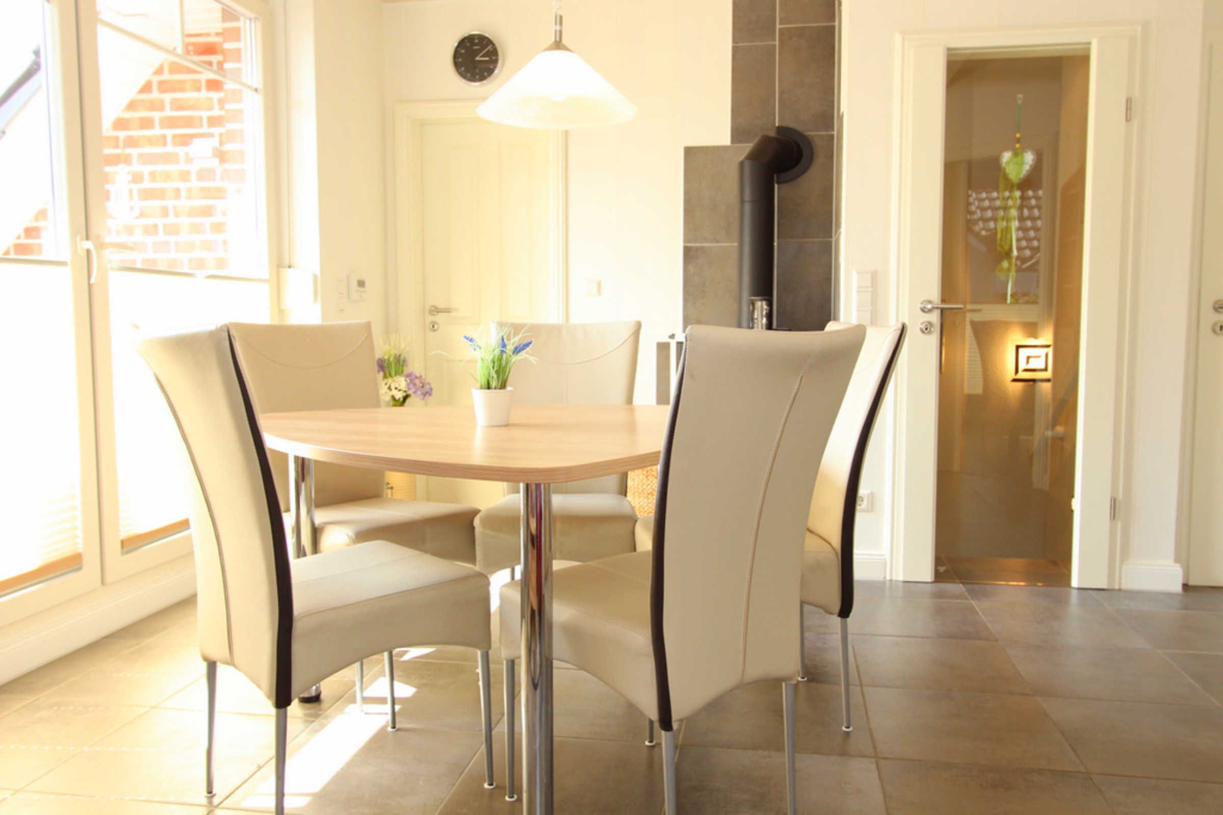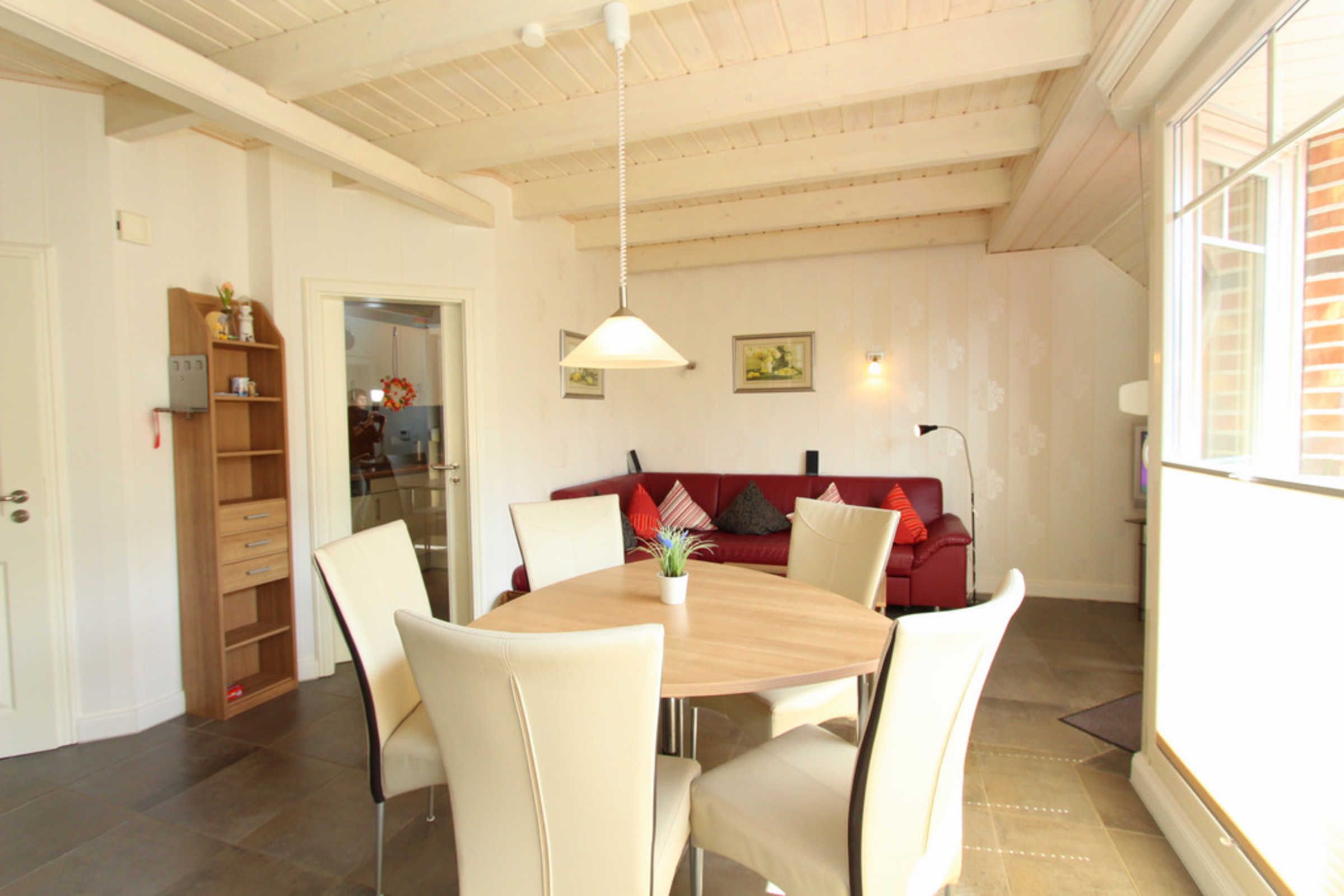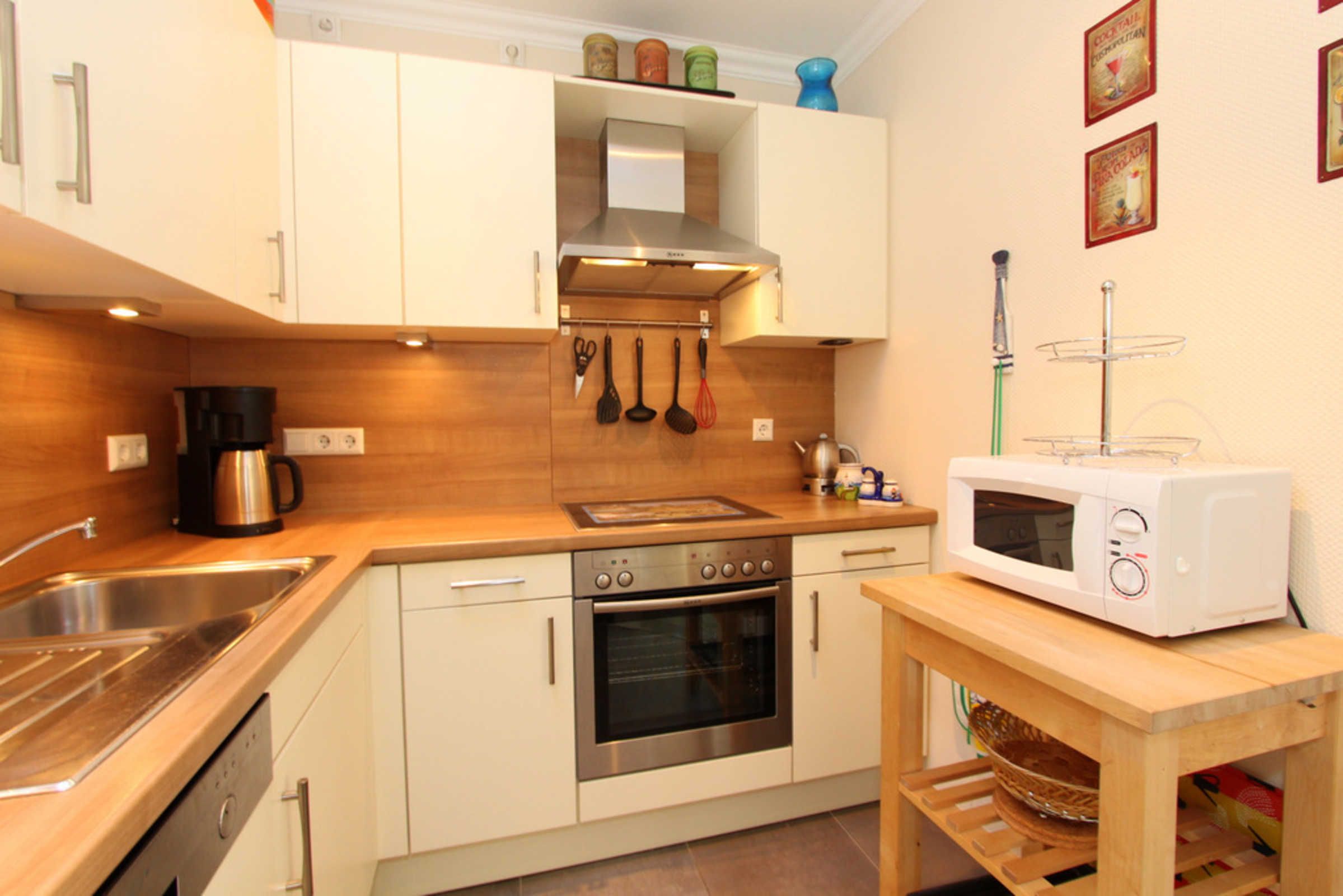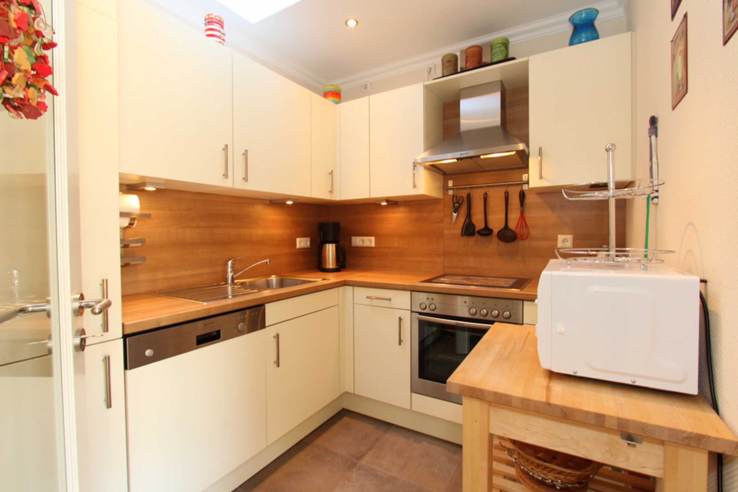 Die Küche ist separiert vom Wohnraum und ist mit allen nötigen Küchengeräten wie Herd, Mikrowelle, Kühlschrank mit Gefrierfach, Geschirrspüler und Gläser und Geschirr ausgestattet. An der separaten Essecke können Sie bequem zusammen Ihre Mahlzeiten einnehmen.