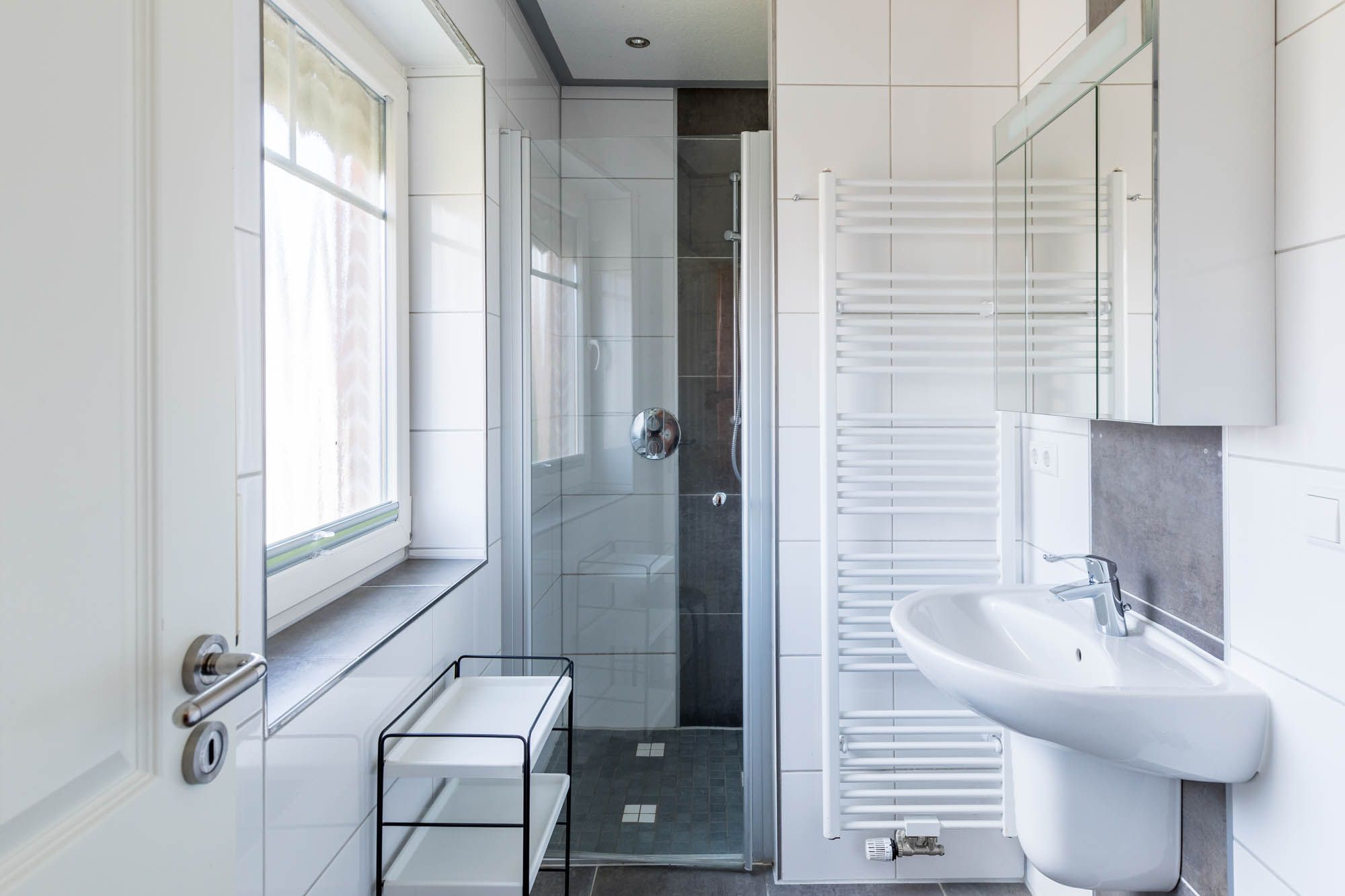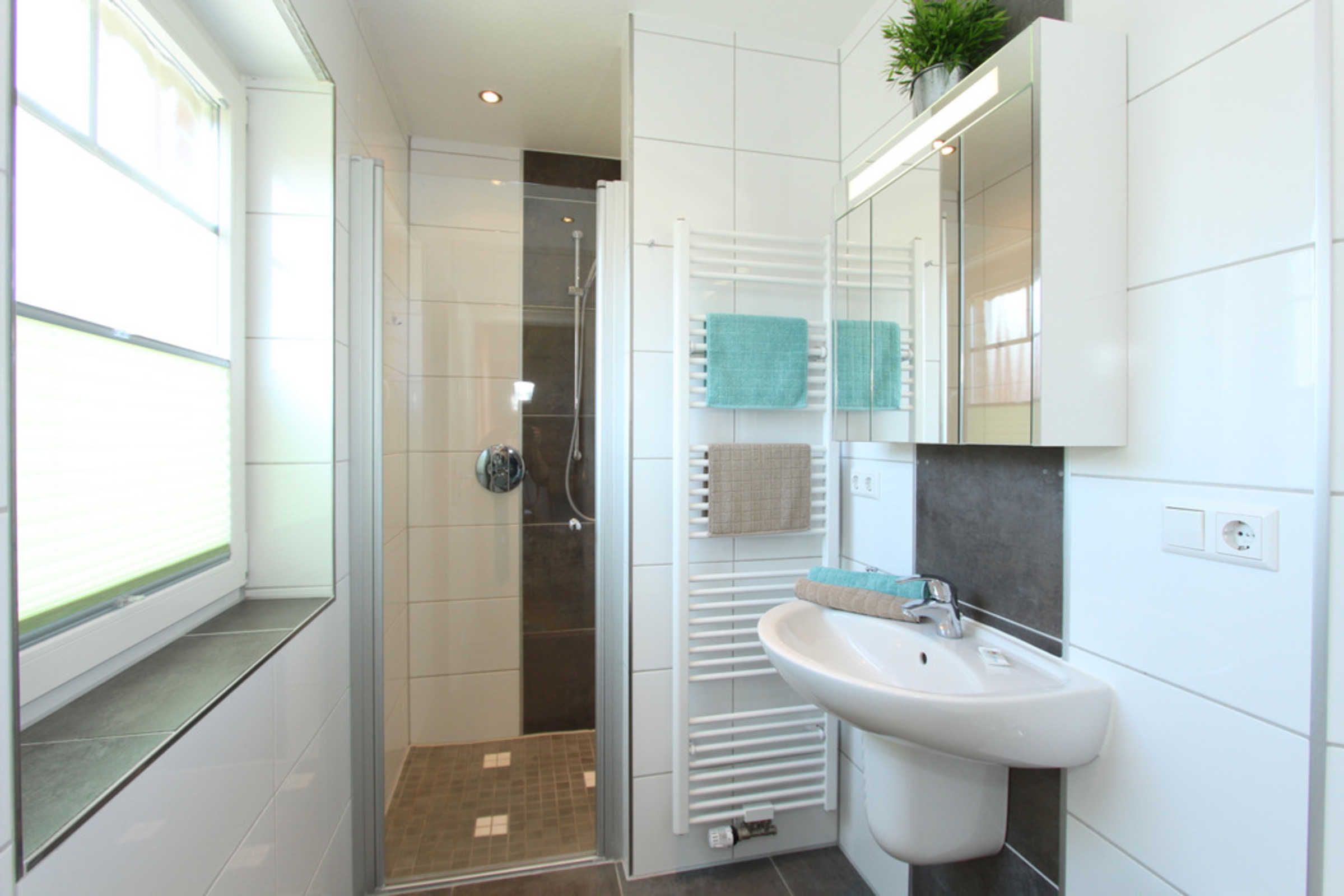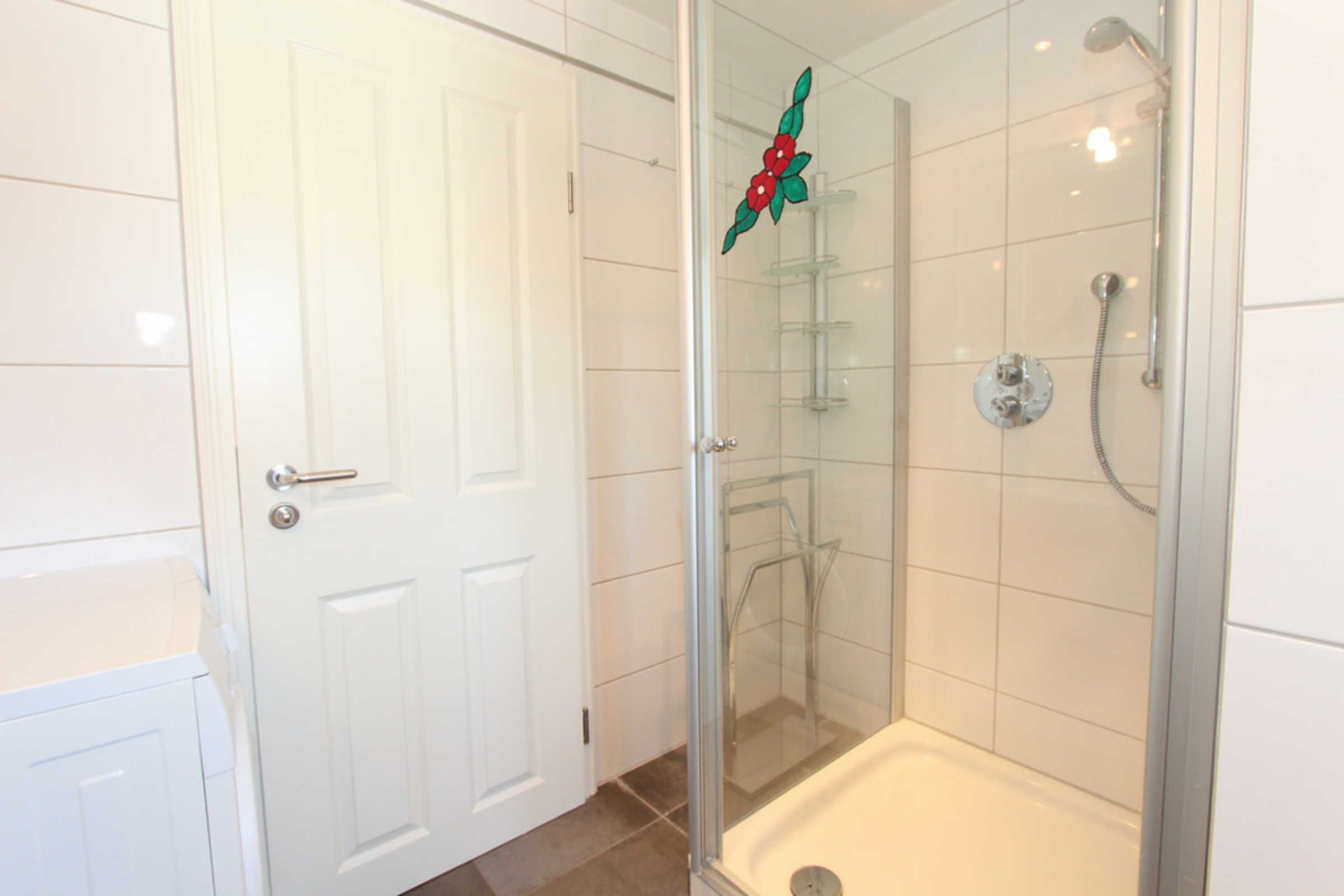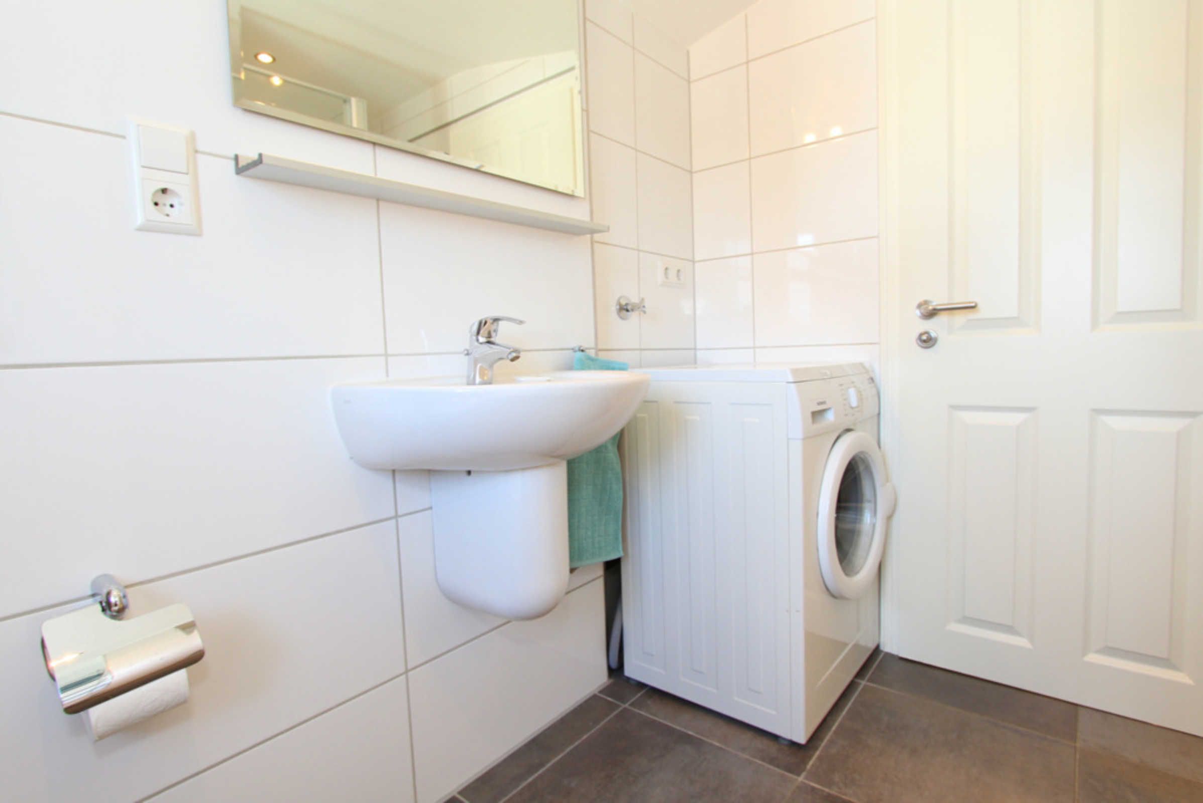 Weiterhin gibt es auf dieser Etage ein weiteres modernes Badezimmer mit Dusche, WC und Fenster. Eine Waschmaschine steht hier zur kostenfreien Nutzung bereit.