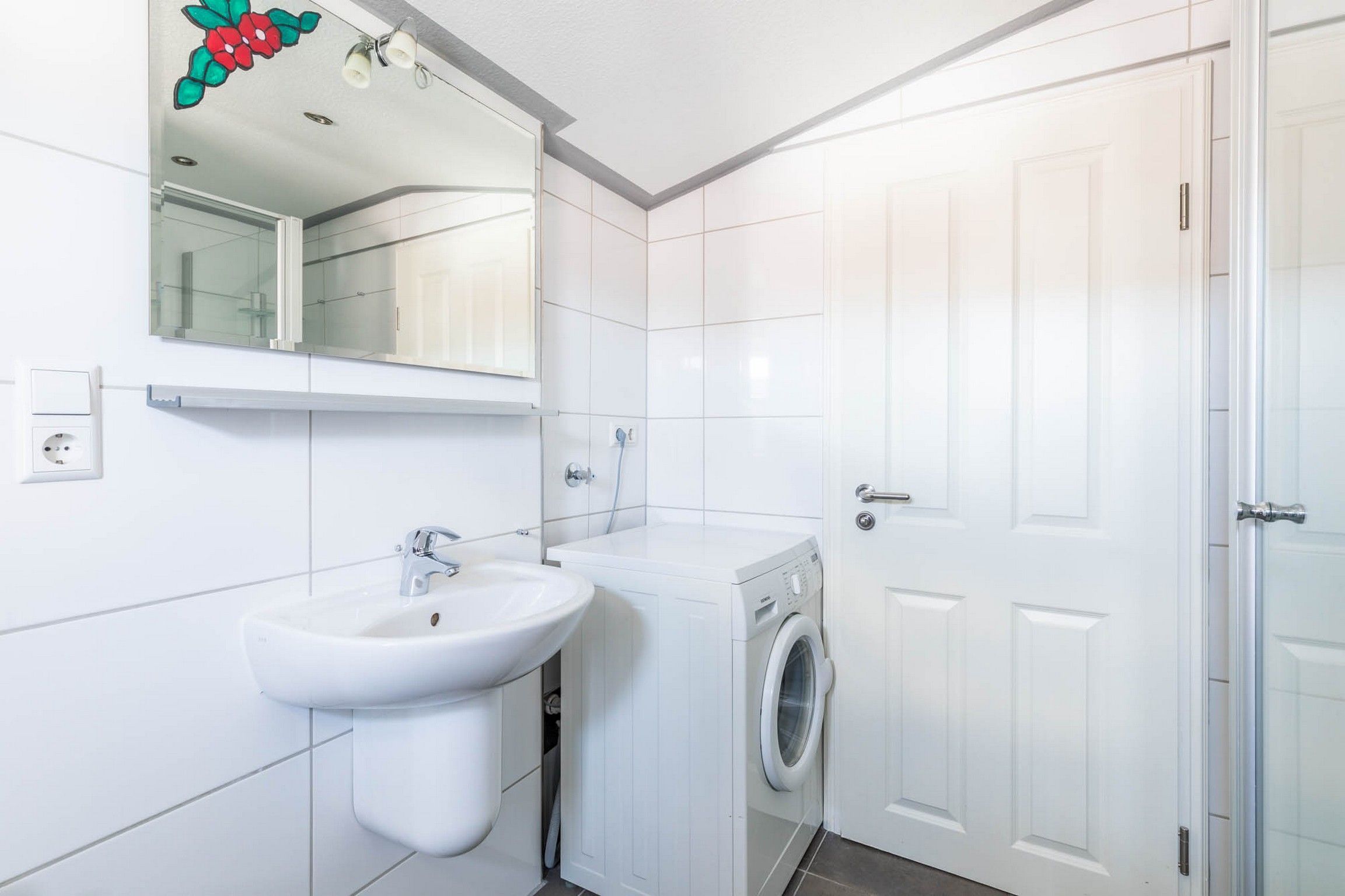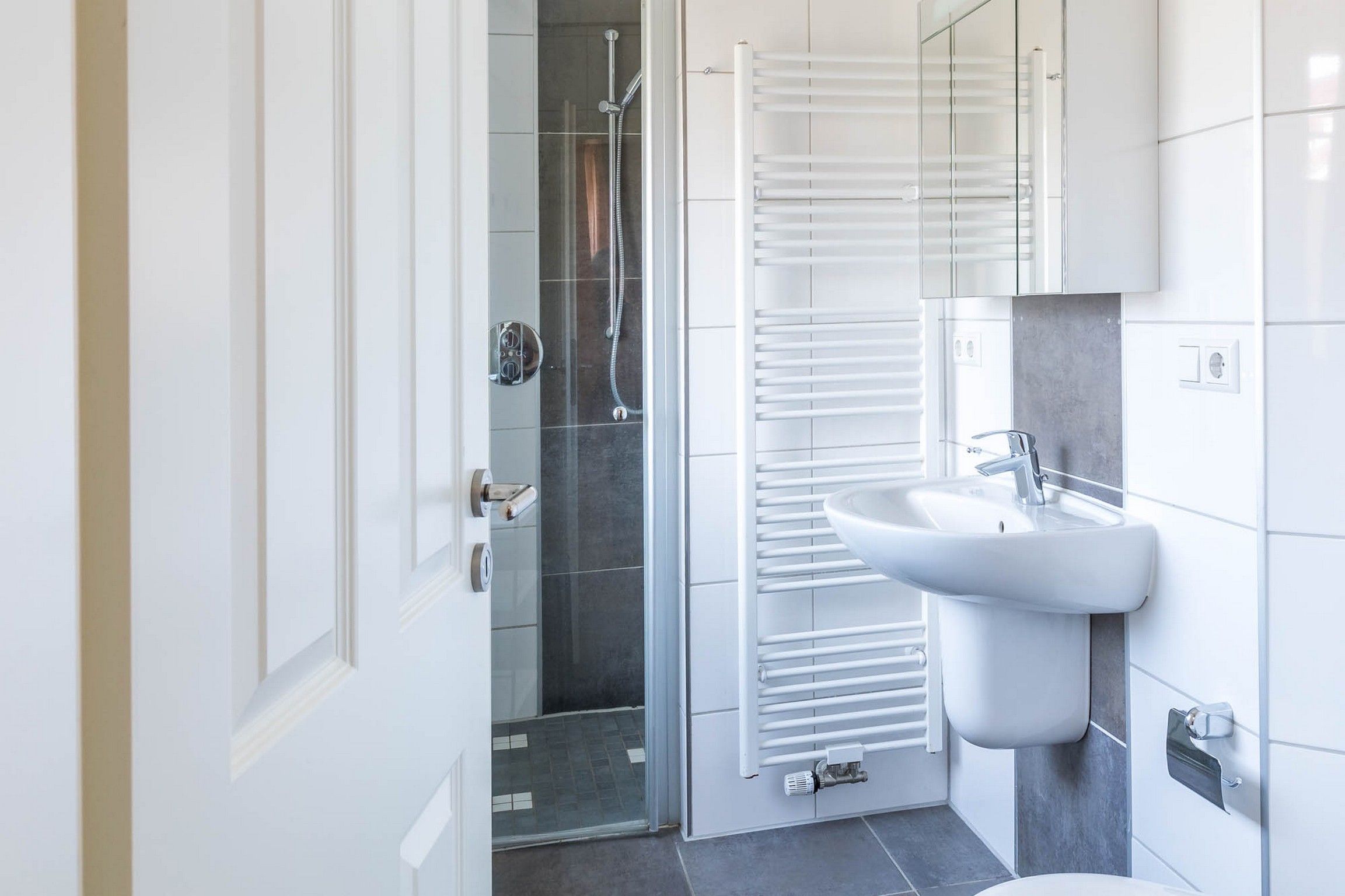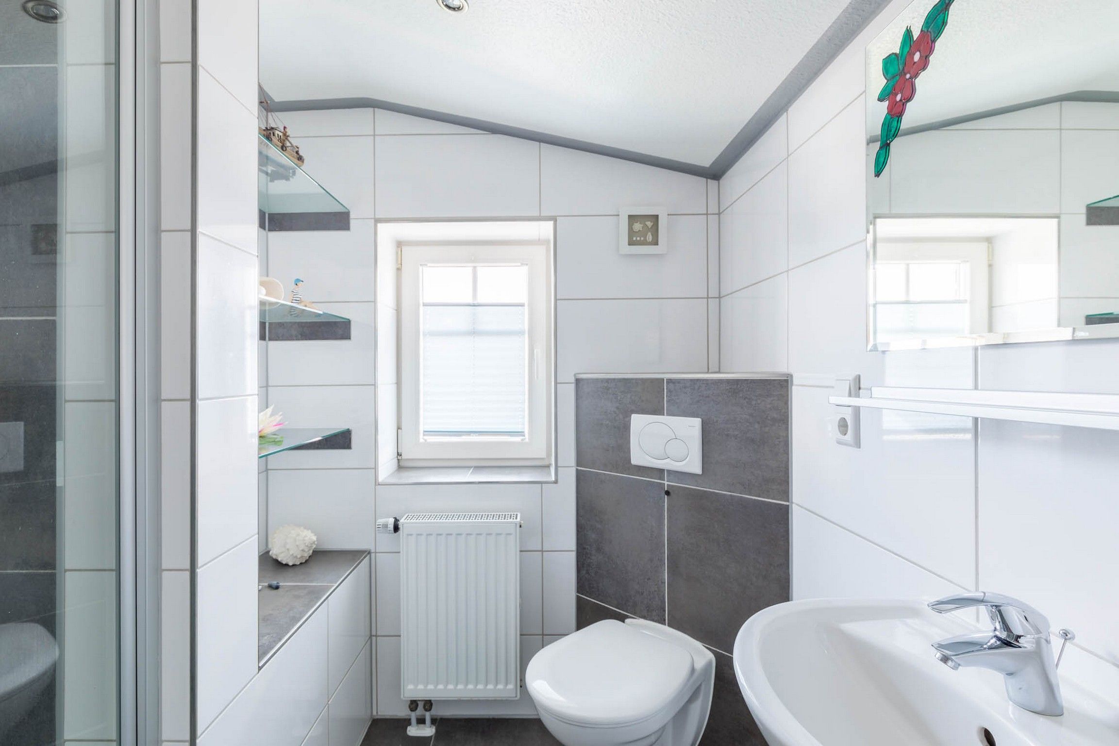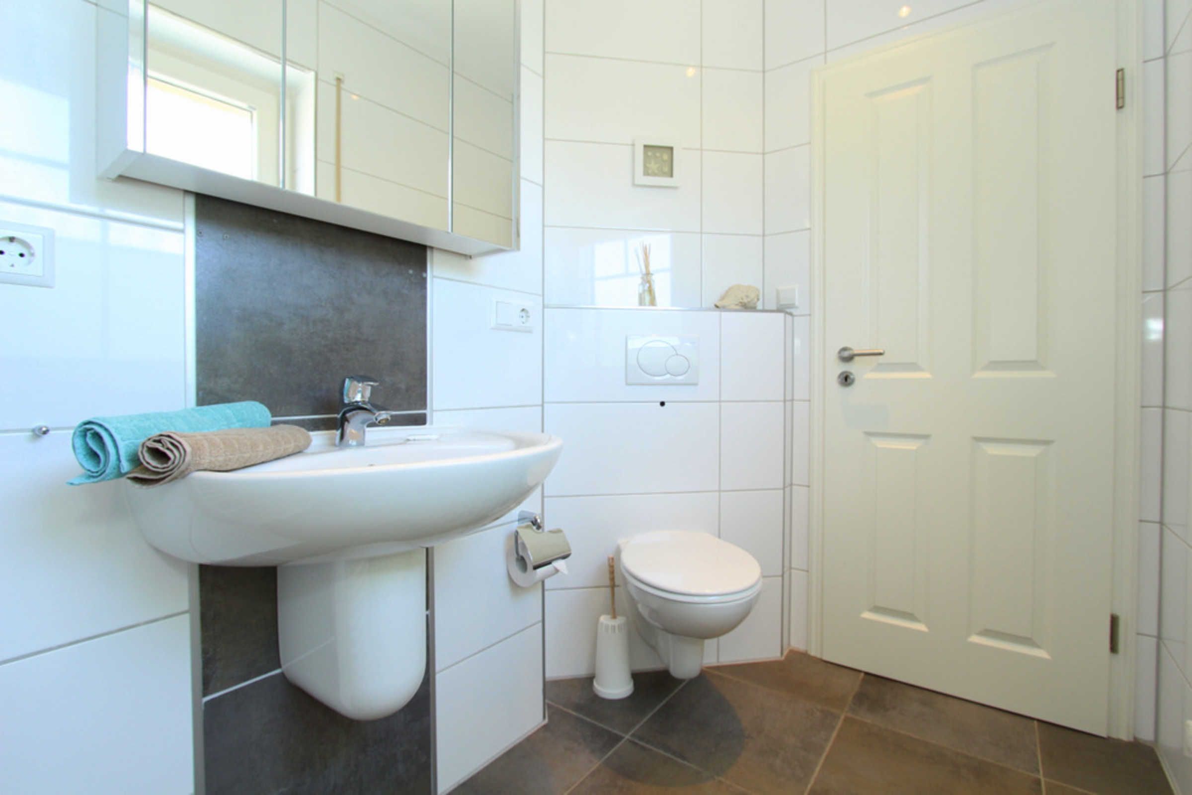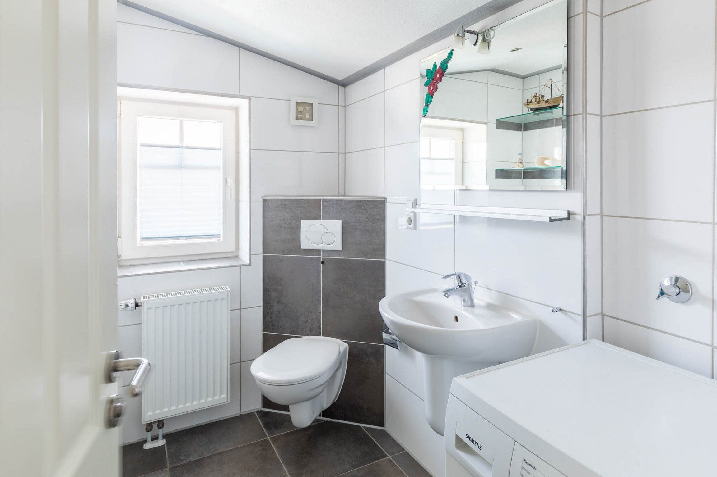 Weiterhin gibt es auf dieser Etage ein weiteres modernes Badezimmer mit Dusche, WC und Fenster. Eine Waschmaschine steht hier zur kostenfreien Nutzung bereit.