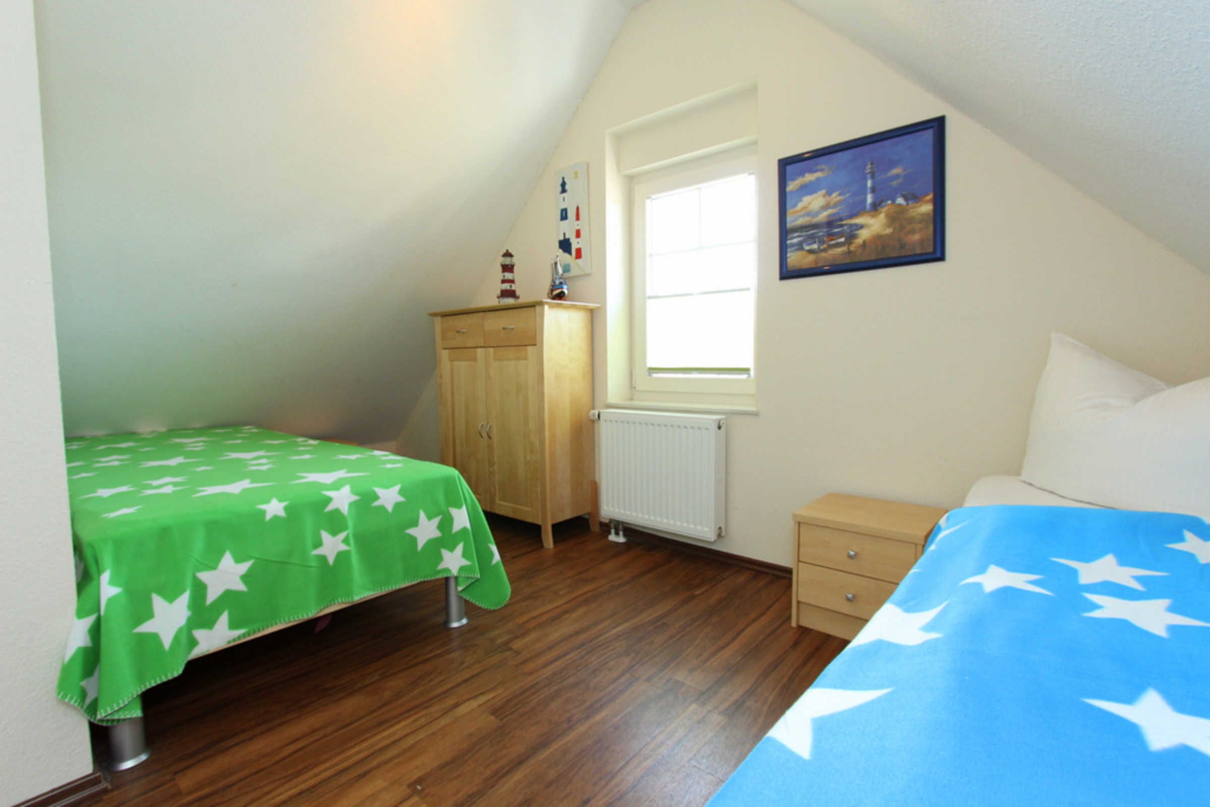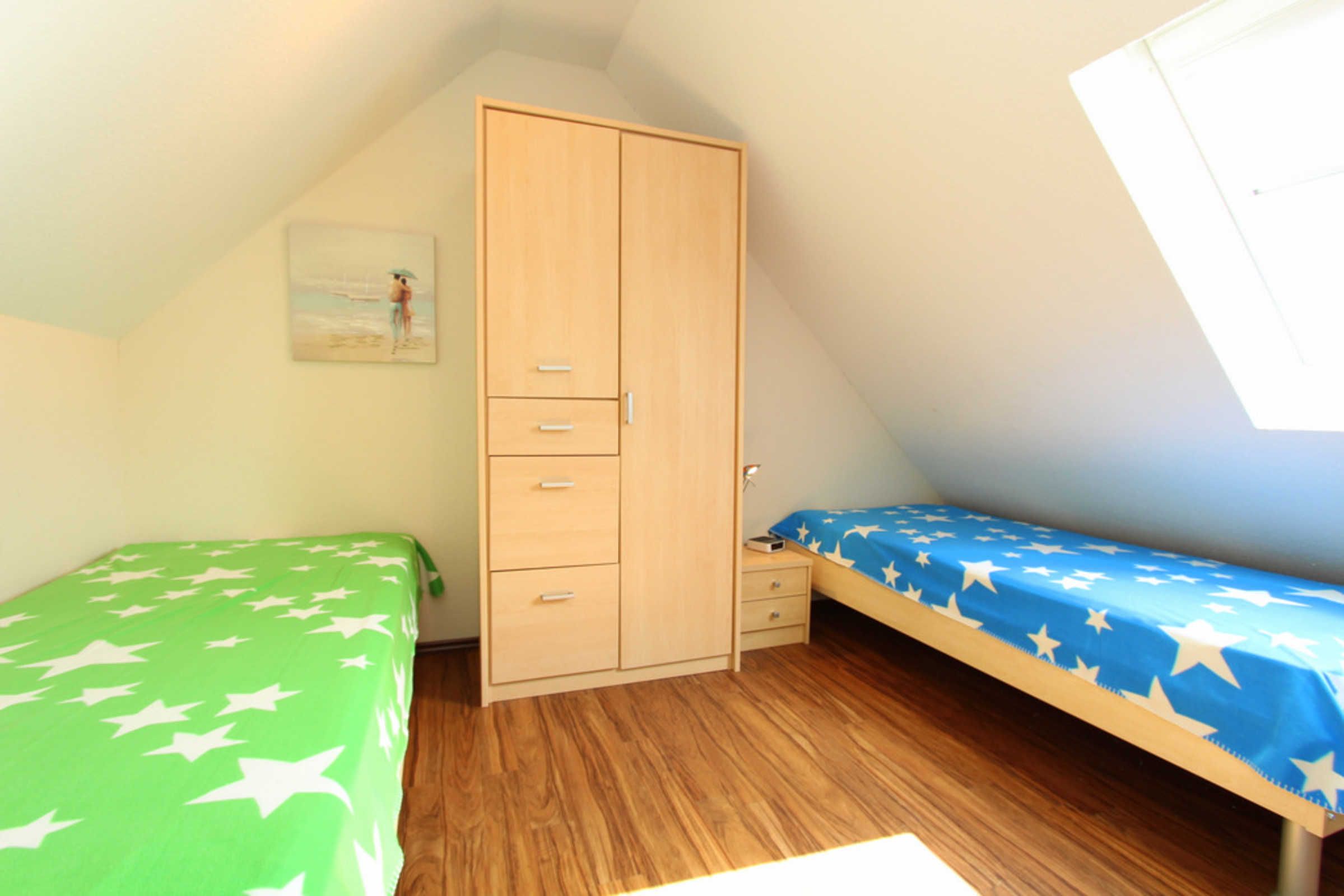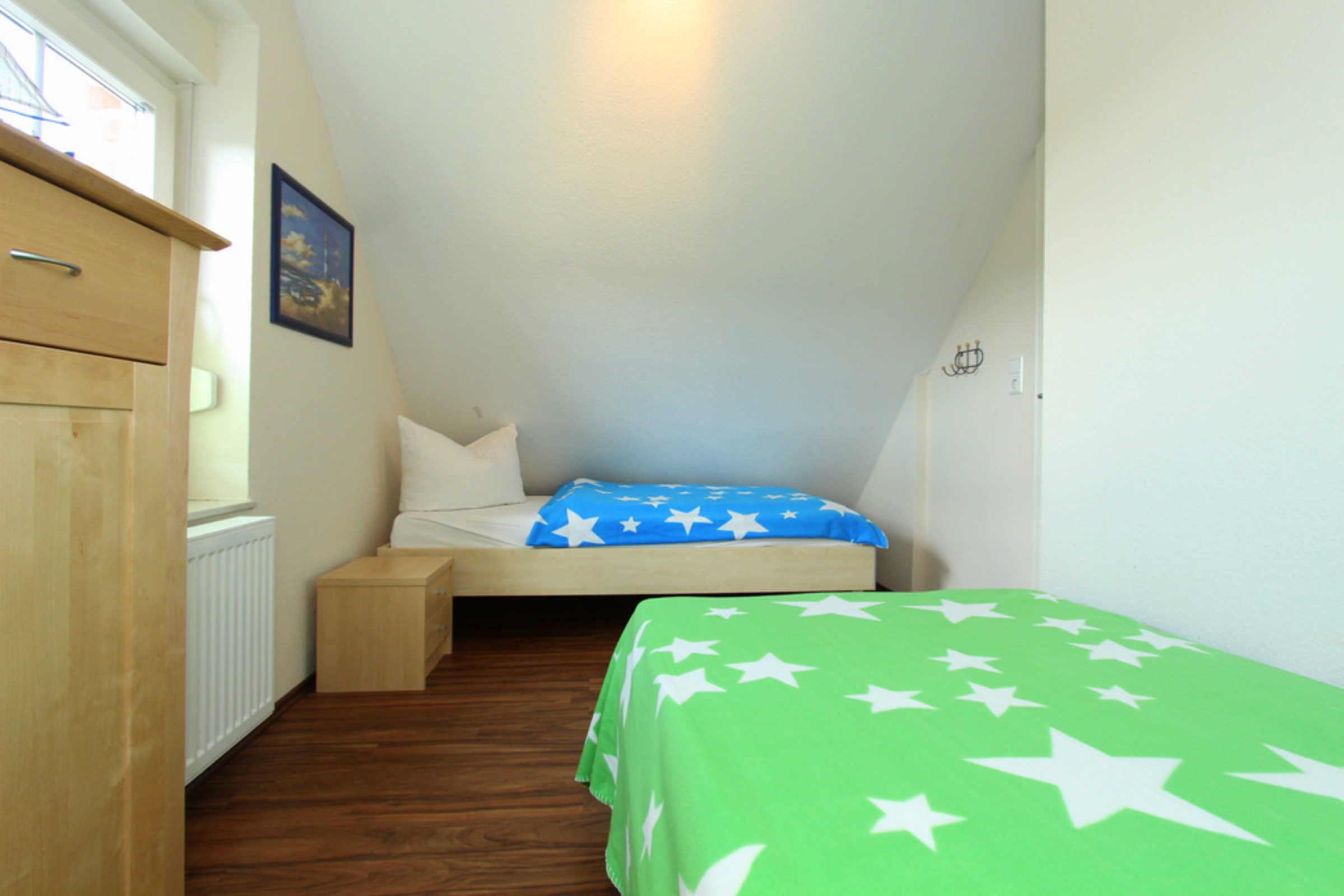 Auf dieser Etage sind zwei weitere Schlafräume - eins mit zwei Einzelbetten (je 80x200cm) und einem Doppelbett (160x200cm) eingerichtet. In beiden Schlafräumen könnten Sie bei Bedarf auch ein Reisebettchen aufstellen.