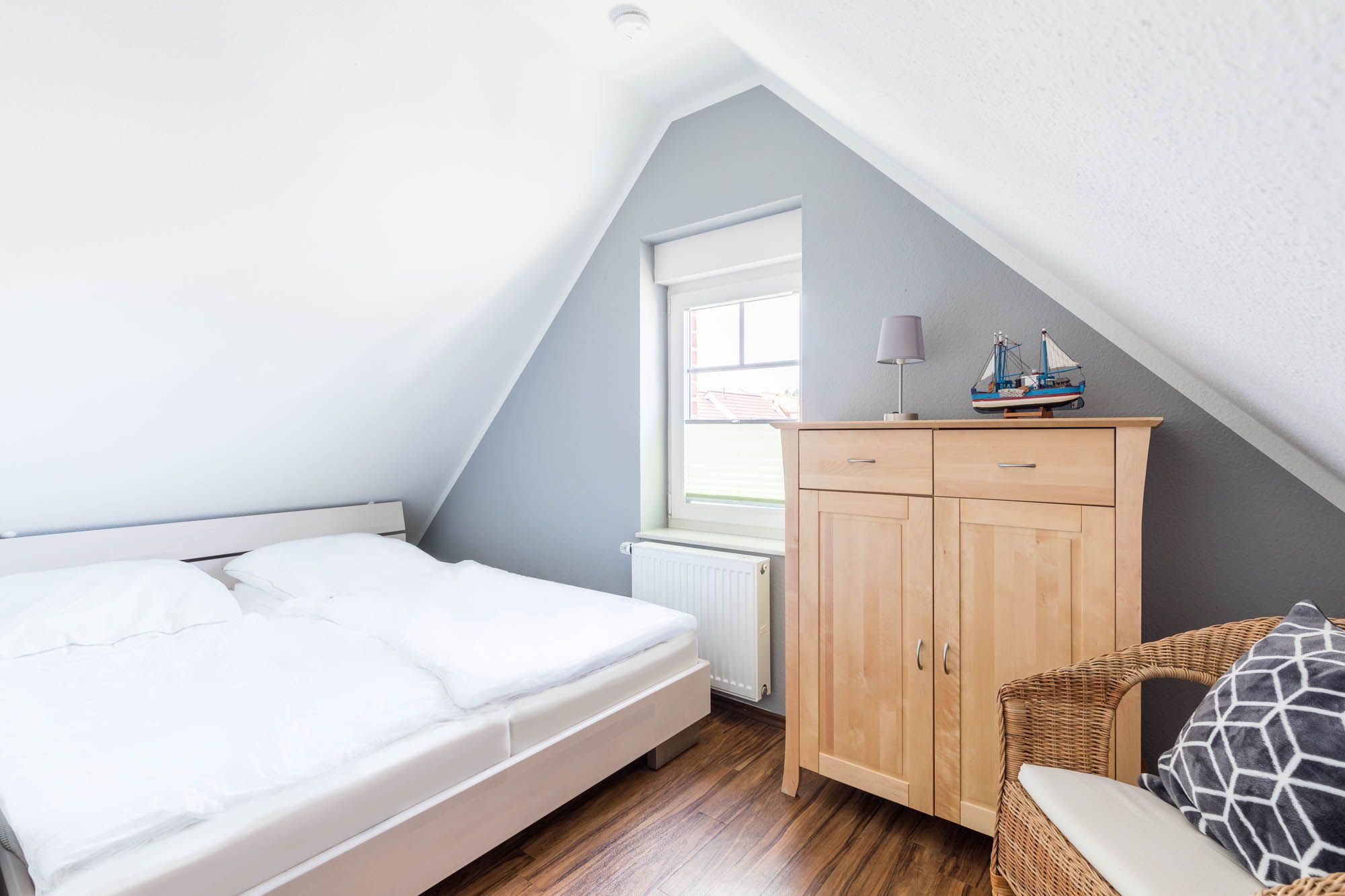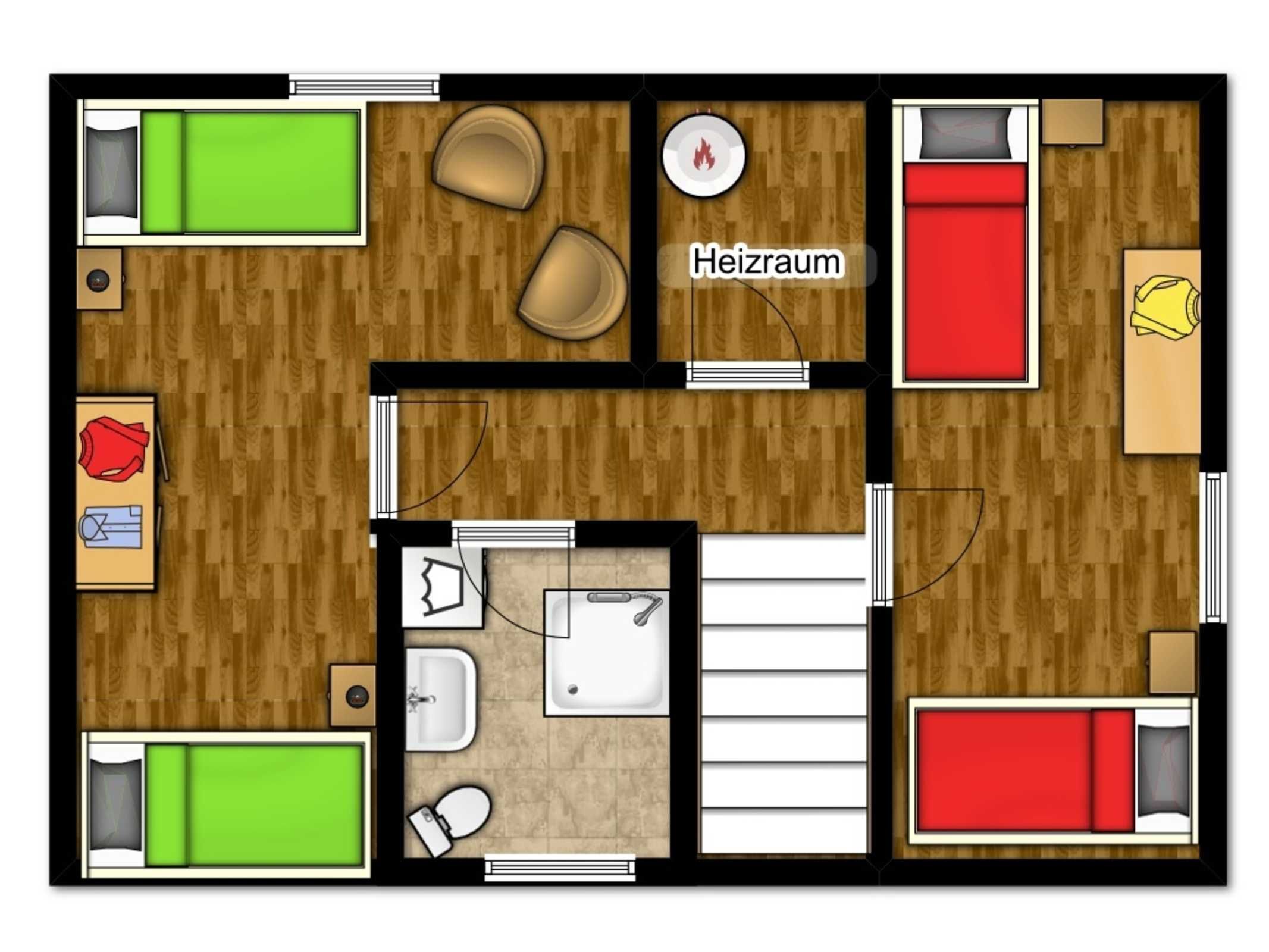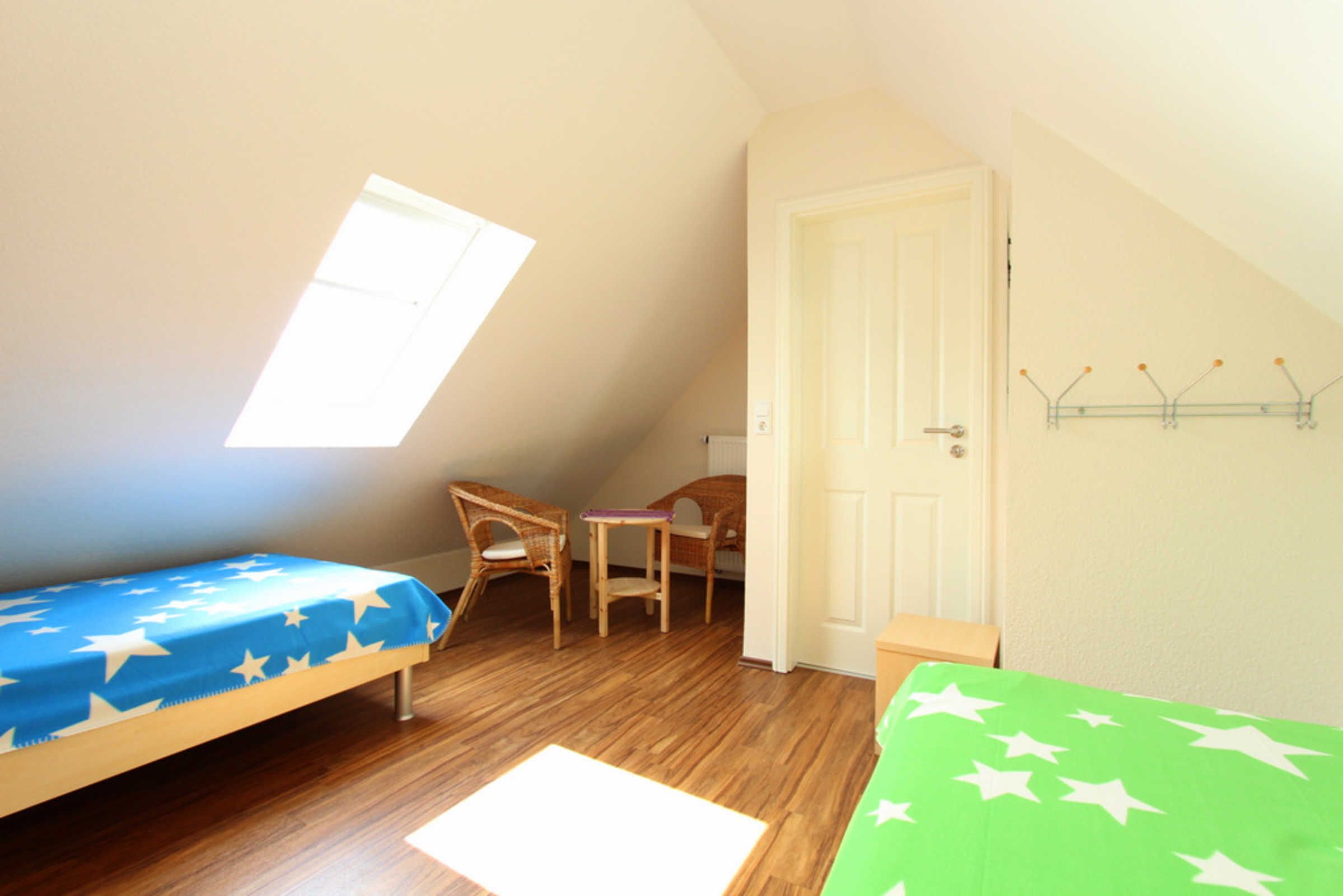 Auf dieser Etage sind zwei weitere Schlafräume - eins mit zwei Einzelbetten (je 80x200cm) und einem Doppelbett (160x200cm) eingerichtet. In beiden Schlafräumen könnten Sie bei Bedarf auch ein Reisebettchen aufstellen.