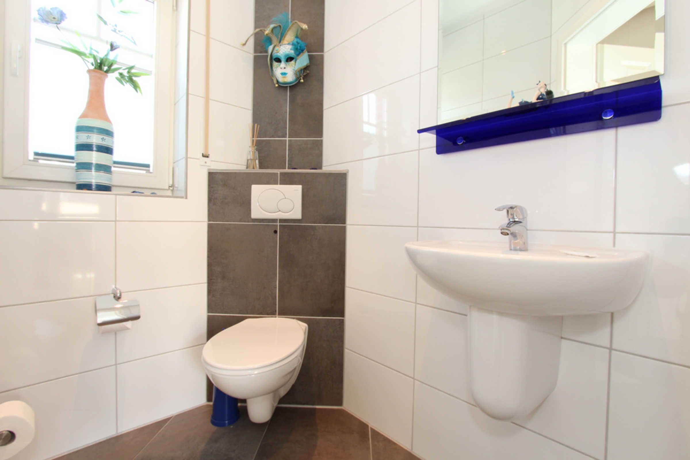 Ebenso befindet sich ein modernes Badezimmer mit (fast) barrierefreier Dusche (Höhe Einstieg 1cm) und WC sowie ein separates Gäste-WC, beide mit Fenster, auf dieser Wohnebene.