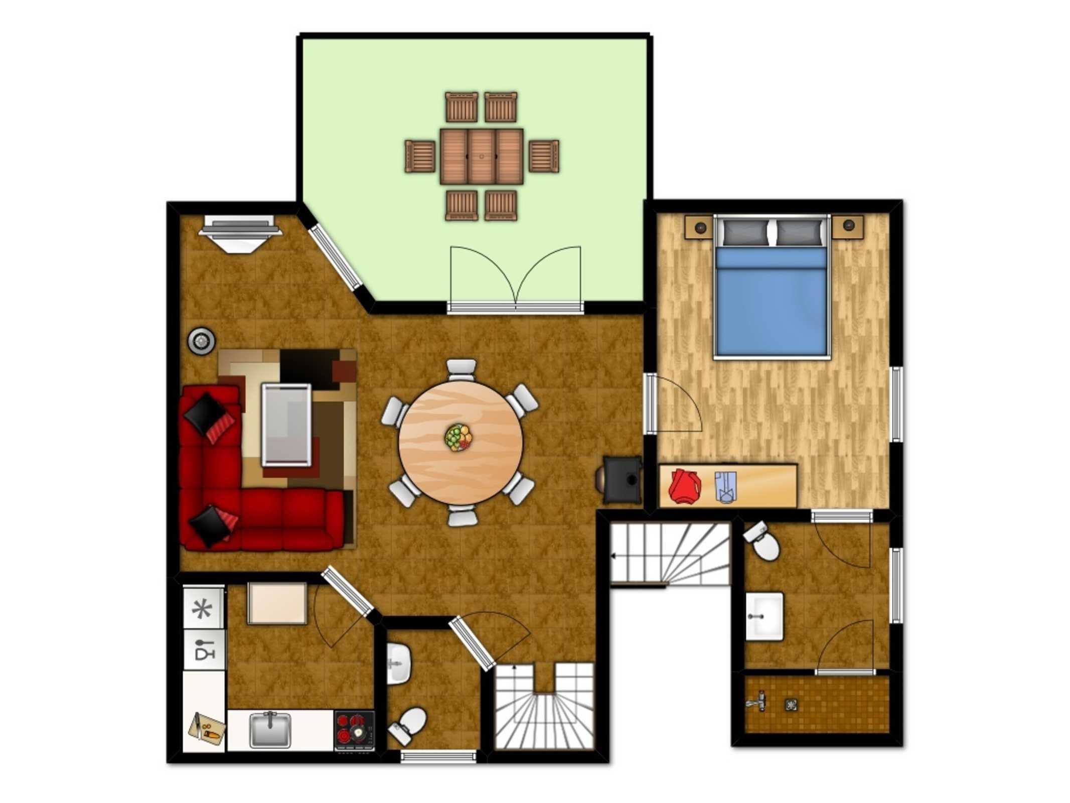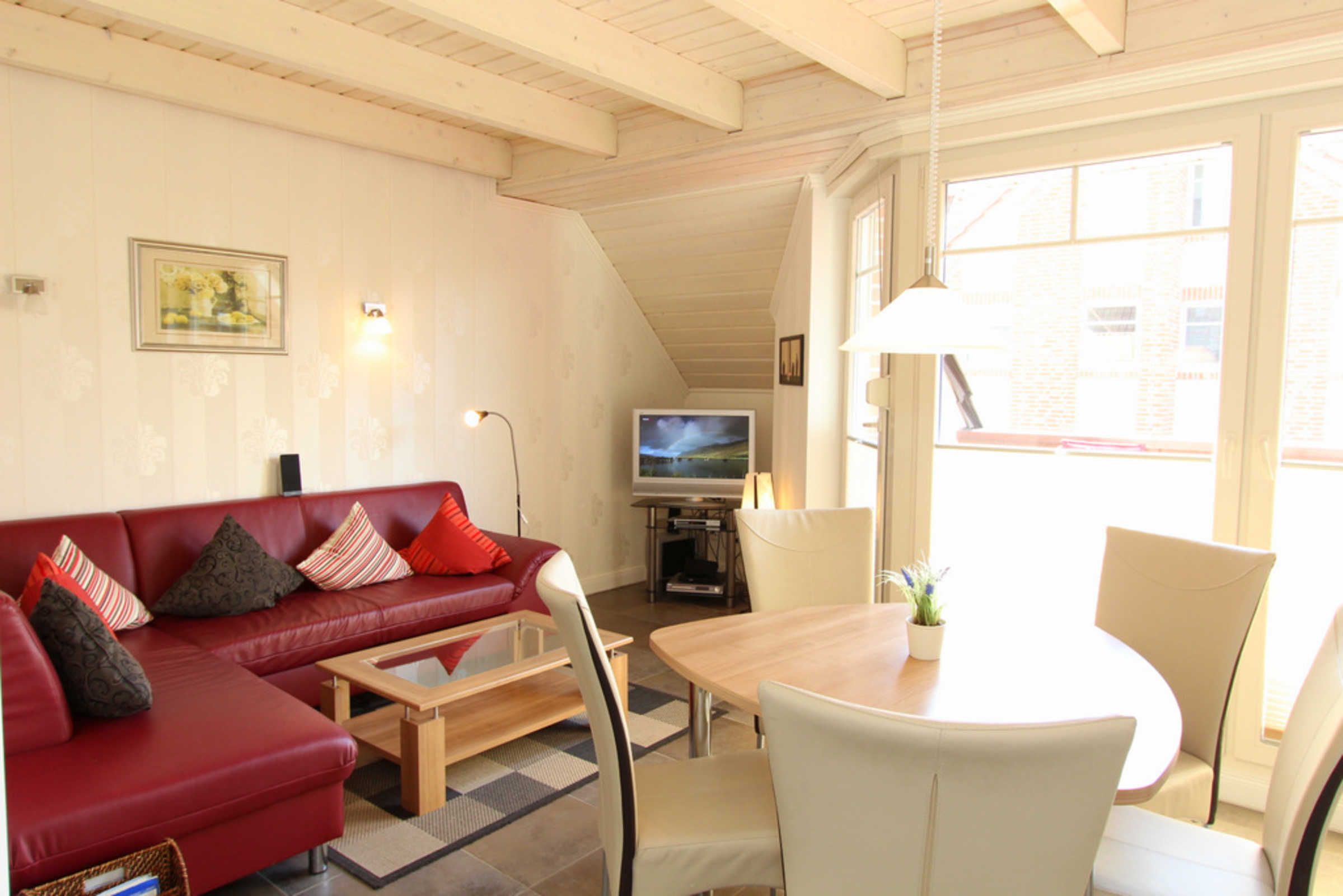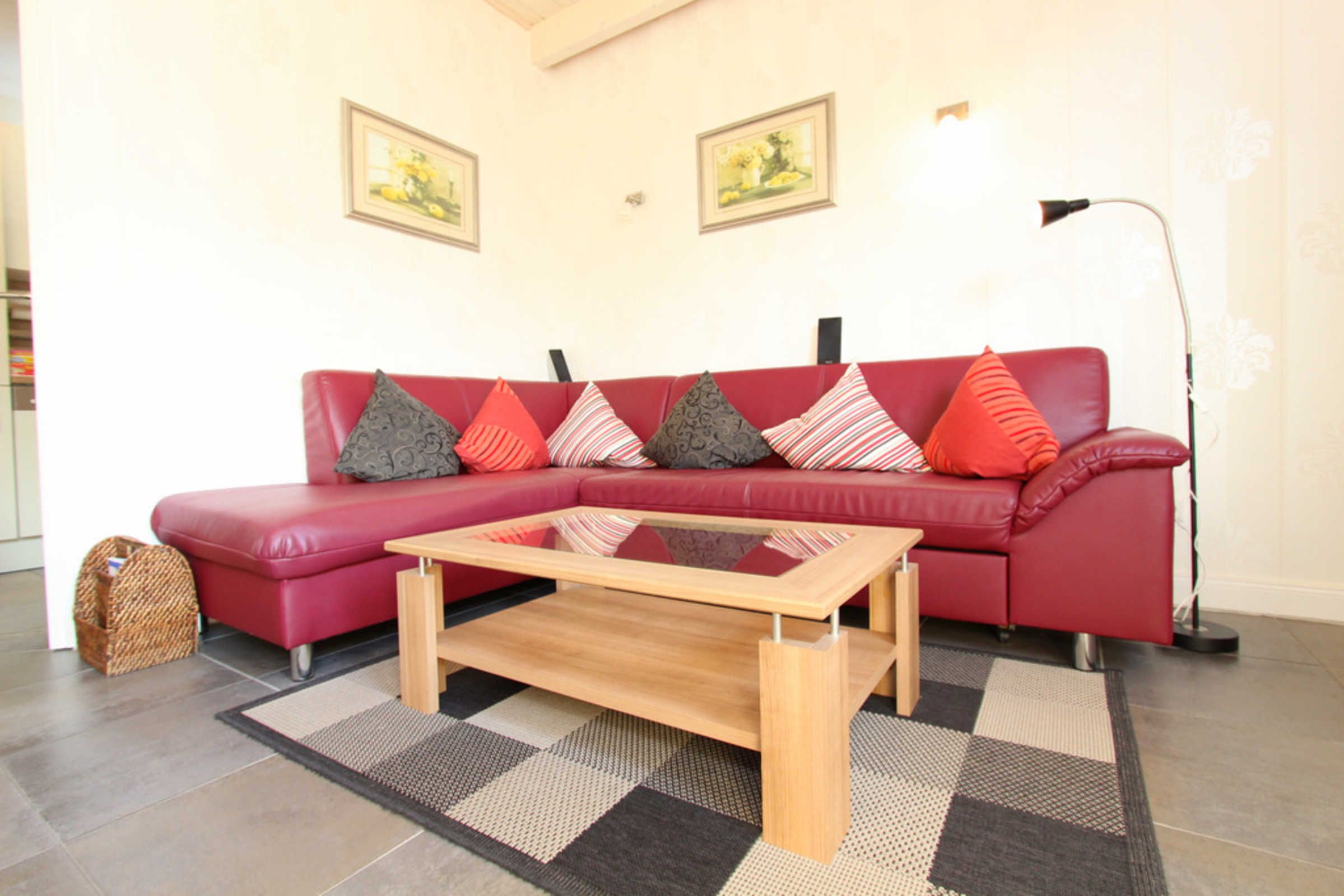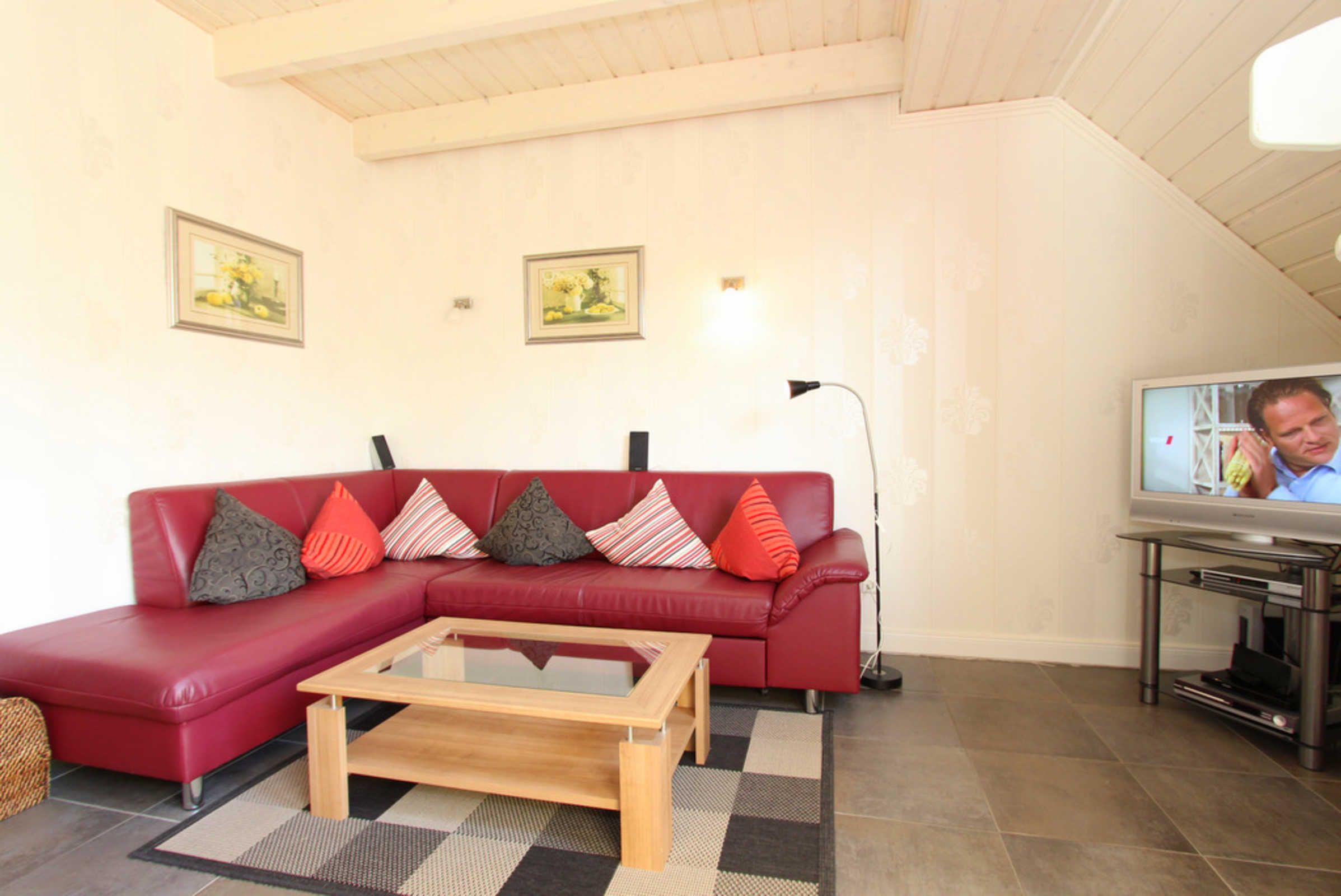 Auf der unteren Ebene lädt im Wohnbereich das große Sofa sowie der Kamin zu gemütlichen Abenden ein. Das Sofa lässt sich ausklappen (Liegefläche ausgeklappt 110x200cm) und bietet so eine weitere Aufteilungsmöglichkeit zum Schlafen der max. 6 Gäste. Für Ihre Unterhaltung stehen Ihnen hier SAT-TV (Flatscreen), DVD-Player und eine Musikanlage zur Verfügung. Ein Reisebettchen könnte hier ebenfalls bei Bedarf aufgestellt werden.