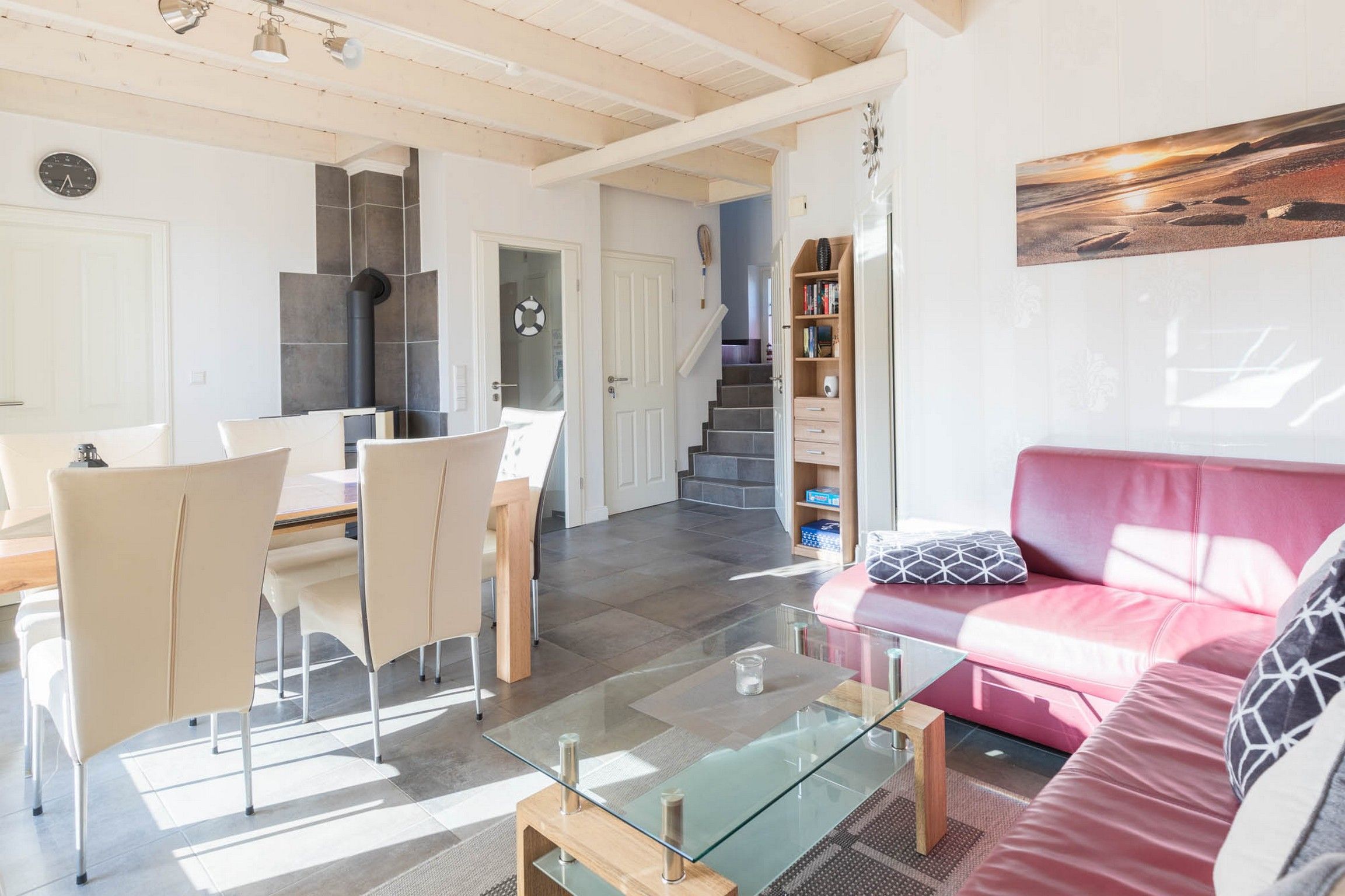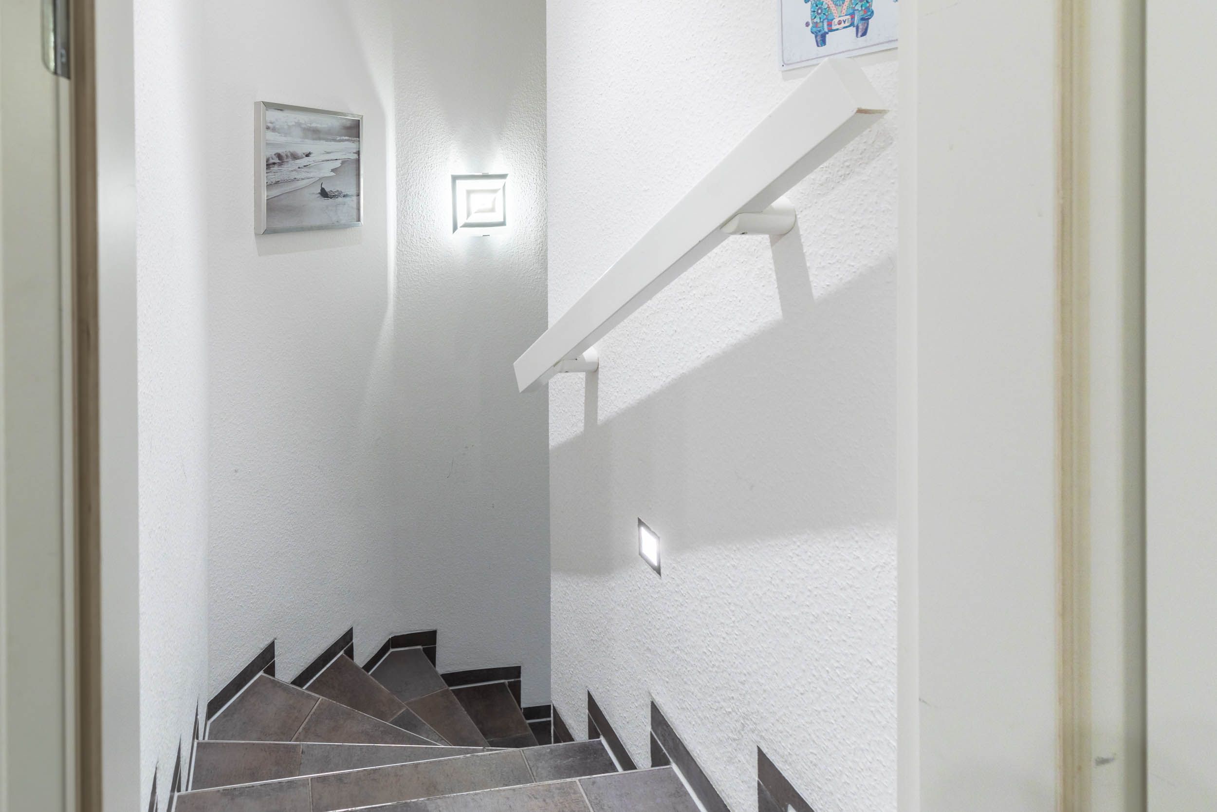 Eine geflieste Treppe führt Sie ins Dachgeschoss (2. Wohnebene):