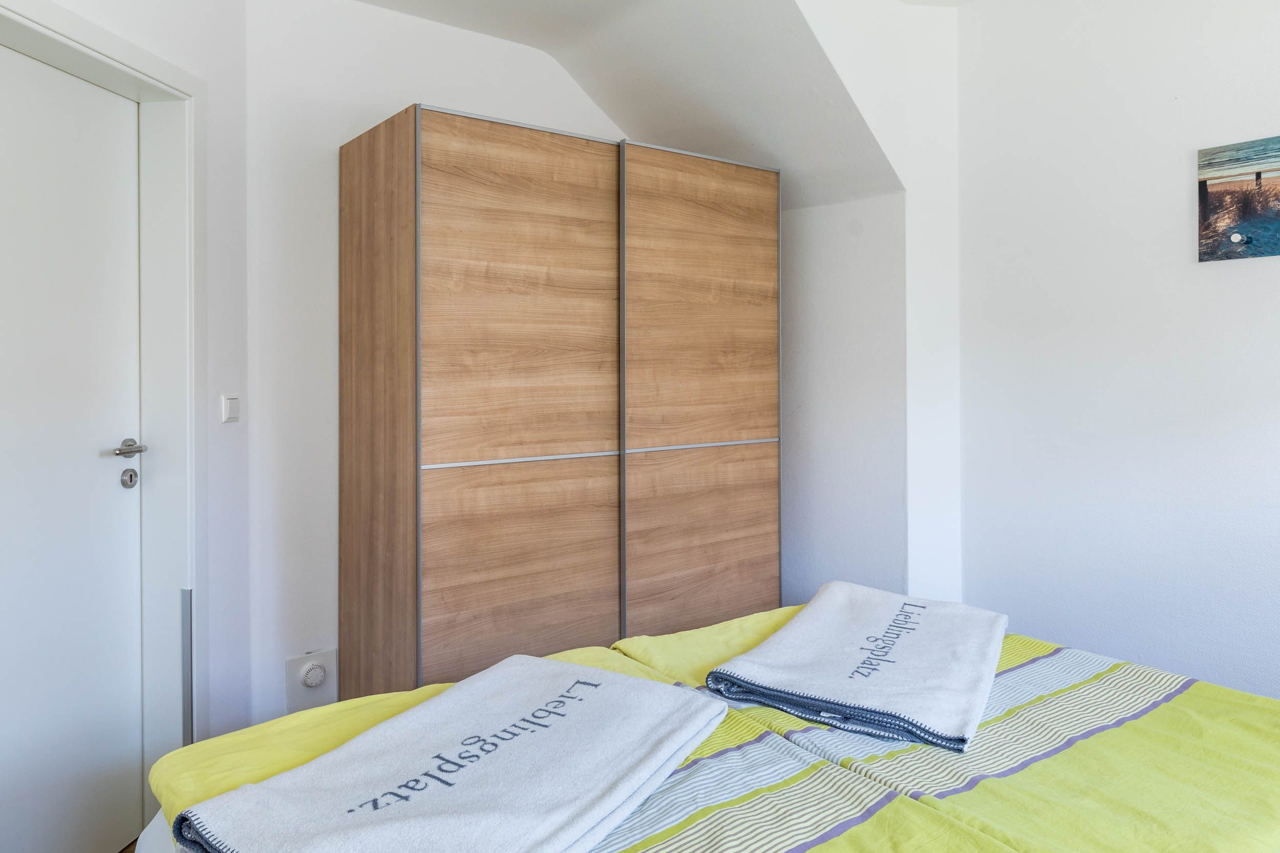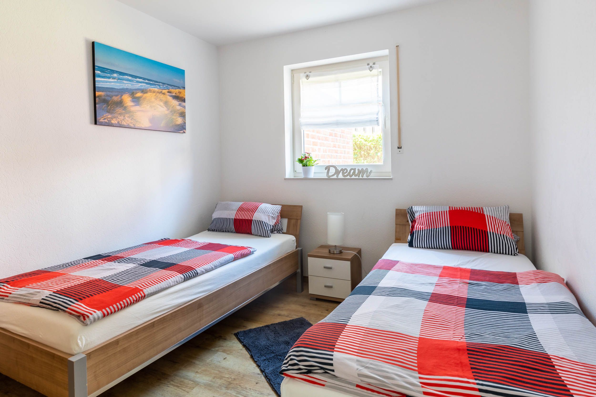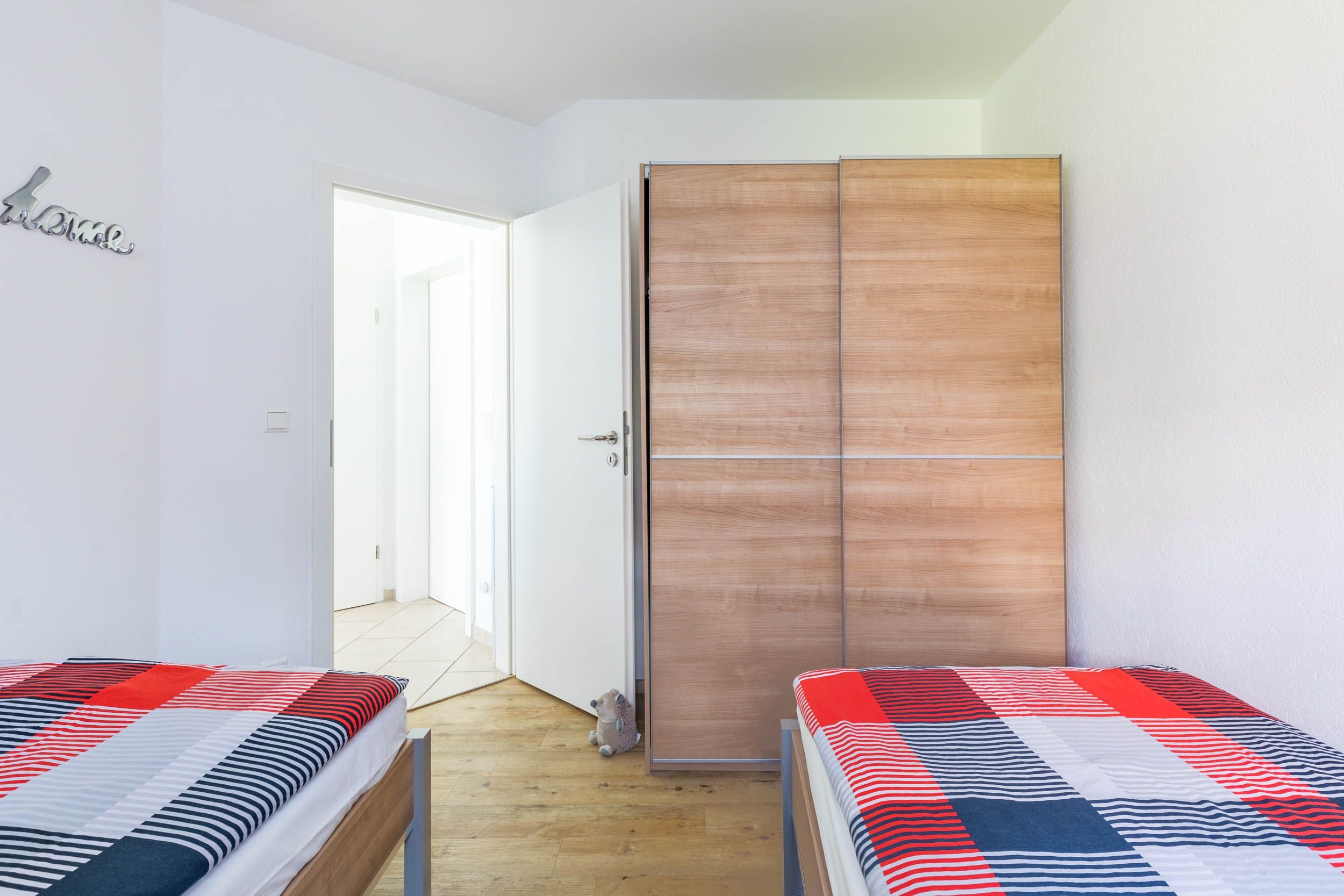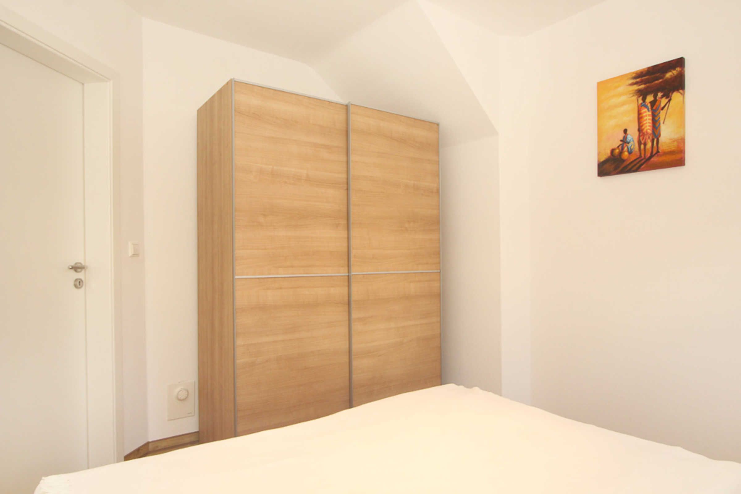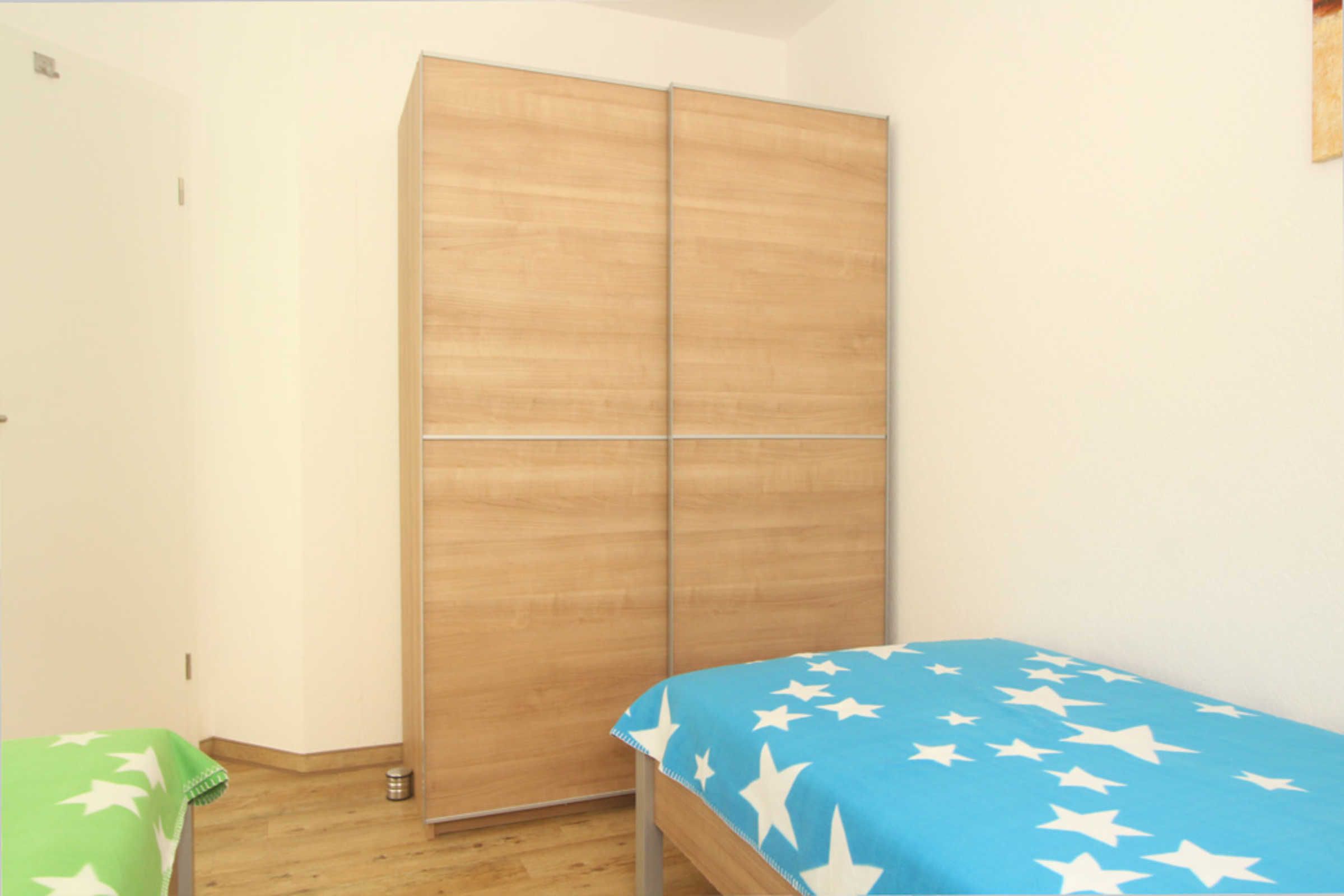 Zur Wohnung gehören zwei Schlafzimmer, wovon eines mit Doppelbett (180x200cm) und das Zweite mit 2 Einzelbetten (je 80x200cm) ausgestattet ist. Zudem finden Sie in jedem dieser Zimmer einen Kleiderschrank für Ihre Garderobe.