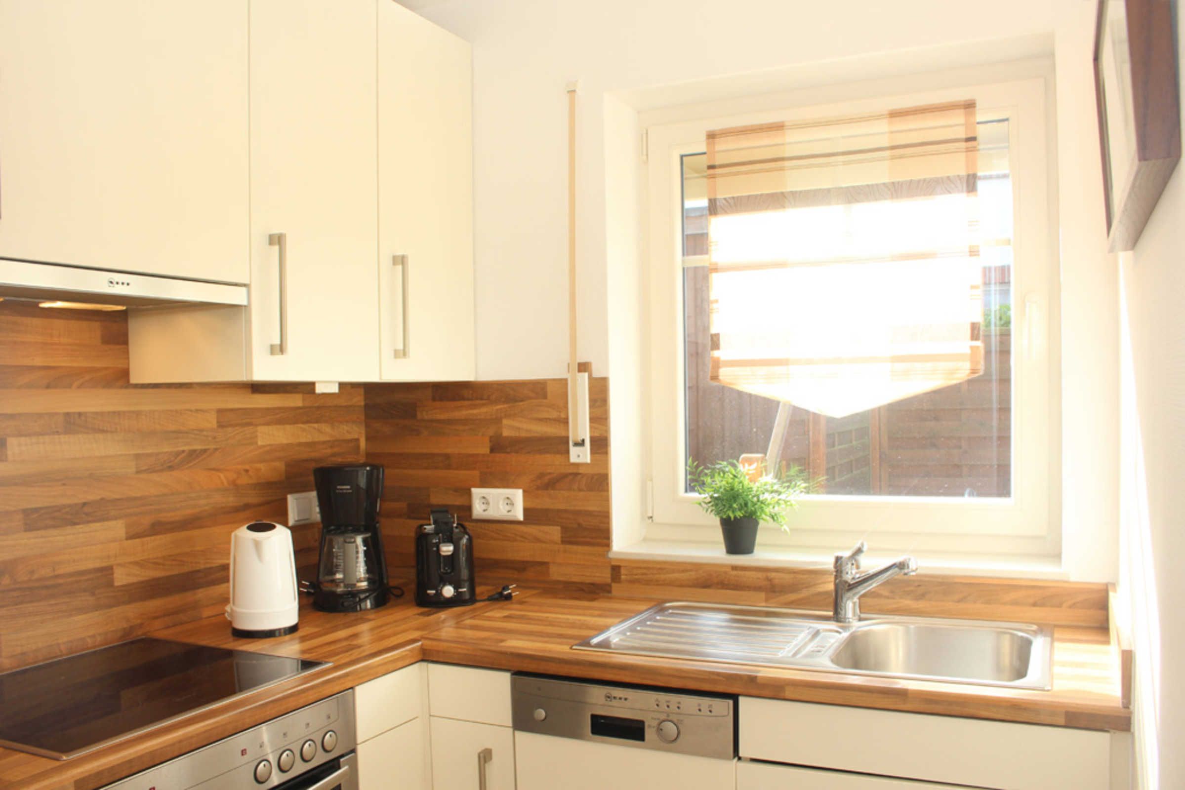 Die Küche ist durch eine Wand vom Wohnbereich getrennt. In ihr finden Sie vom Backofen mit Cerankochfeld über einen Geschirrspüler bis hin zu einer kompletten Auswahl an Geschirr und Gläsern alles, was Sie für die leichte Zubereitung Ihres Urlaubsessens benötigen. Ihre Mahlzeiten können Sie am separaten Essbereich für 4 Personen einnehmen.