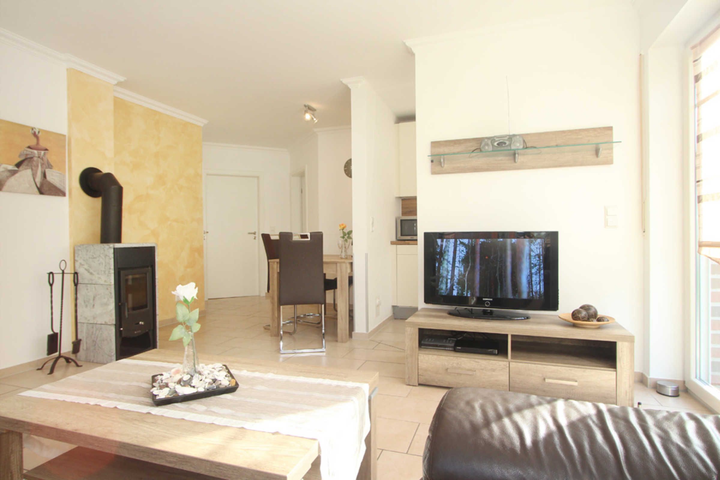 Diese 3-Zimmer-Ferienwohnung mit WLAN befindet strandnah und an kühleren Tagen wärmt Sie der vorhandene Kamin und die Fußbodenheizung.