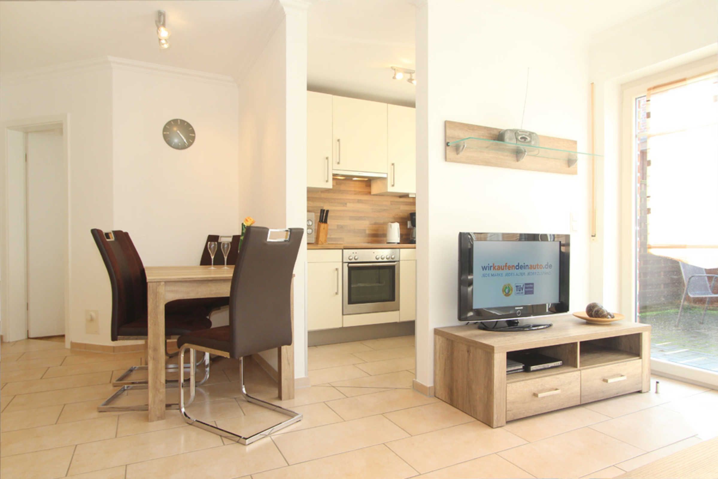 Der großzügige Wohnbereich verfügt über eine schöne Essecke und eine bequeme Couch. An kühlen Tagen lädt der Kamin zum Entspannen ein. Sat-TV (Flatscreen) und Radio gehören zur hochwertigen Ausstattung der Wohnung. Ein mitgebrachtes oder gg. Gebühr geliehenes Reisebettchen könnte hier bei Bedarf auch aufgestellt werden.