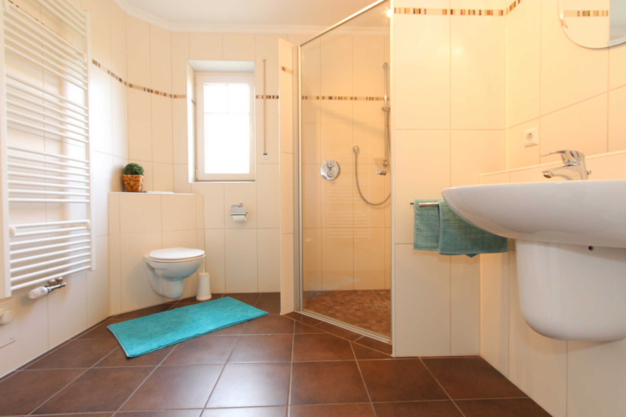 Ebenso bietet die Wohnung ein großes Bad mit Dusche und WC sowie ein separates Gäste-WC. Beide Räume sind mit einem Fenster ausgestattet. Im Bad befinden sich weiterhin eine Waschmaschine und ein Trockner, welche Sie gegen Gebühr nutzen können.