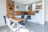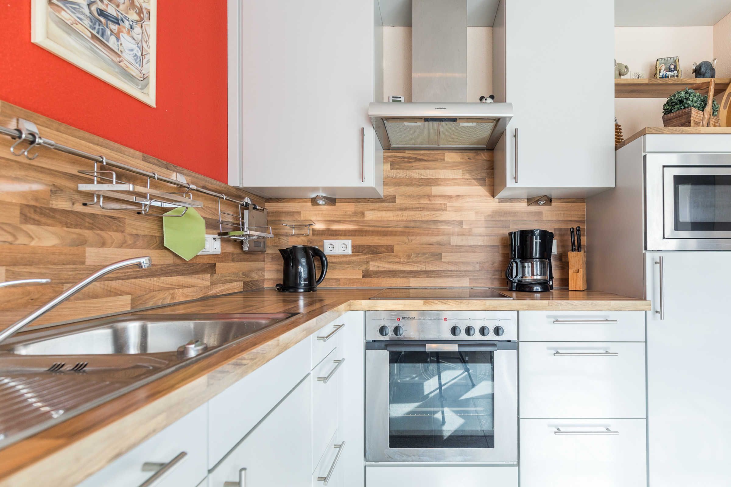 Die offene Küche bietet neben einem Cerankochfeld mit Backofen einen Kühlschrank mit Gefrierfach, eine Mikrowelle, eine Spülmaschine, einen Toaster und einen Wasserkocher.