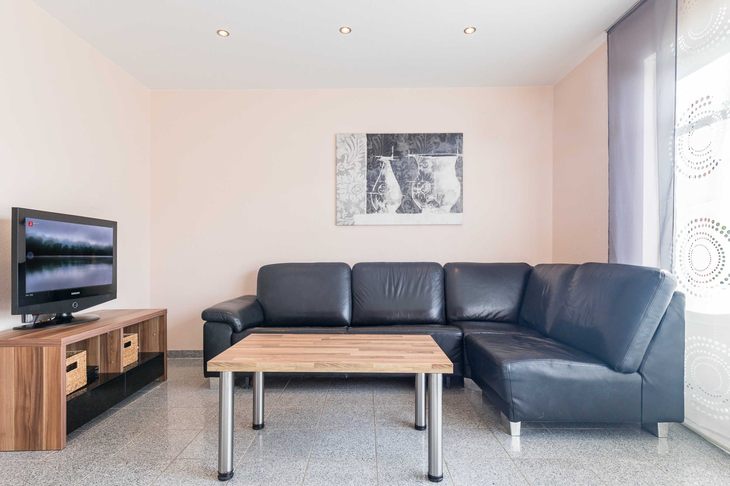 Im Wohnbereich erwartet Sie Sat-TV, eine Essecke sowie eine Schlafcouch, auf der ein weiterer Gast schlafen könnte.