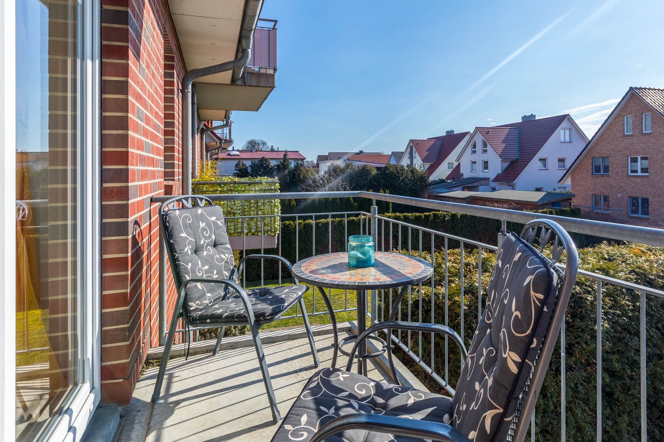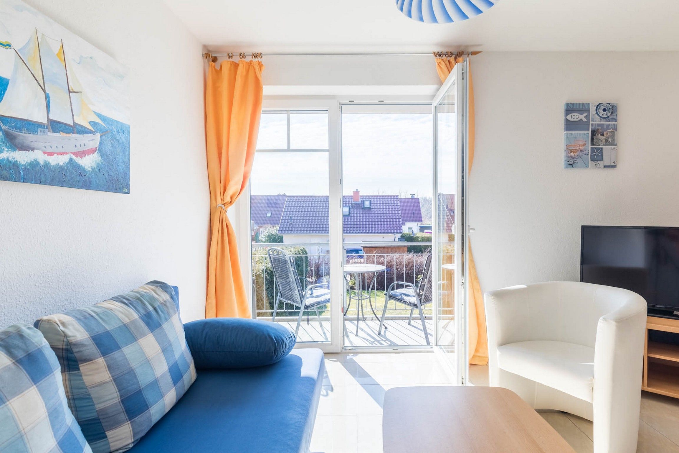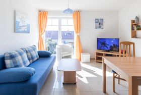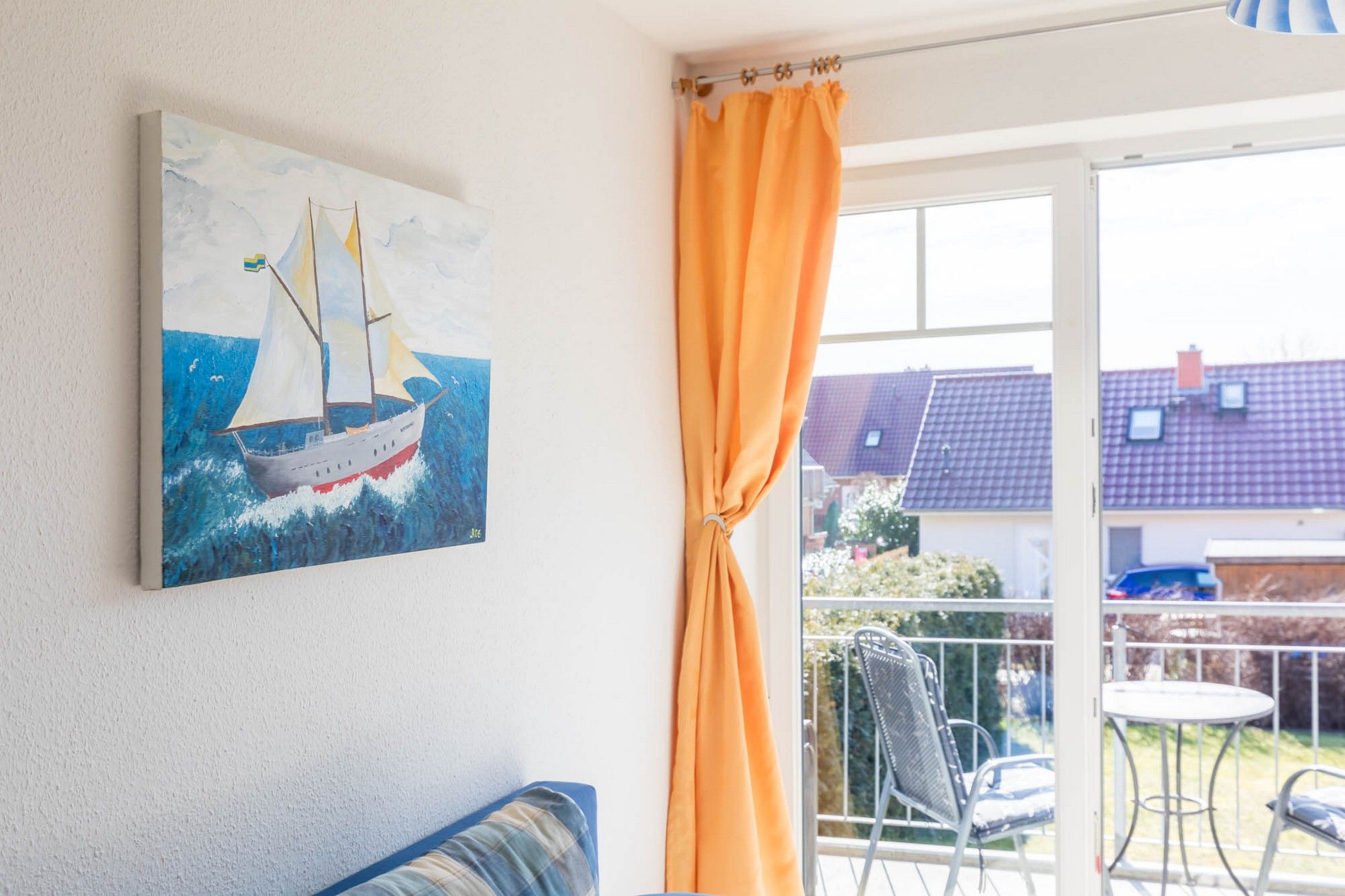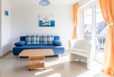 Die strandnahe und maritim eingerichtete 3-Zimmer-Ferienwohnung im 1. Obergeschoss mit Balkon ist für drei Personen plus Kleinkind eingerichtet.