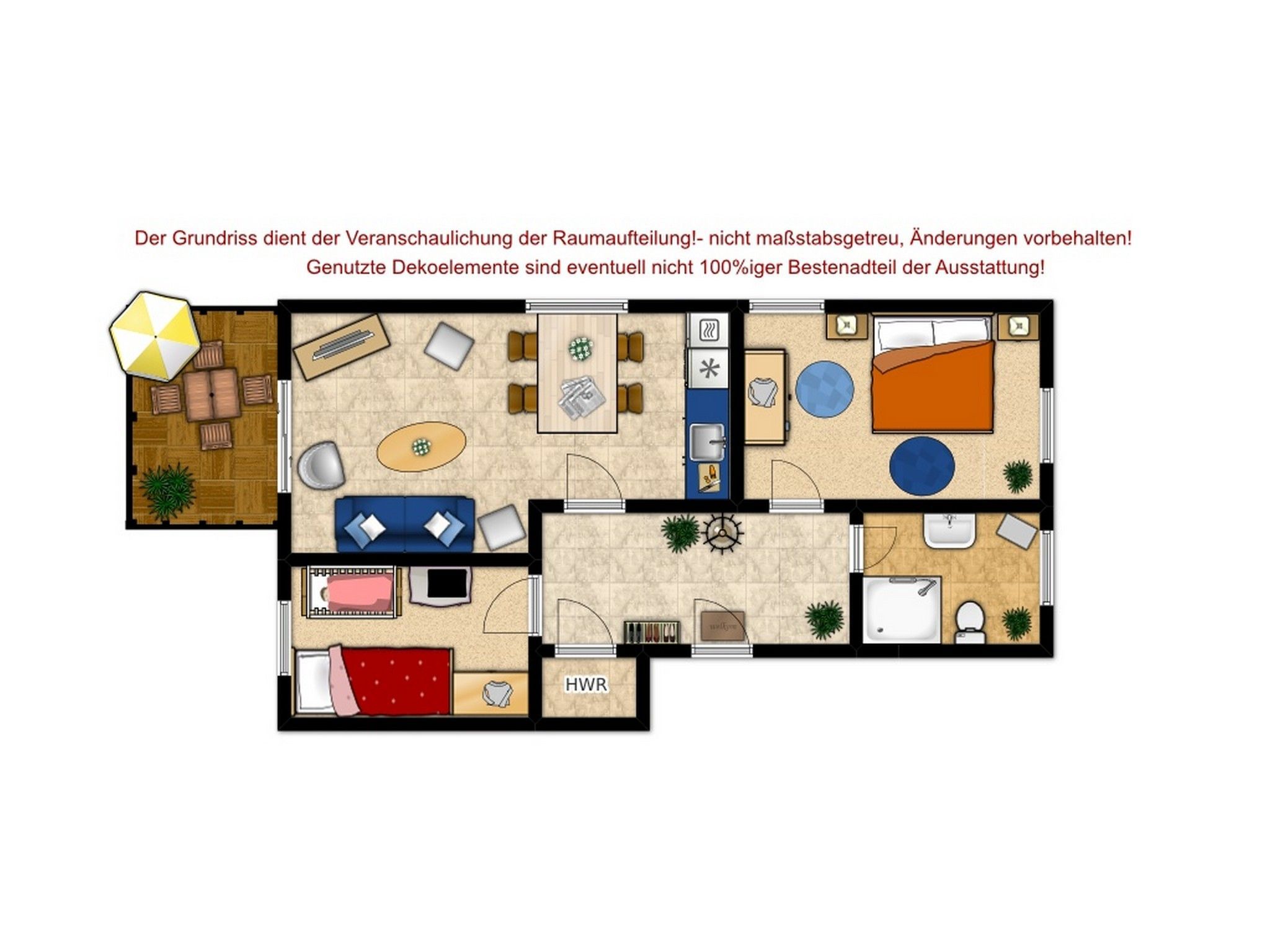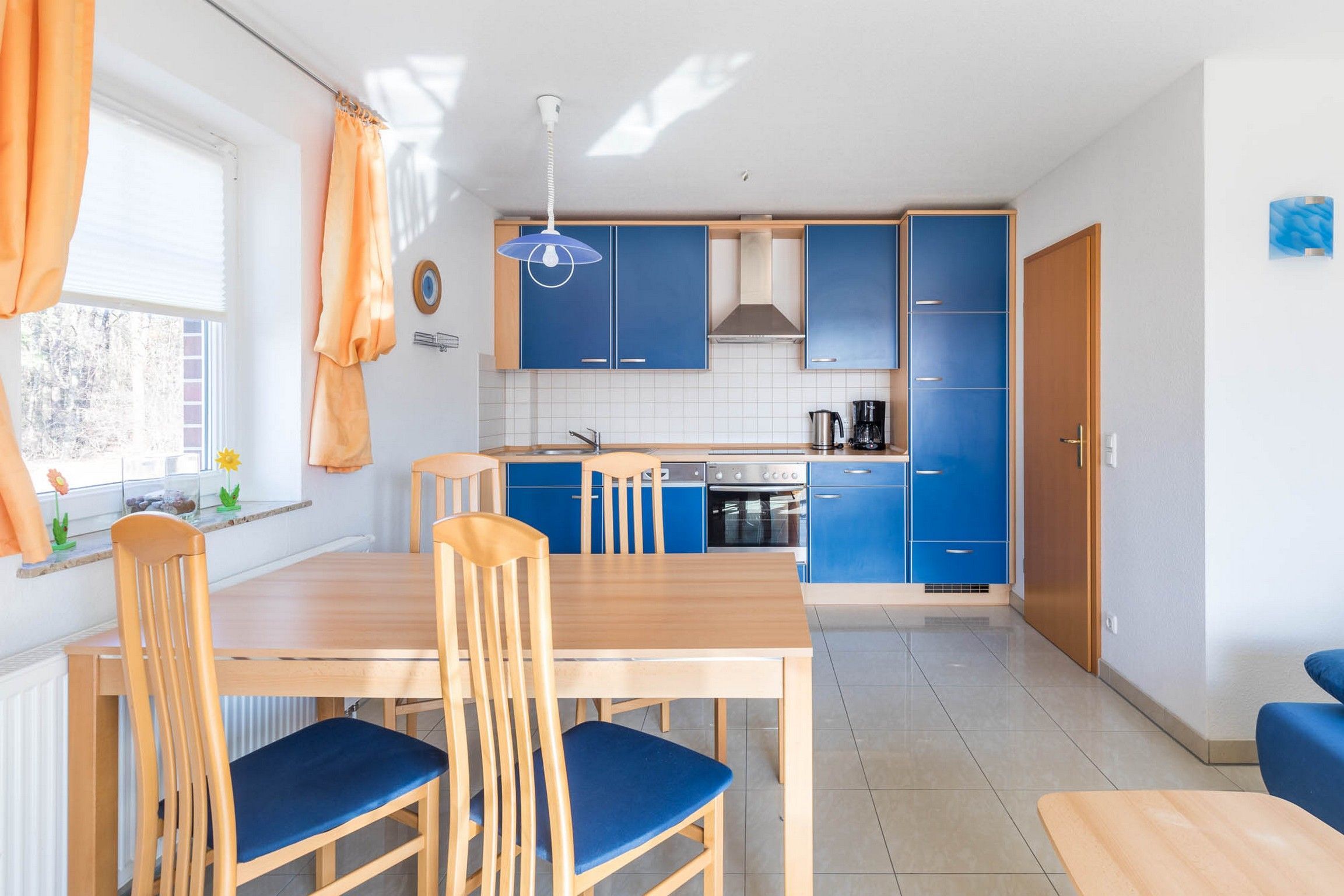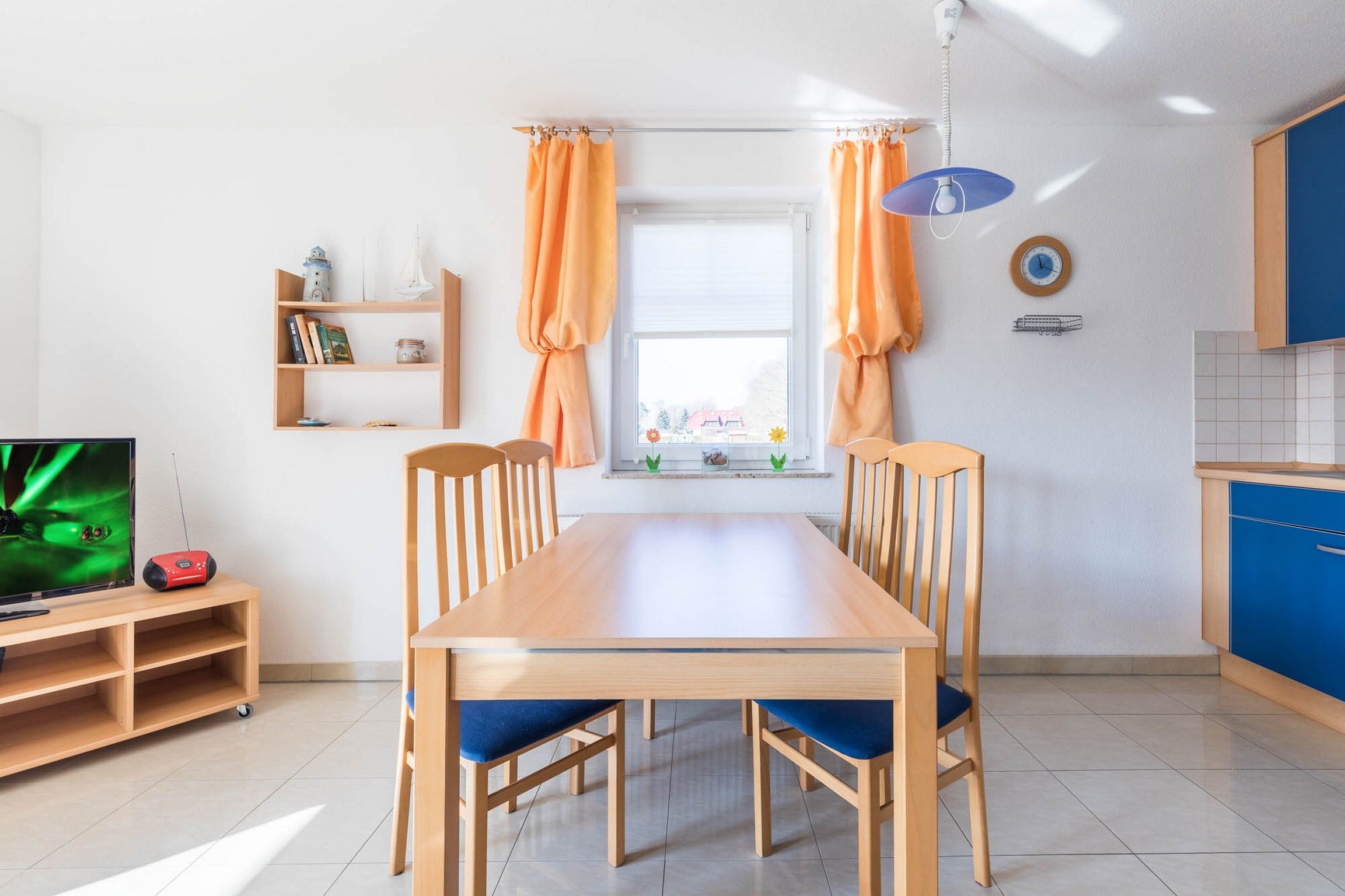 Die strandnahe und maritim eingerichtete 3-Zimmer-Ferienwohnung im 1. Obergeschoss mit Balkon ist für drei Personen plus Kleinkind eingerichtet.