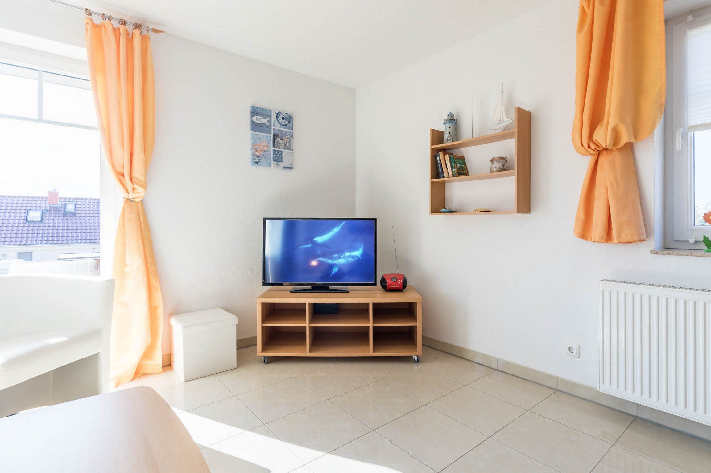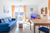 Der Wohn- und Essbereich bietet im beliebten maritim angehauchten Flair ein passendes Sofa, einen Sessel und einen großen SAT-TV (Flatscreen) sowie eine Musikanlage für die Multimediaunterhaltung.