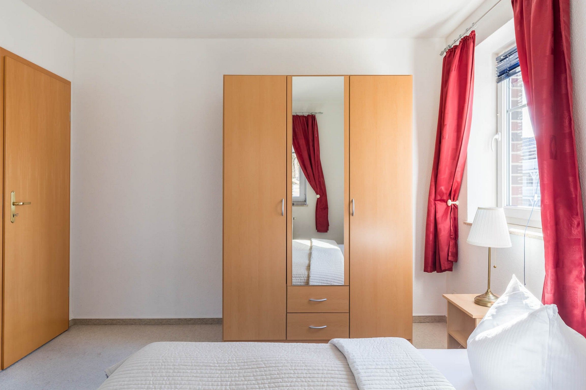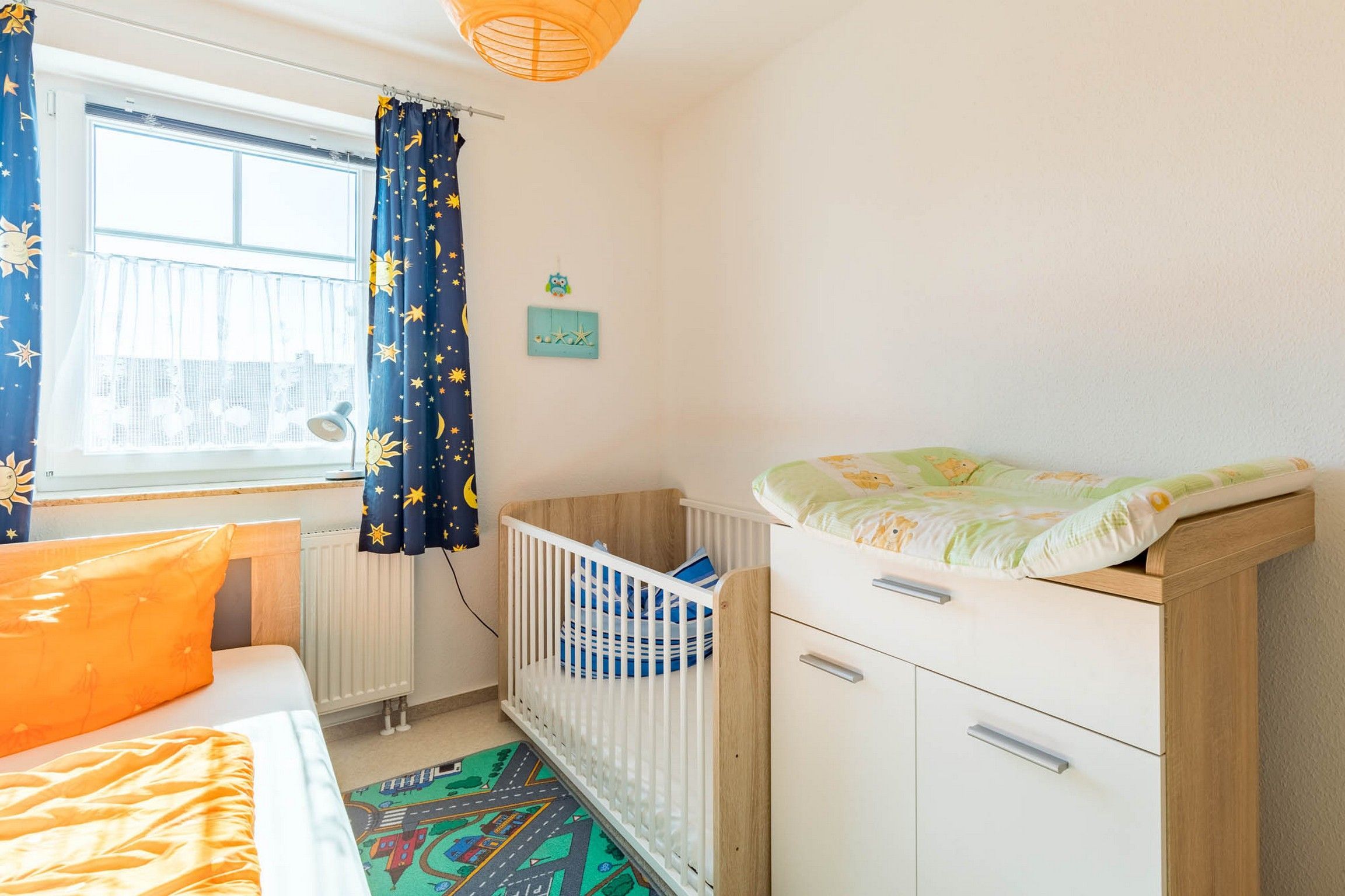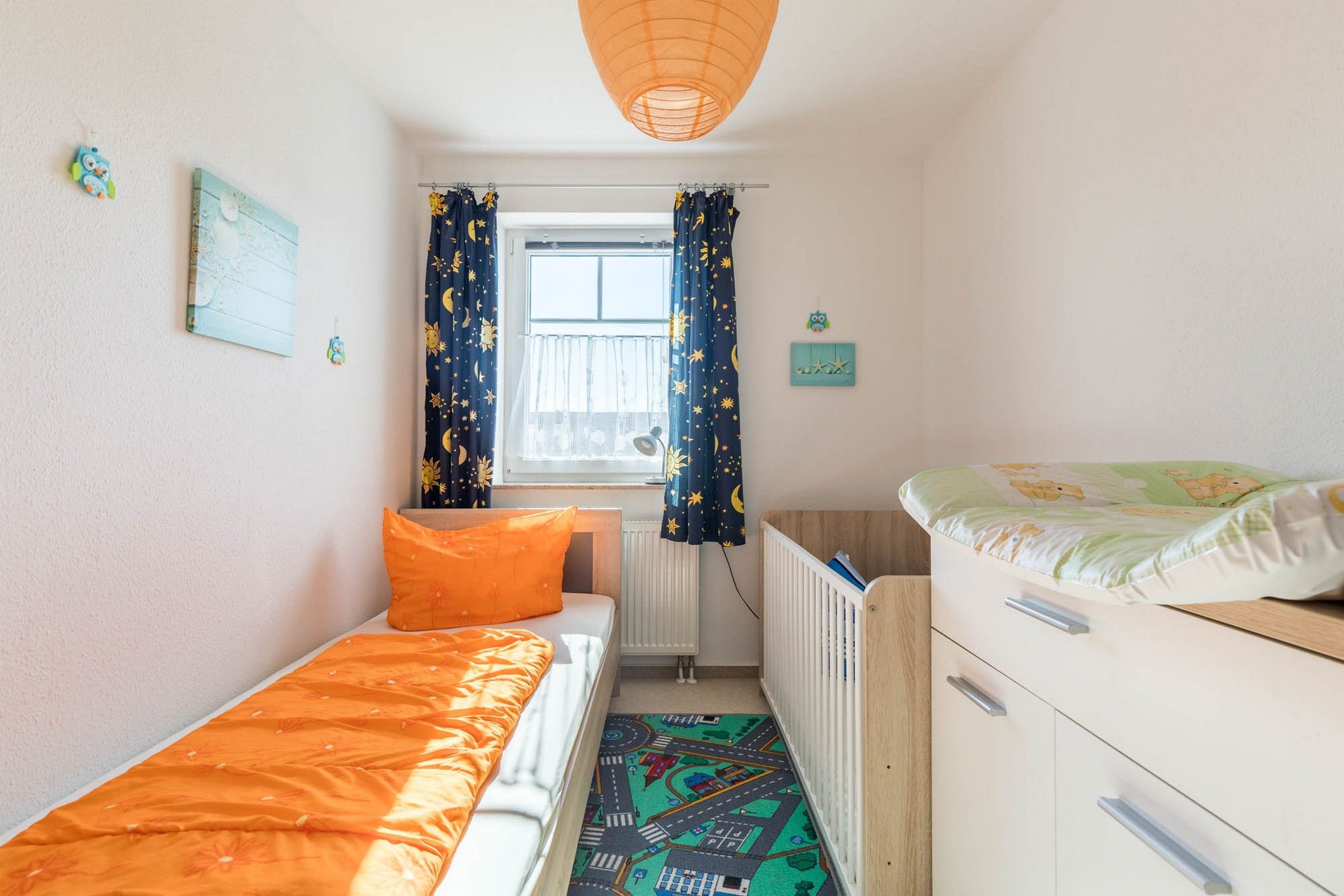 Das Schlafzimmer bietet ein Doppelbett (180x200) und einen Kleiderschrank, im Kinderzimmer befindet sich ein Einzelbett (90x200), ein festes Holz-Gitterbettchen inkl. Matratze und eine Wickelkommode. Bei beiden Zimmern sind an den Fenstern Jalousien und Gardinen angebracht.