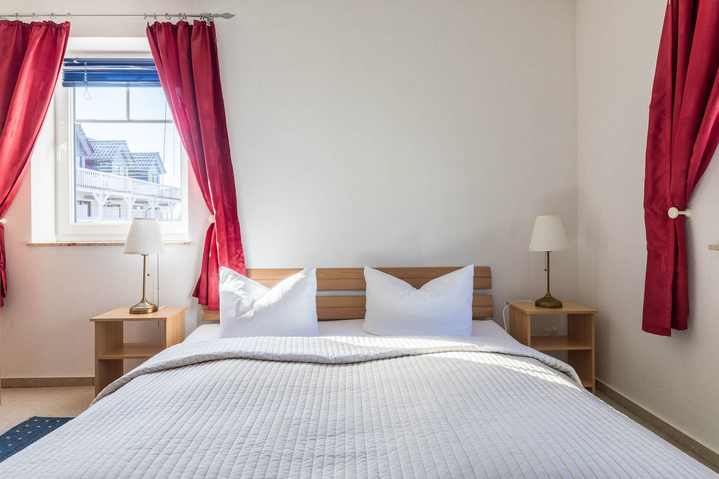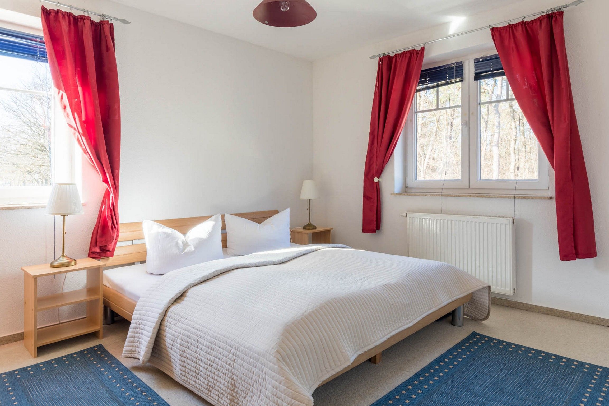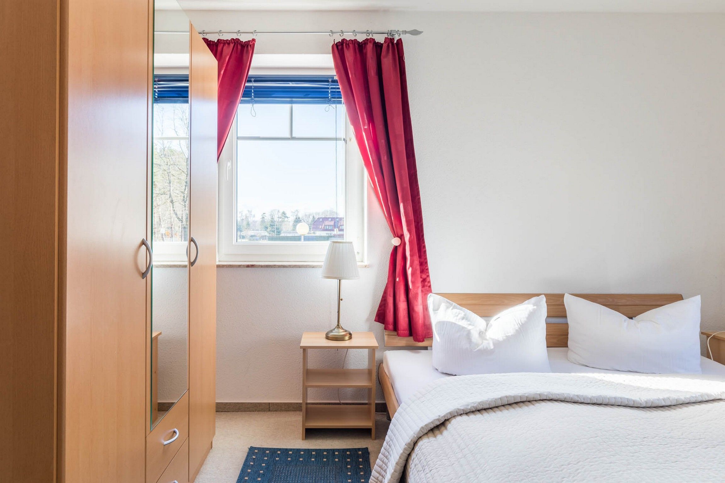 Das Schlafzimmer bietet ein Doppelbett (180x200) und einen Kleiderschrank, im Kinderzimmer befindet sich ein Einzelbett (90x200), ein festes Holz-Gitterbettchen inkl. Matratze und eine Wickelkommode. Bei beiden Zimmern sind an den Fenstern Jalousien und Gardinen angebracht.