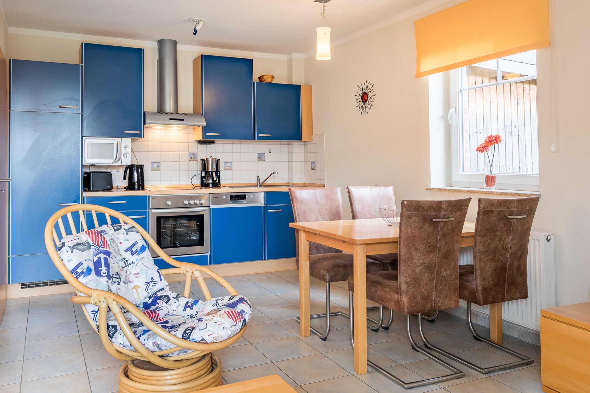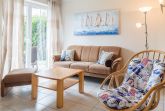 Sie bietet einen gemütlichen Wohnbereich mit einer Couch, SAT-TV (Flatscreen) und DVD-Player. Es gibt weiterhin eine Essecke für 4 Personen sowie eine möblierte Sonnenterrasse (Süd), die Sie vom Wohnzimmer aus erreichen.