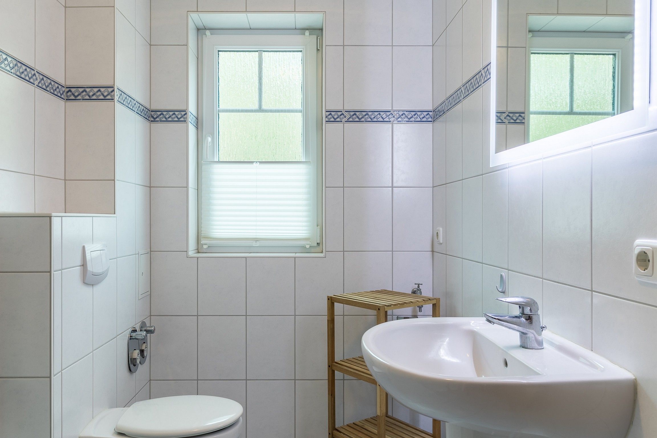 Das Bad mit Fenster bietet ein WC, Dusche, Fön und Handtuchtrockner.