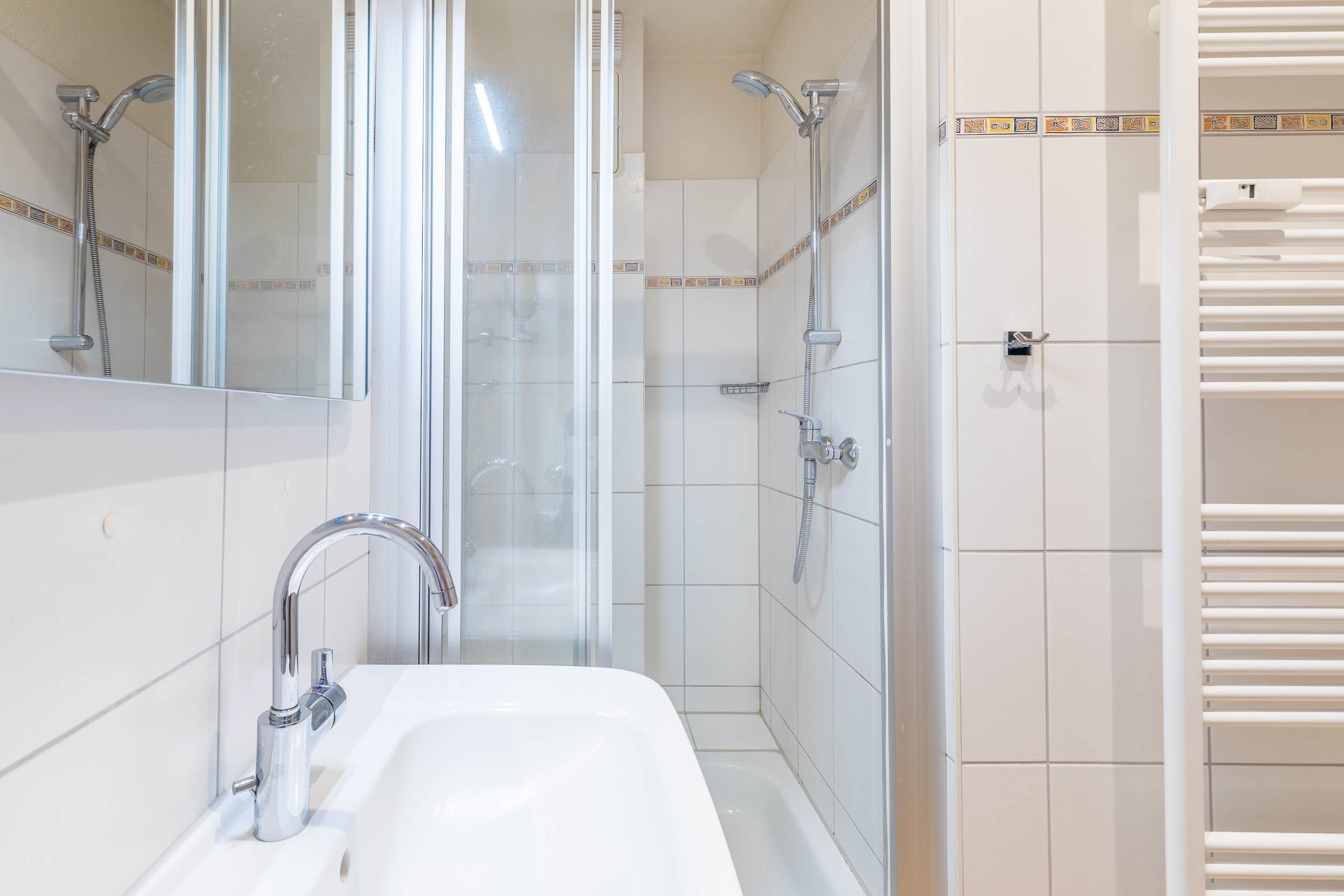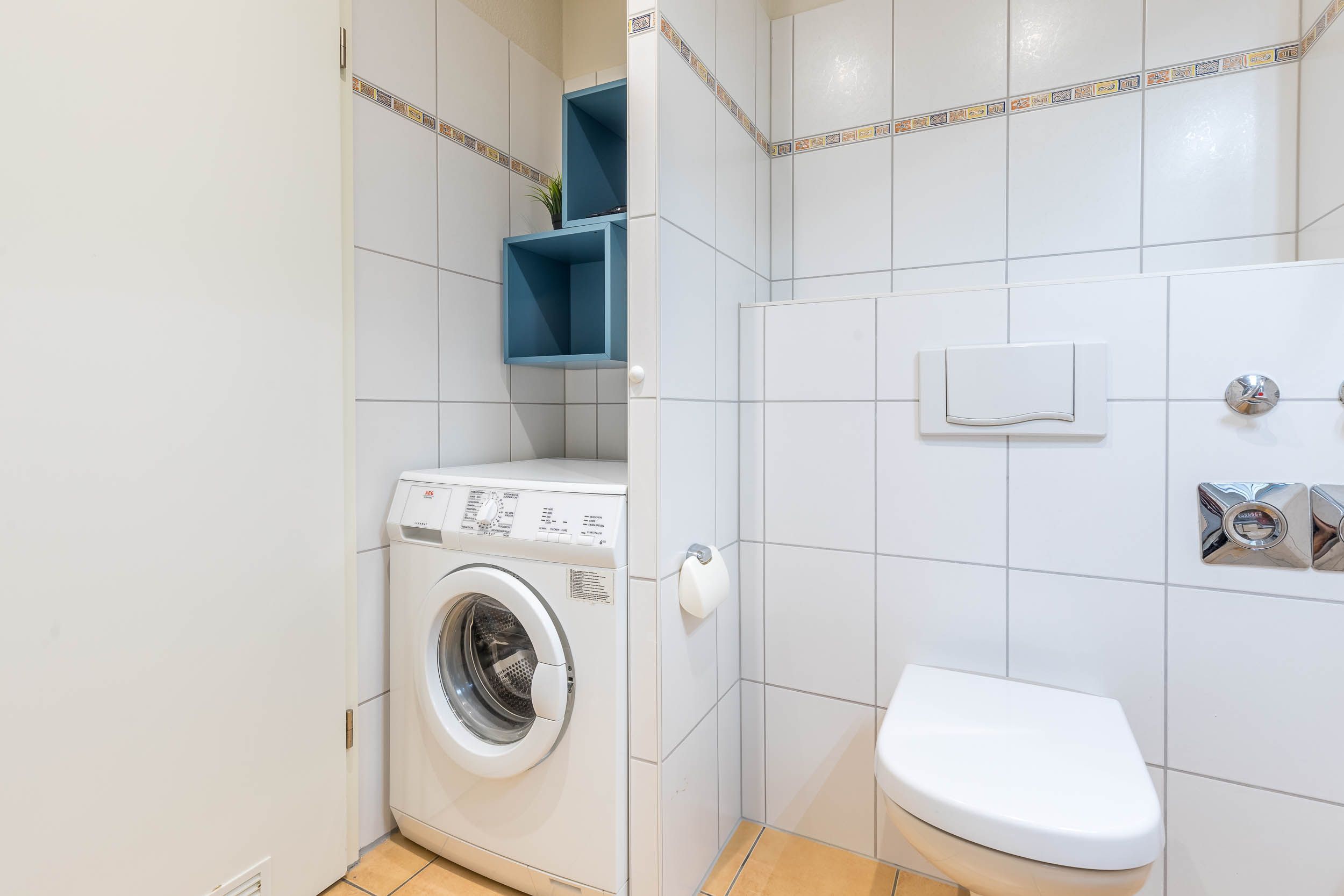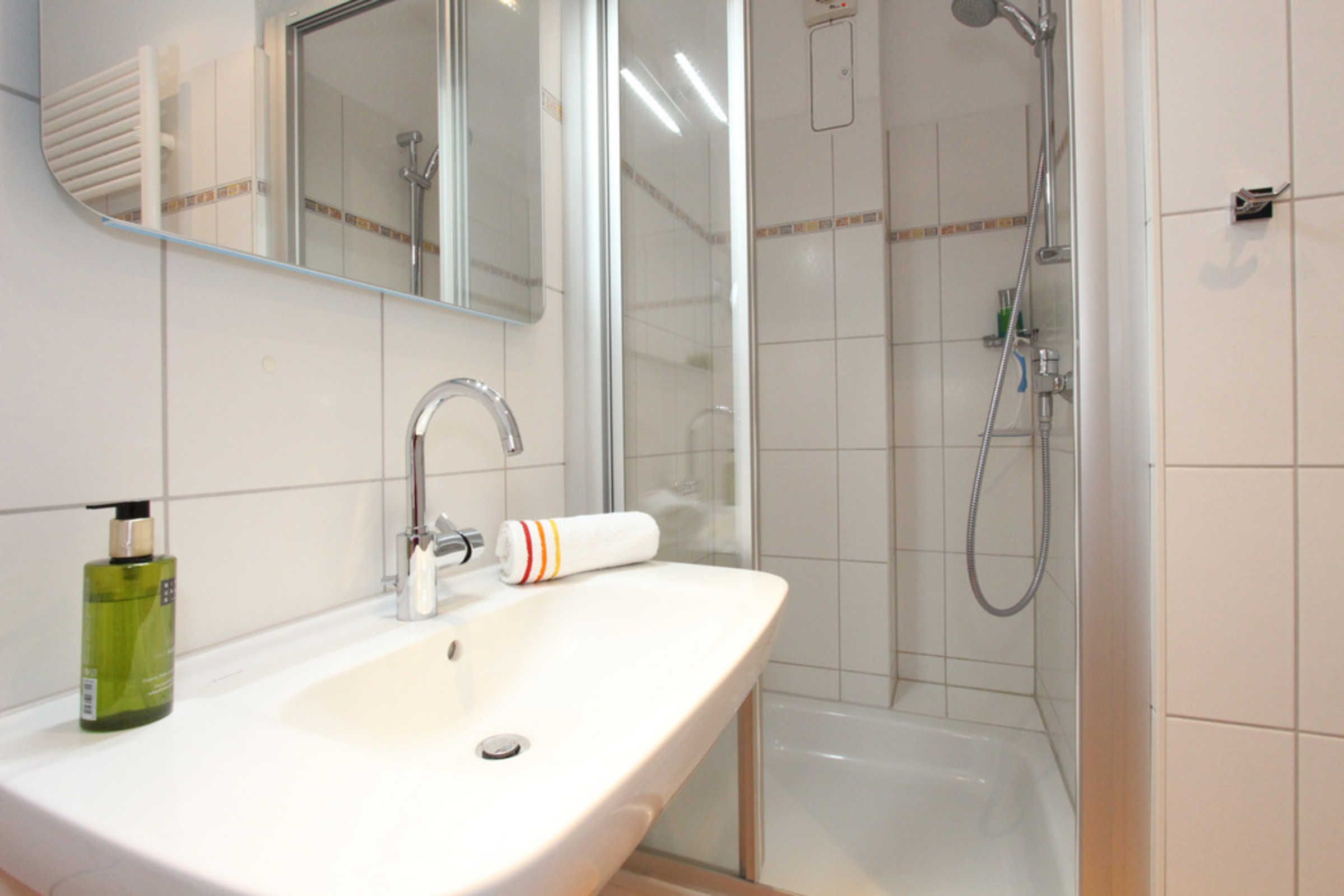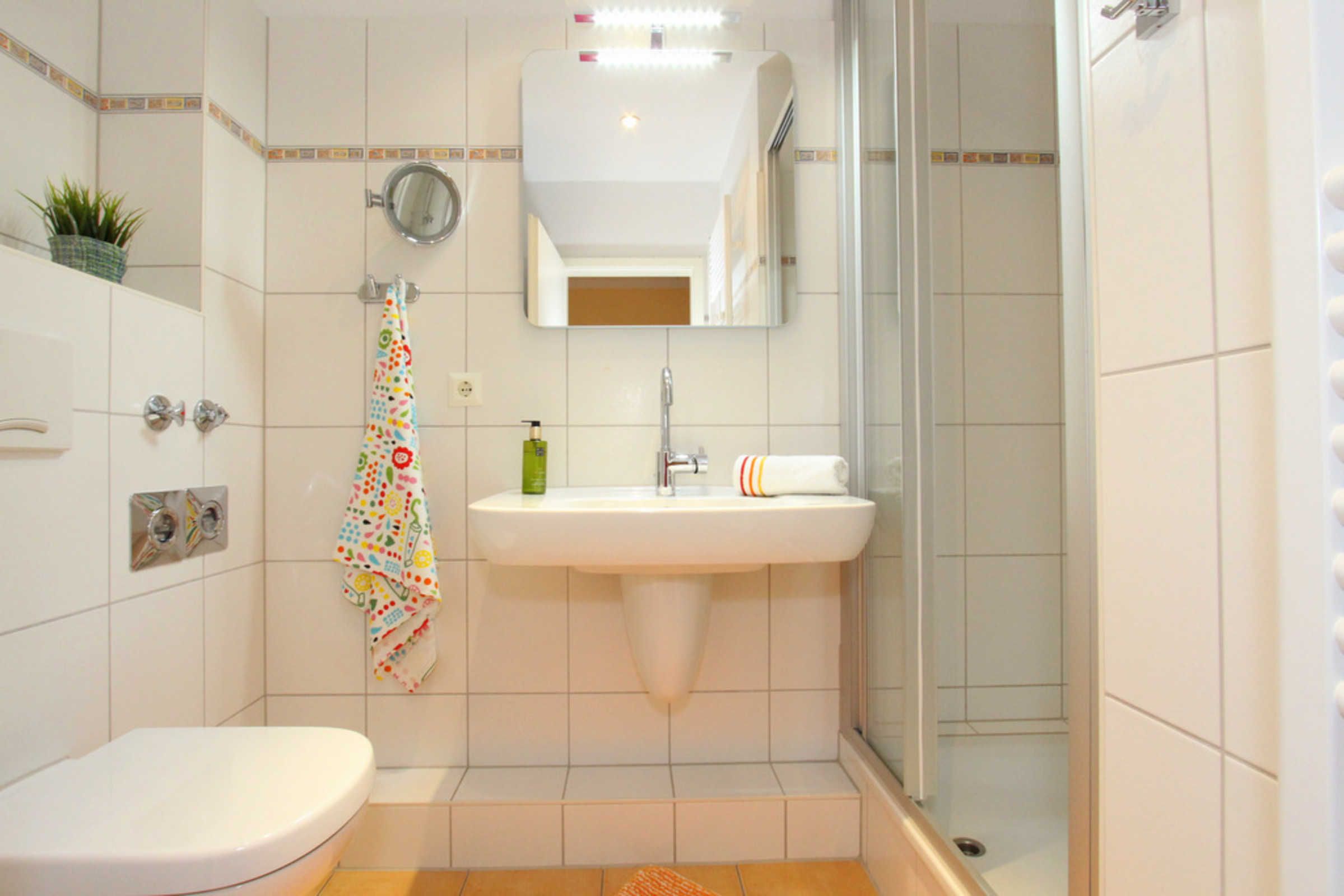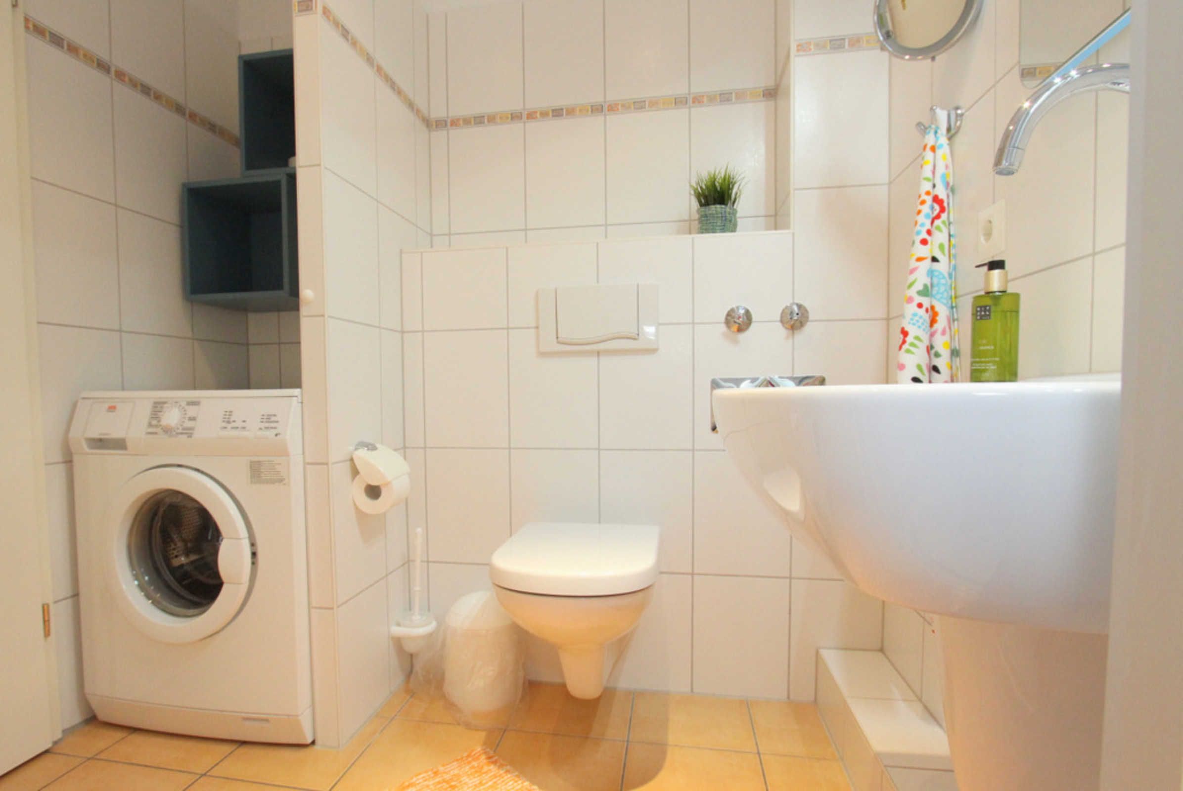 Das moderne Bad bietet Dusche, WC, Haartrockner und Waschmaschine.