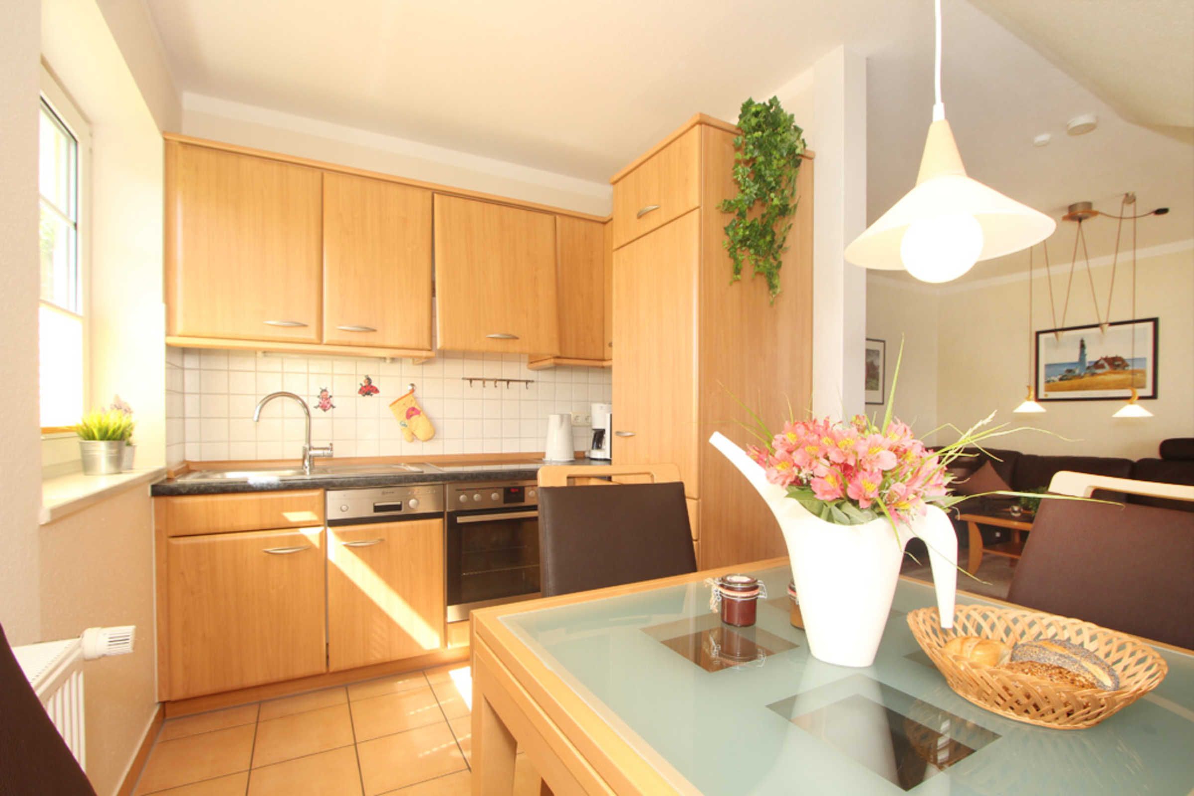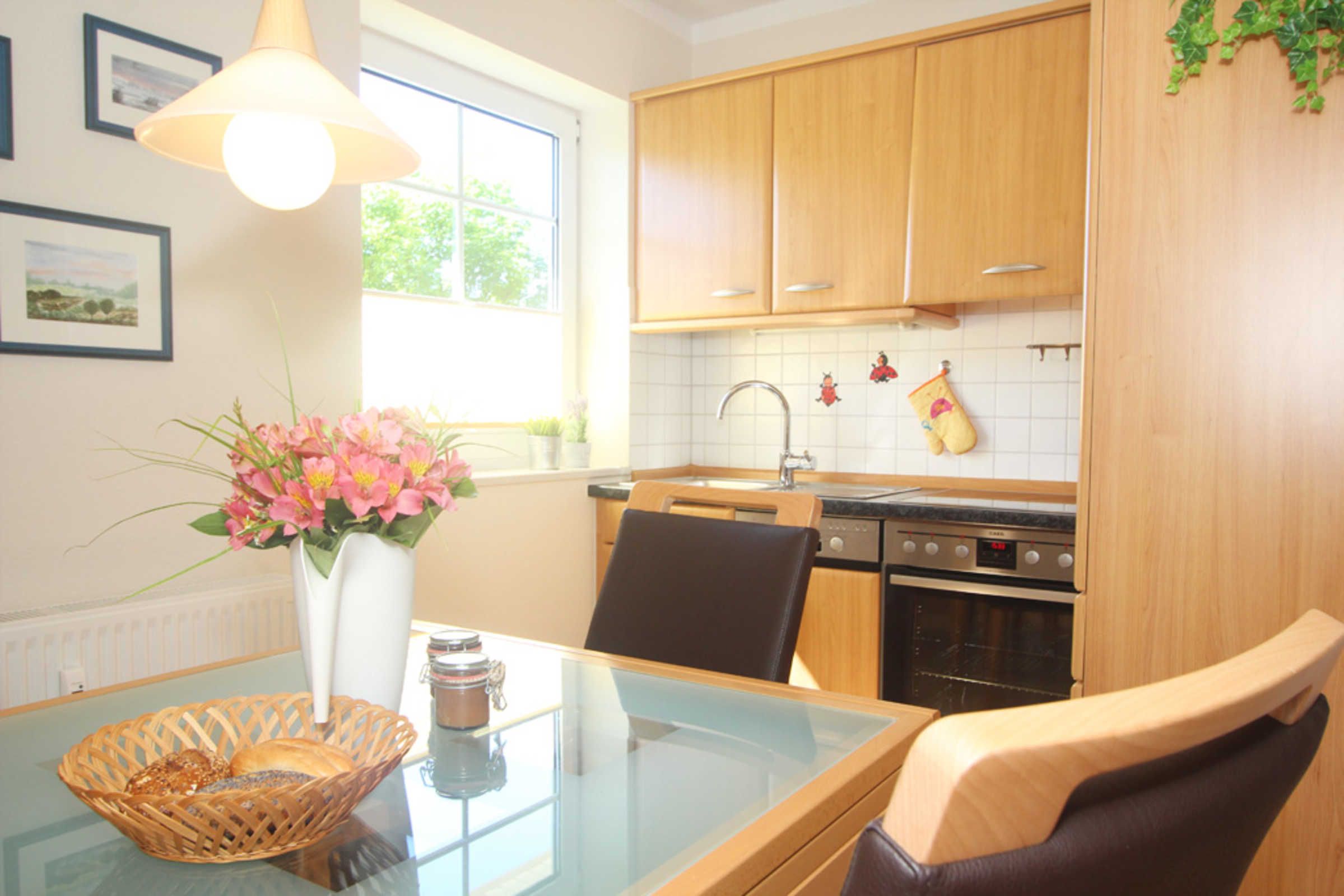 Kochen und Essen lässt es sich im offenen und modernen Küchen- und Essbereich. Die separate Essecke bietet eine bequeme Möglichkeit für ein gemeinsames Familienessen. Die Küchenzeile ist mit komfortabler Technik wie z.B. Herd mit Cerankochfeld, Backofen, Kühlschrank mit Gefrierfach, Wasserkocher, Kaffeemaschine usw. ausgestattet.