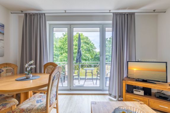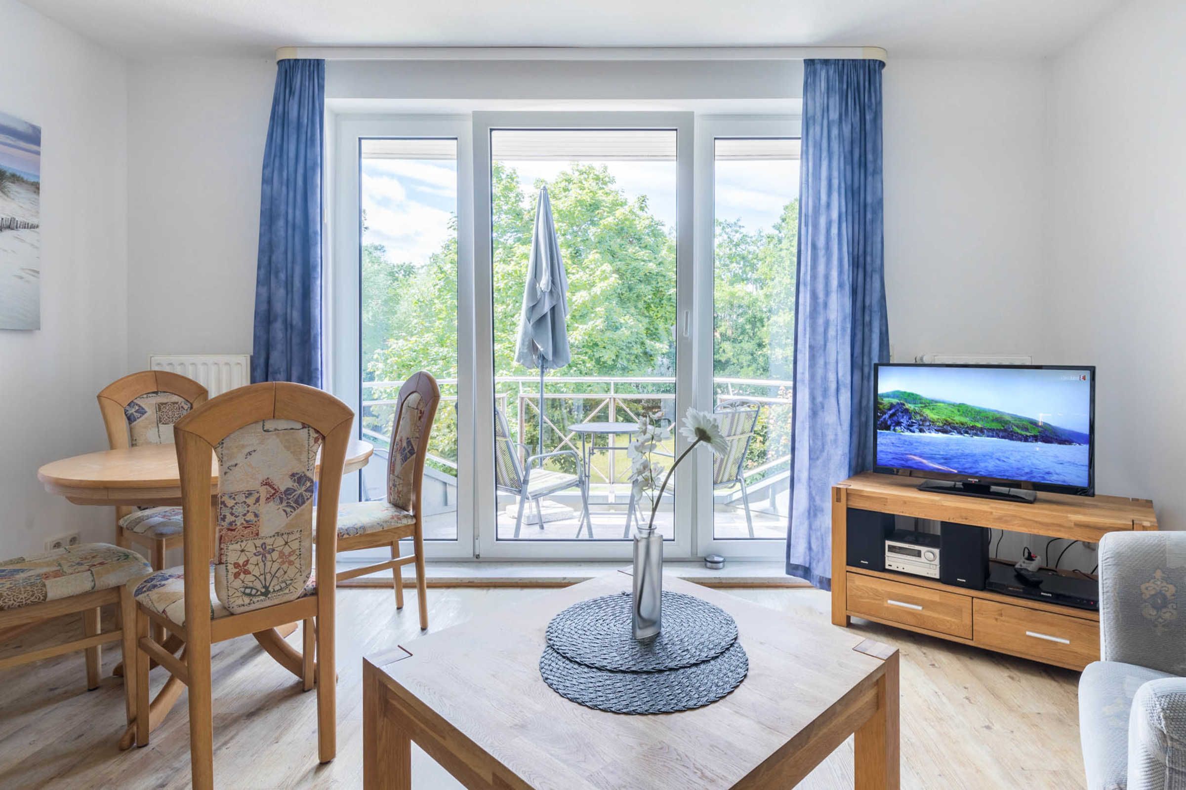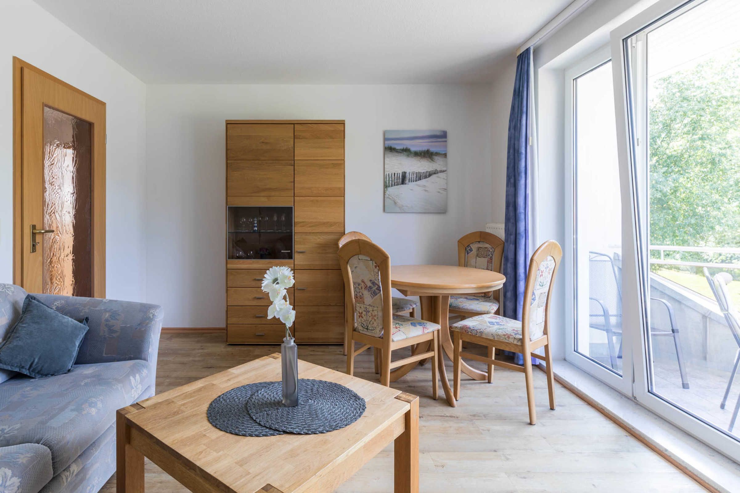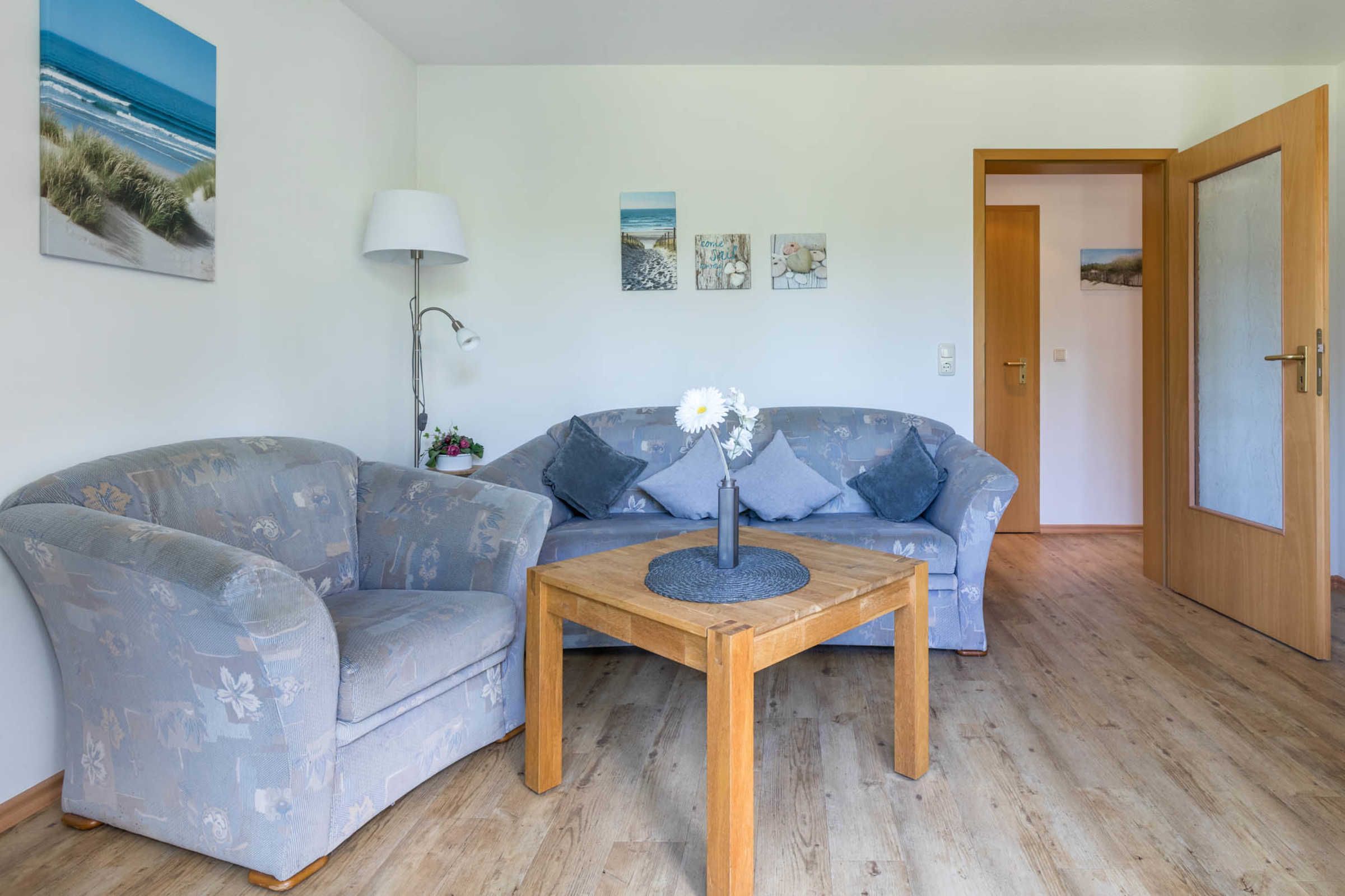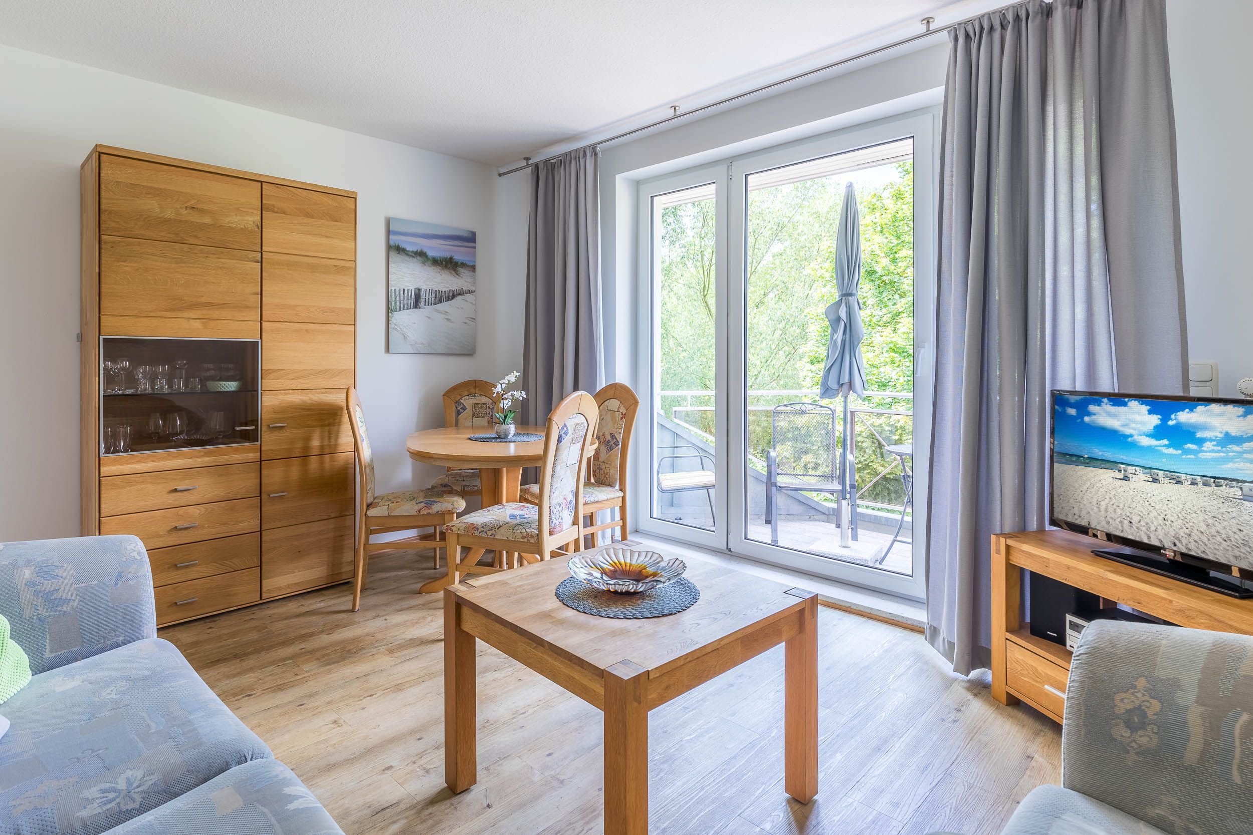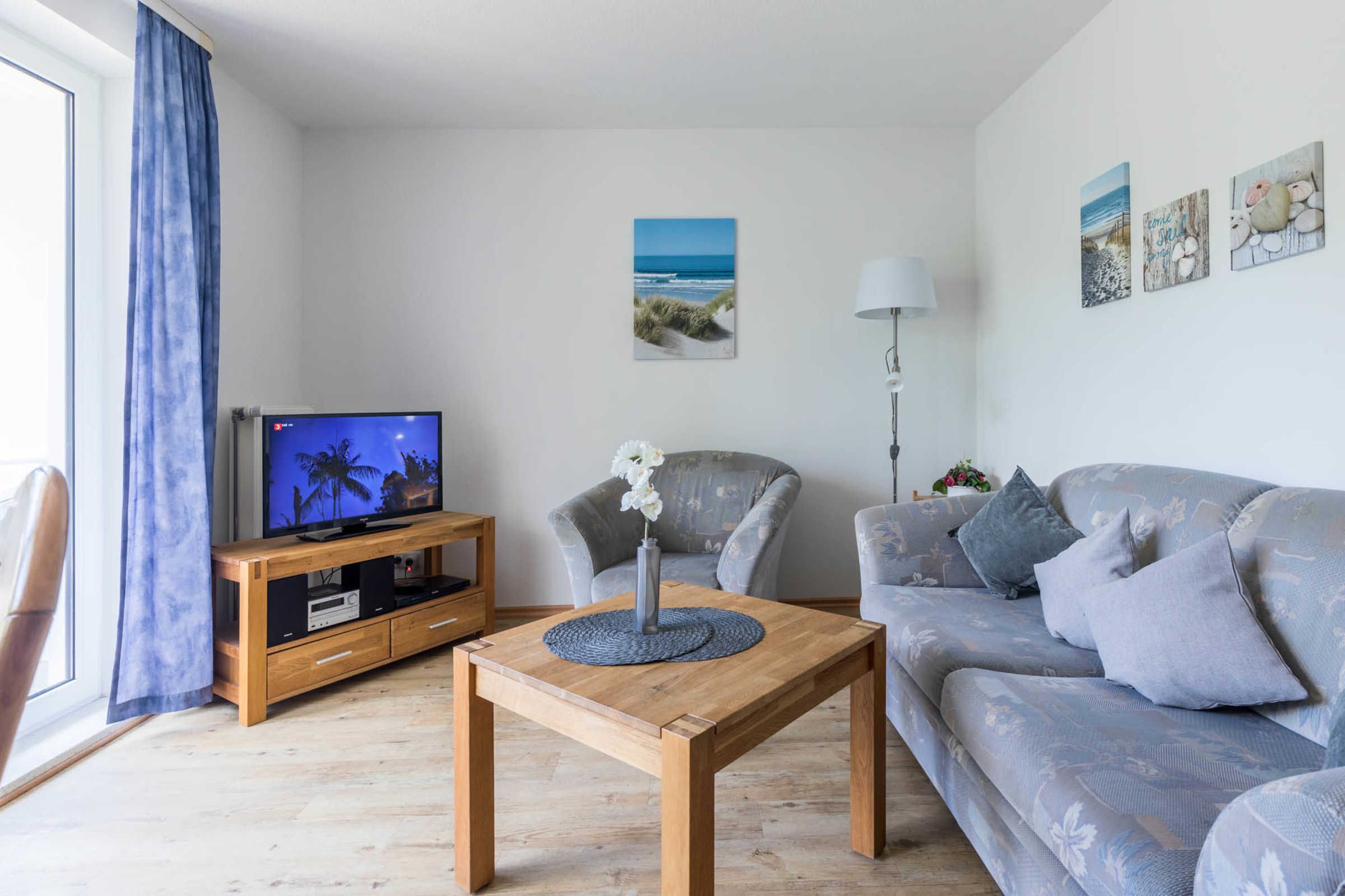 Das Feriendomizil bietet ein mit elegantem Mobiliar ausgestattetes Wohnzimmer mit gemütlicher Couch und Essecke. Wer getrennt schlafen möchte, kann hier gern die Couch ausziehen, sie hat ausgezogen eine Liegefläche von 150x200cm. Zur Unterhaltung finden Sie hier Flatscreen-TV, DVD-Player und auch eine kleine Musikanlage.