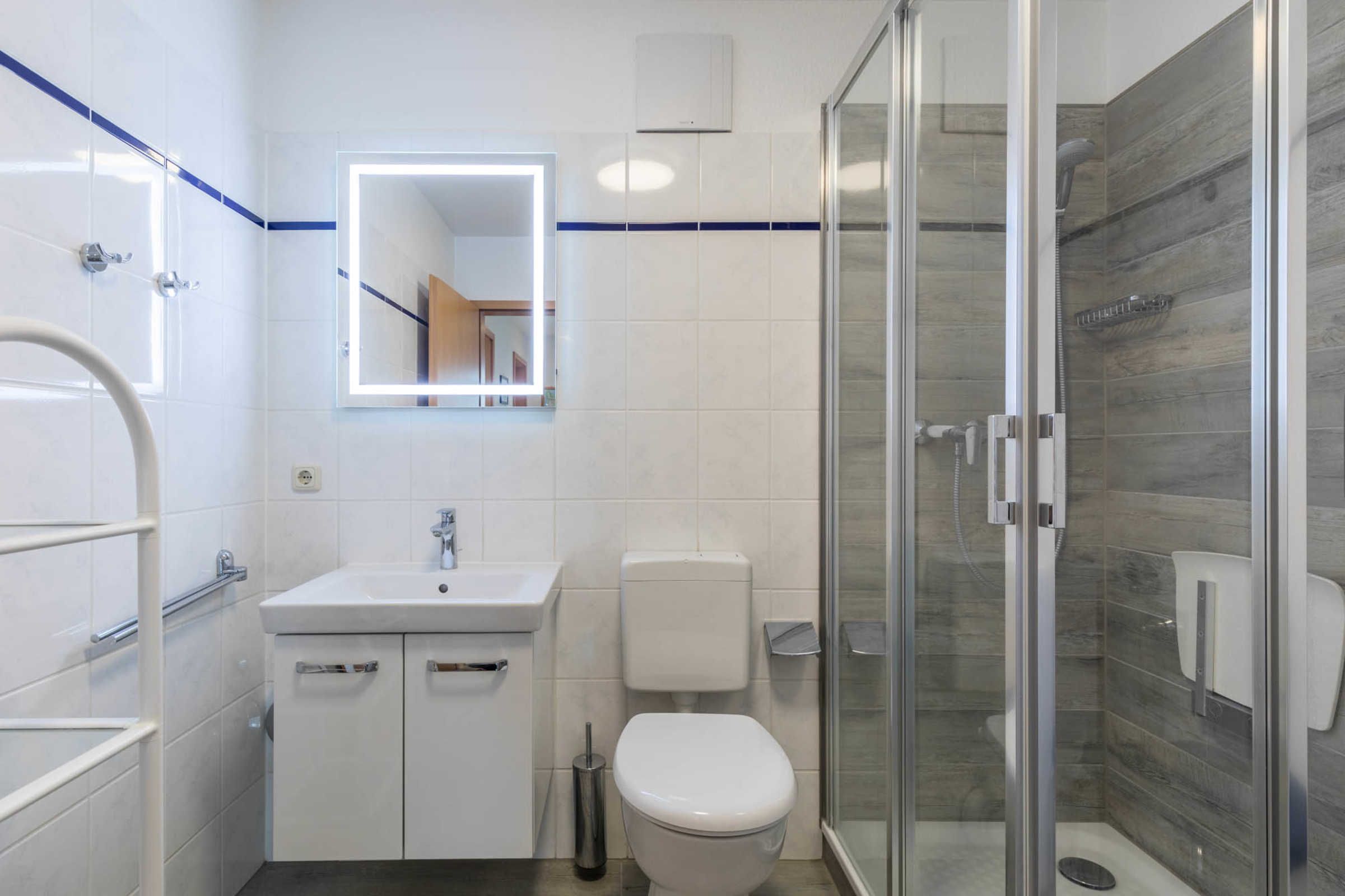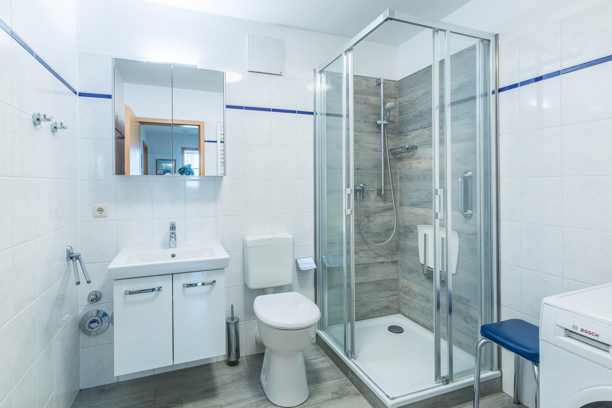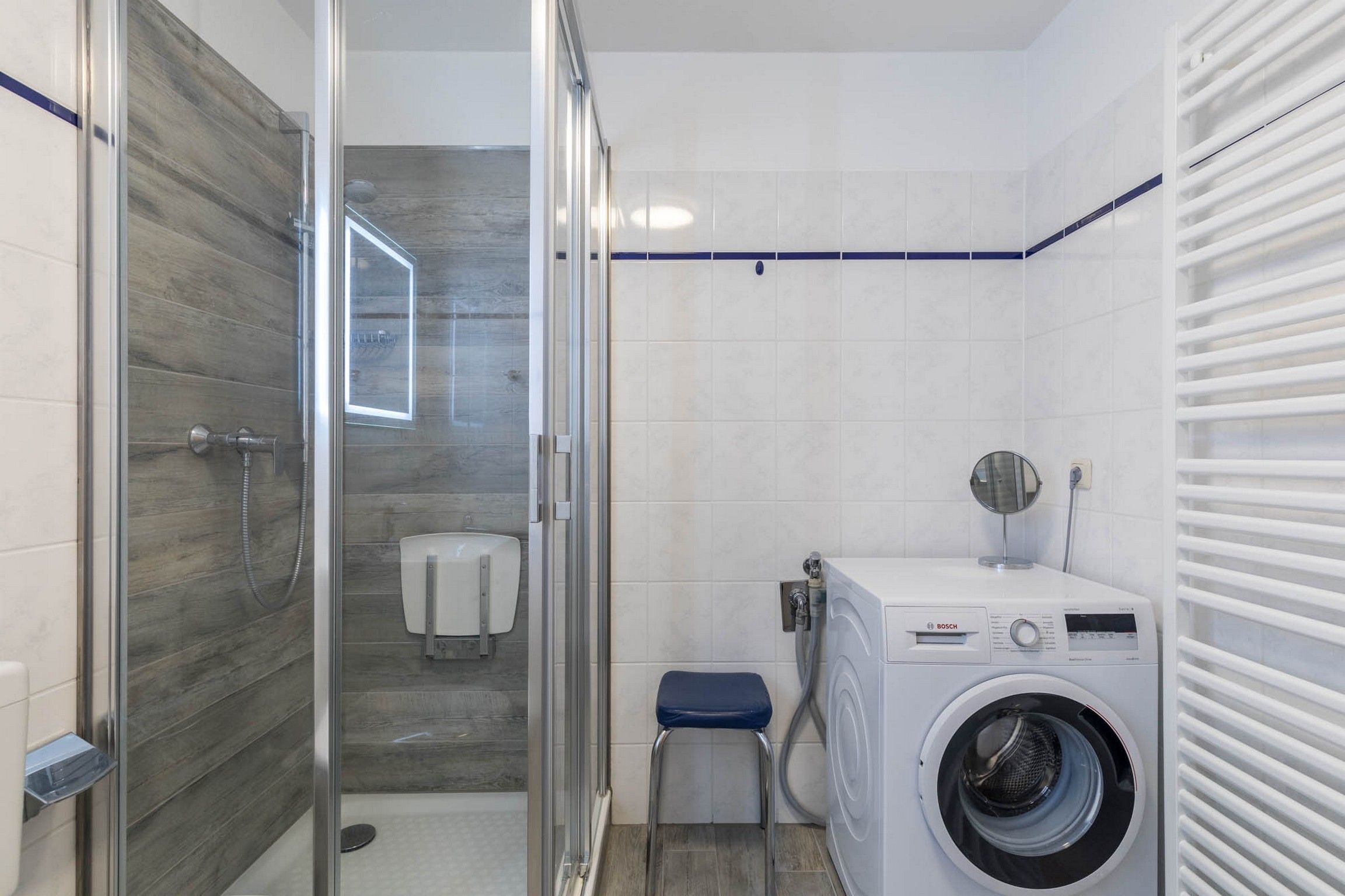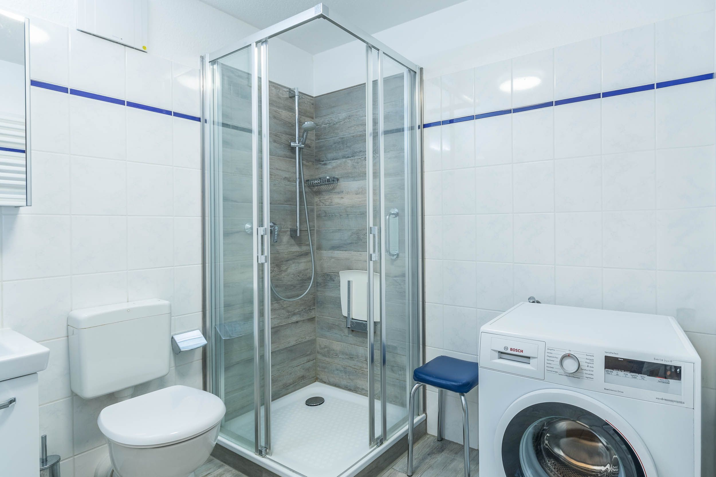 Das innenliegende Badezimmer ist mit Dusche, WC, Waschmaschine und Föhn ausgestattet.