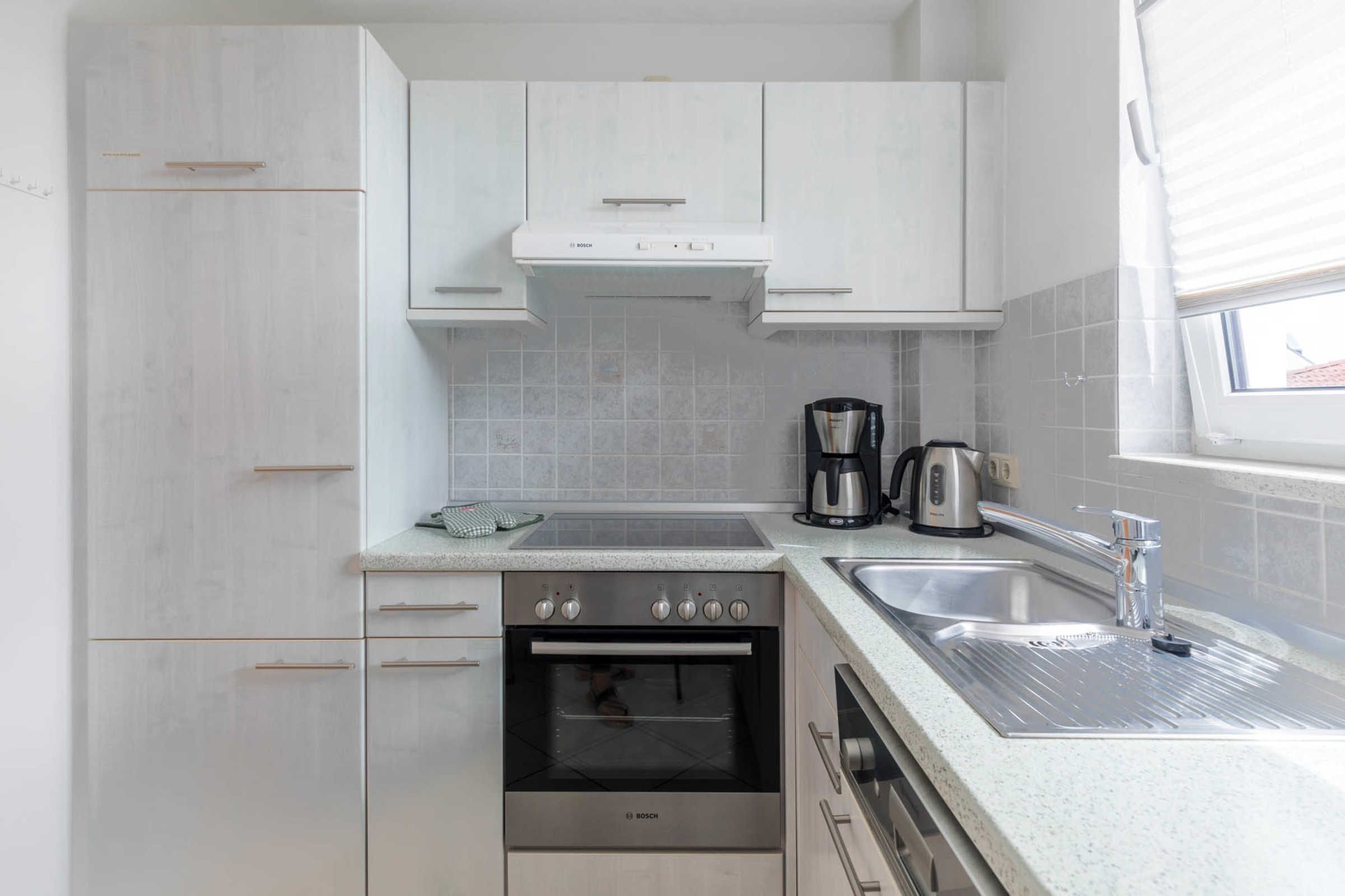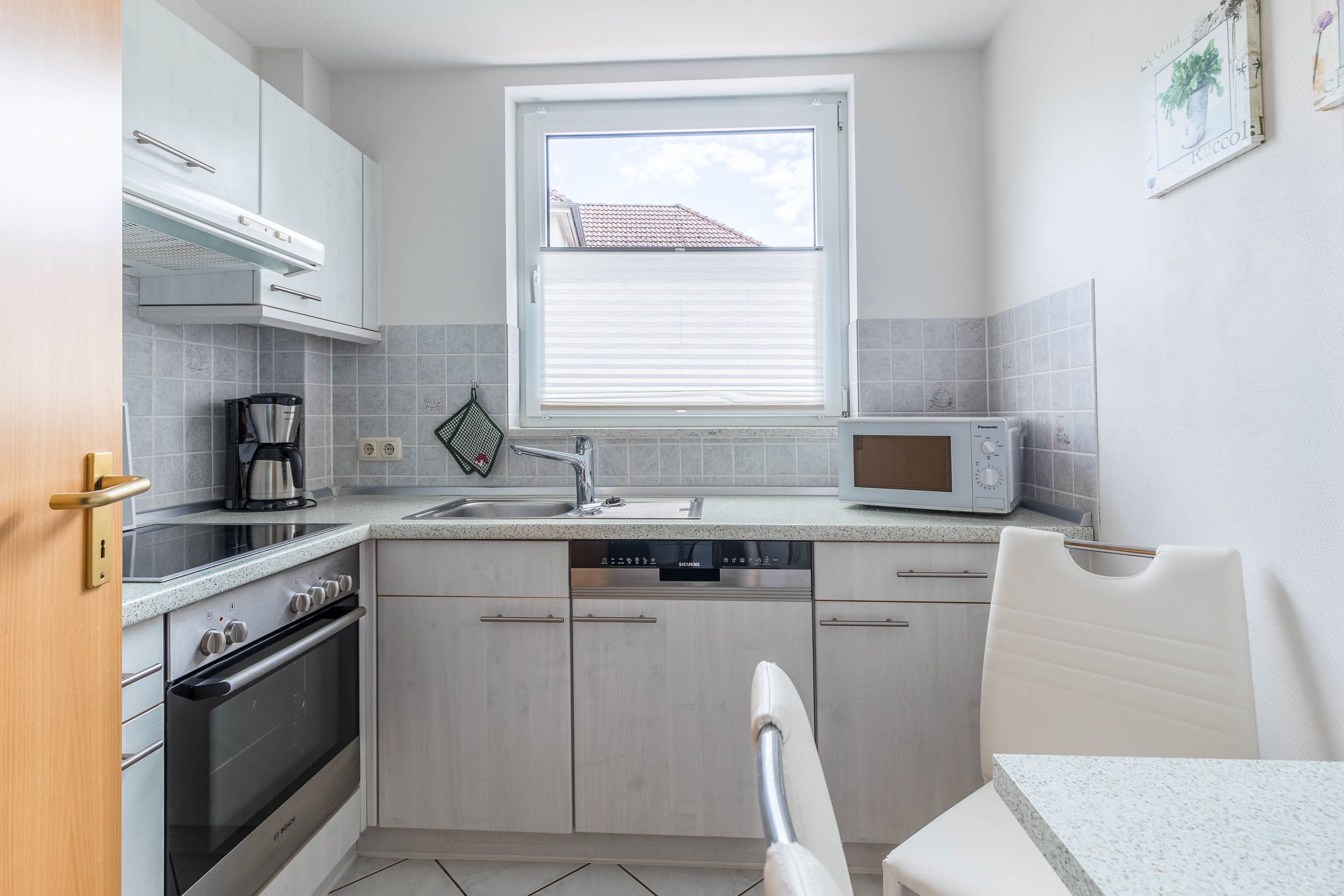 Weiterhin bietet die Unterkunft eine moderne, separate Küche mit einer sehr guten Ausstattung für die Selbstverpflegung. So finden Sie neben Ceranherd und Backofen auch Geschirrspüler, Mikrowelle, viele elektrische Kleingeräte und natürlich ausreichend Geschirr, Besteck usw.
