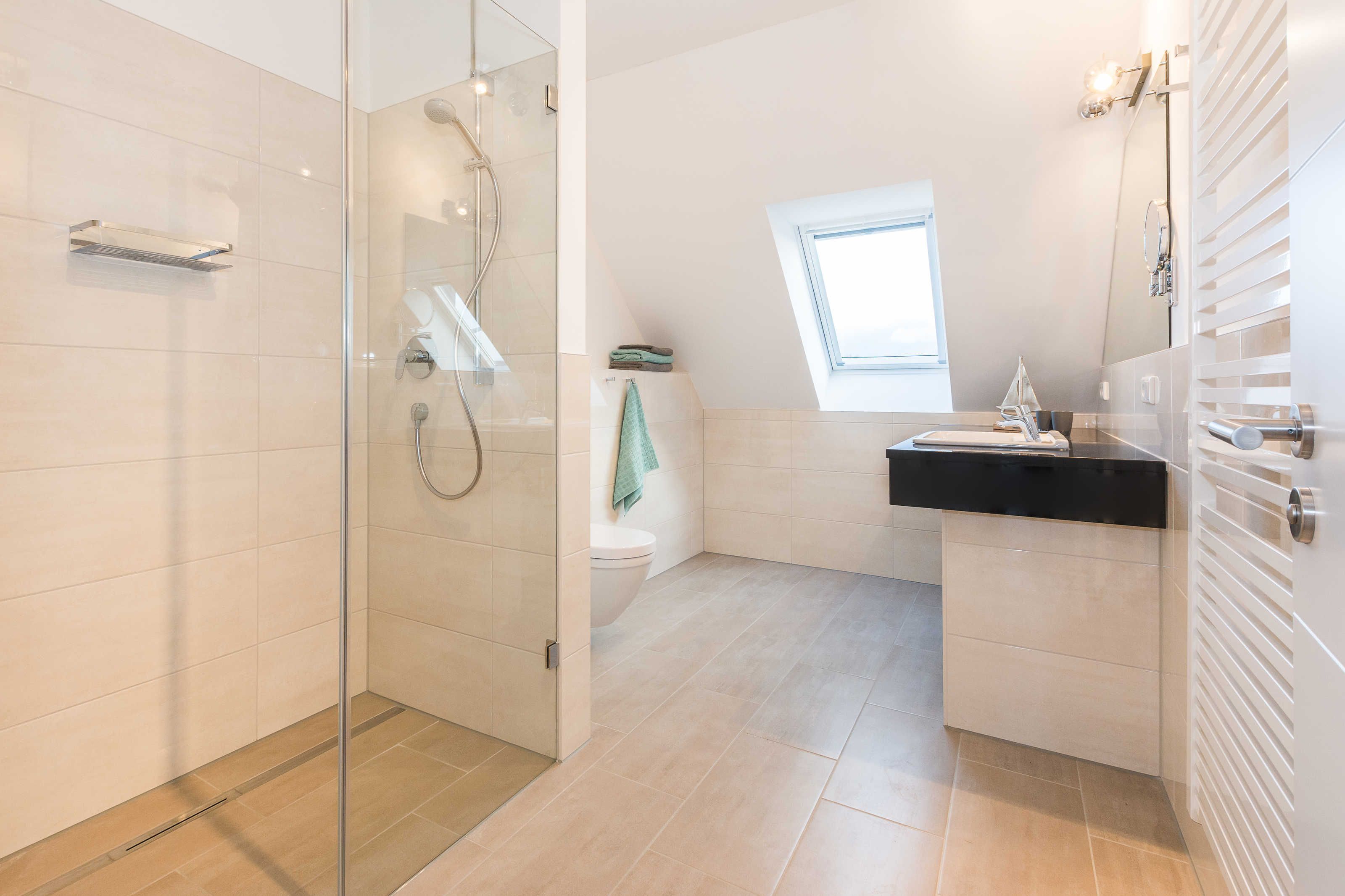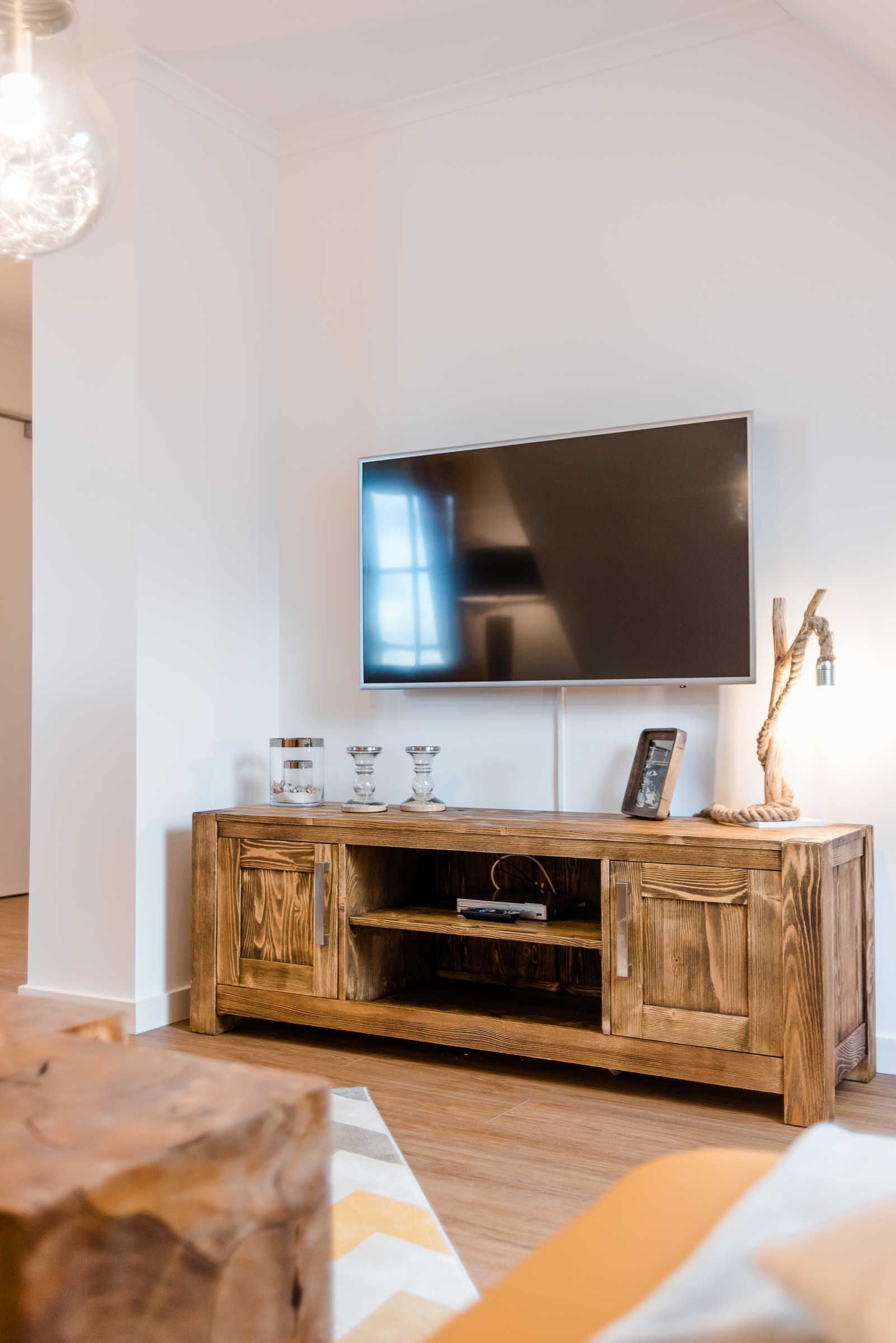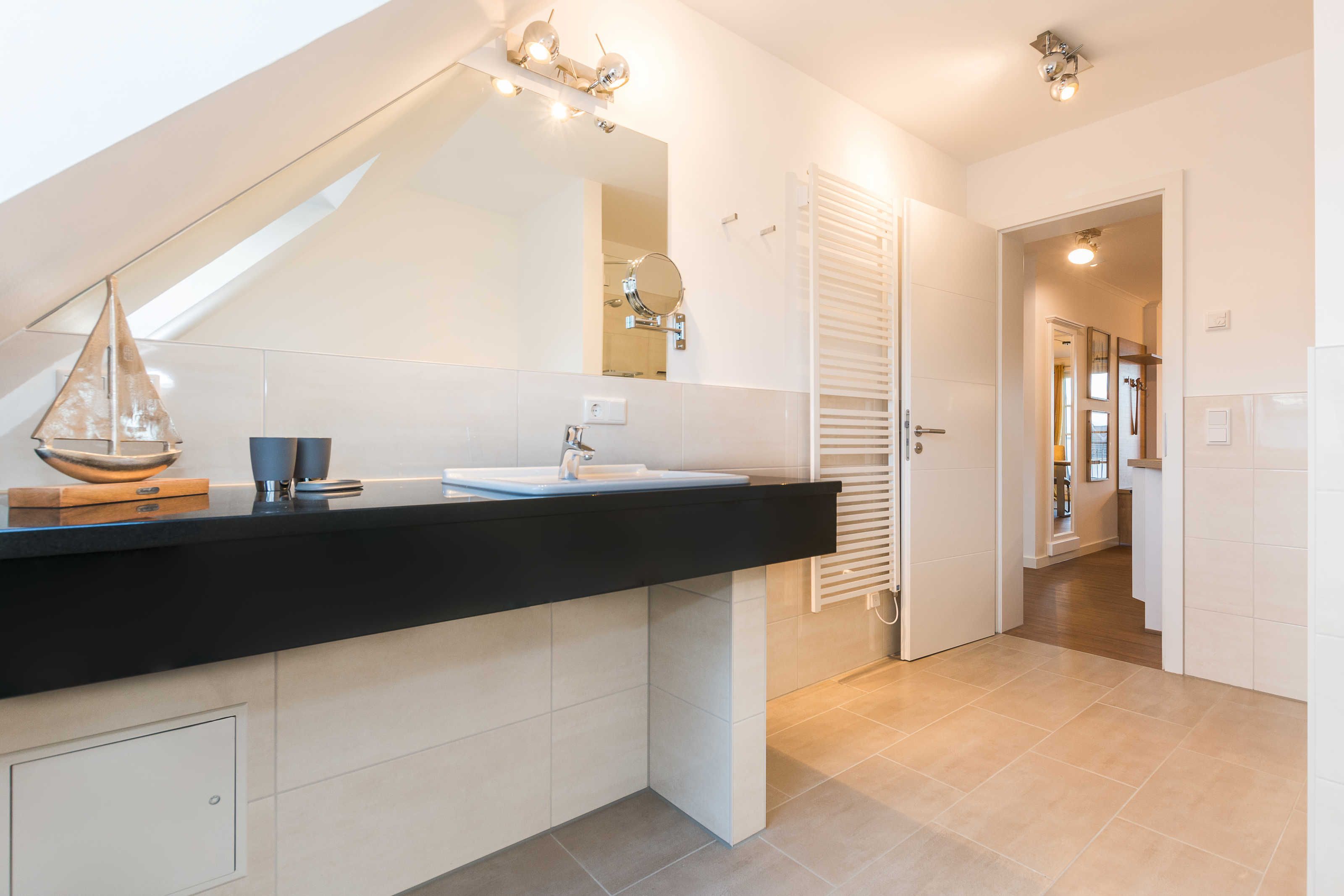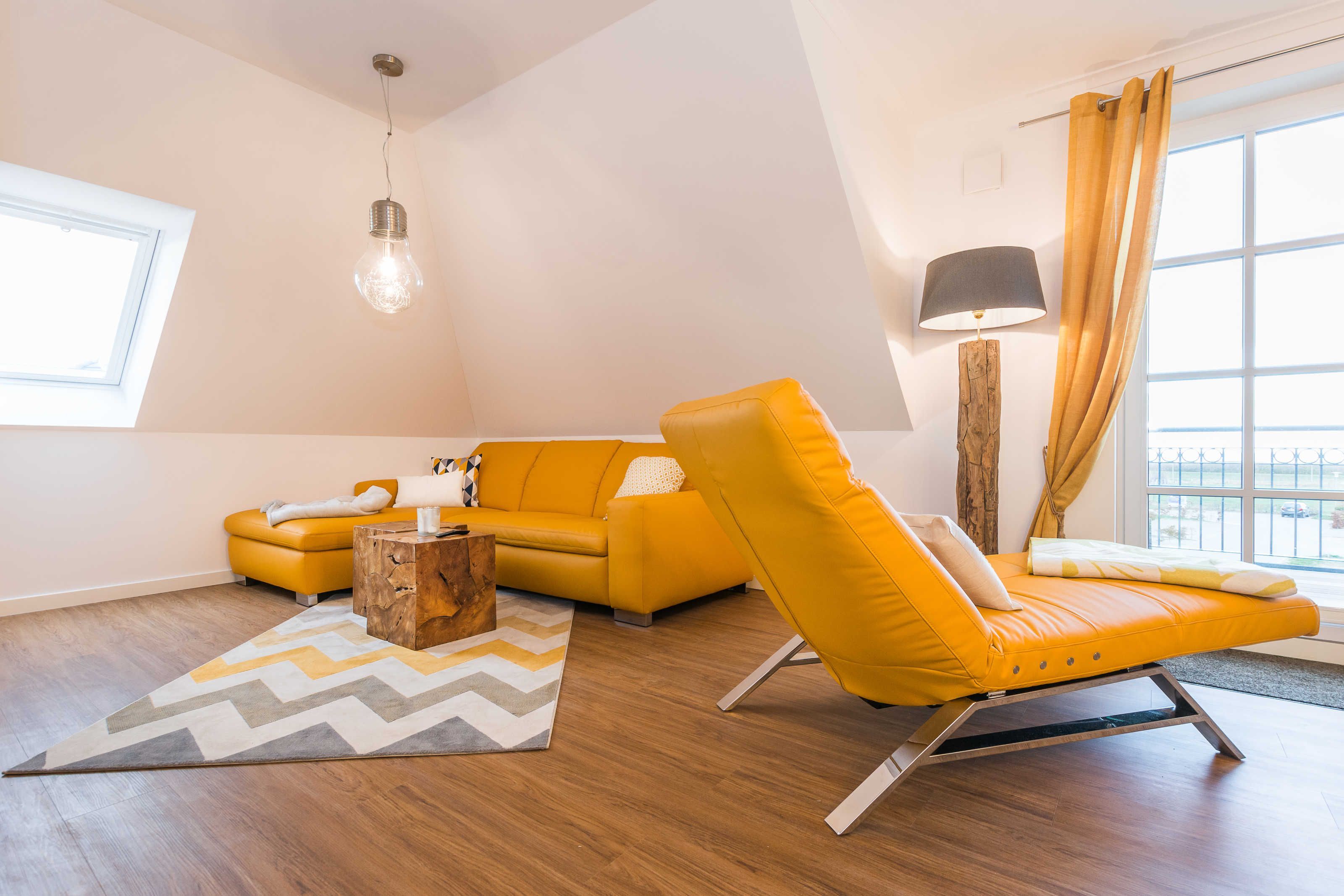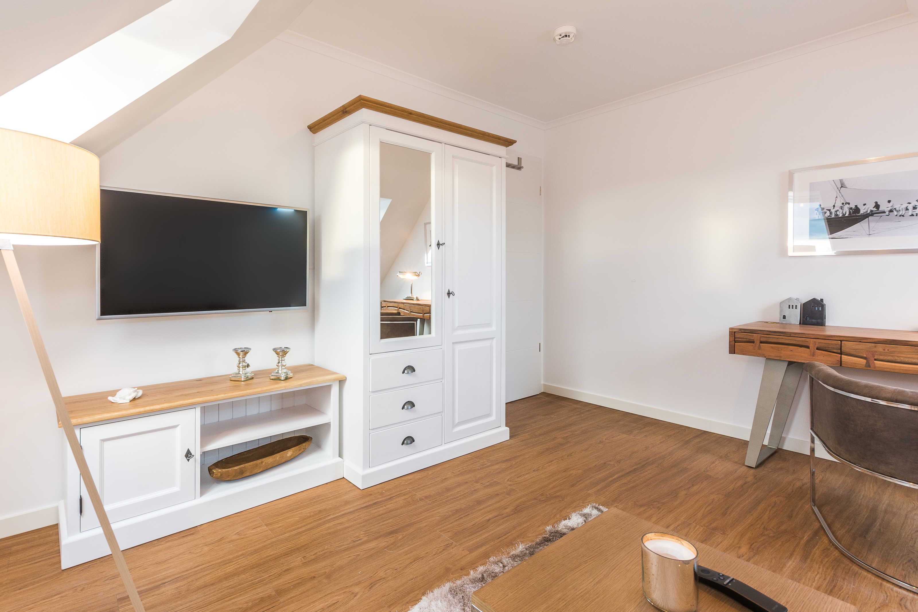 Das Wohnzimmer verfügt über eine bequeme Eck-Couch und eine verstellbare Relax-Liege mit Blick auf das Meer. Das Schlafzimmer ist mit einem Boxspring-Doppelbett (je 180 x 200 cm) ausgestattet. Im geräumigen Tageslicht-Badezimmer befinden sich eine bodengleiche Dusche, ein großer Waschtisch, ein Handtuchheizkörper und ein Haartrockner. Die Wohnung wurde mit drei Flachbild-TV-Geräten (49 bzw. 43 Zoll) komplettiert und ist damit auch für einen differenzierten Fernsehgeschmack der Gäste vorbereitet. In der kälteren Jahreszeit sorgt die Fußbodenheizung für kuschlige Wärme.