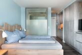 Der kombinierte Wohn-/ Schlafbereich ist hochwertig eingerichtet. Neben einem Doppelbett findet sich ein kleiner Essplatz und ein Sofa, das bei Bedarf noch zwei Schlafgelegenheiten extra bietet. Wer Lust auf Kochen hat, findet in der Küche alles, was er braucht.