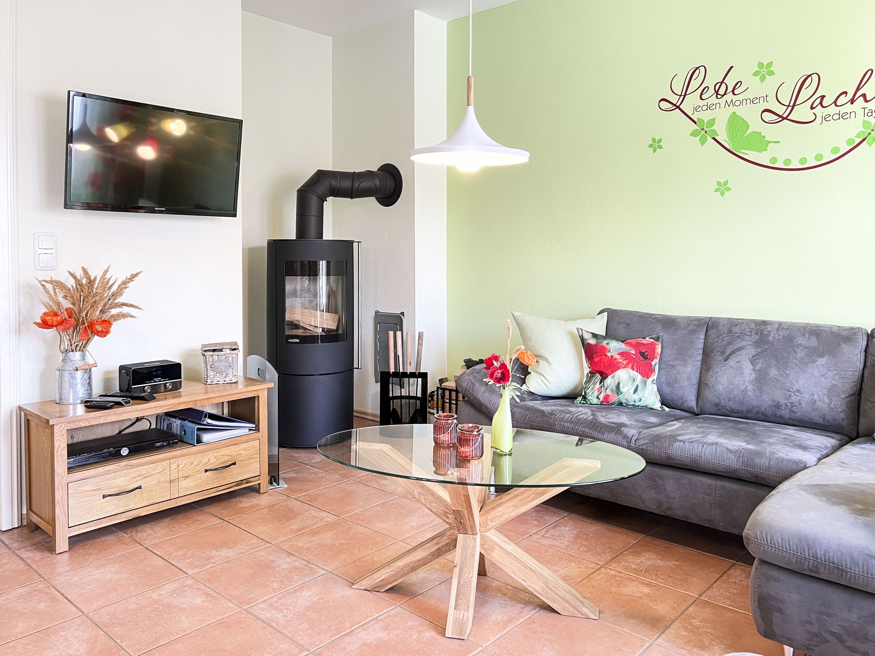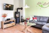 • Wohnbereich: Heller Wohnraum mit Kamin, Smart-TV und bequemer Sitzgruppe