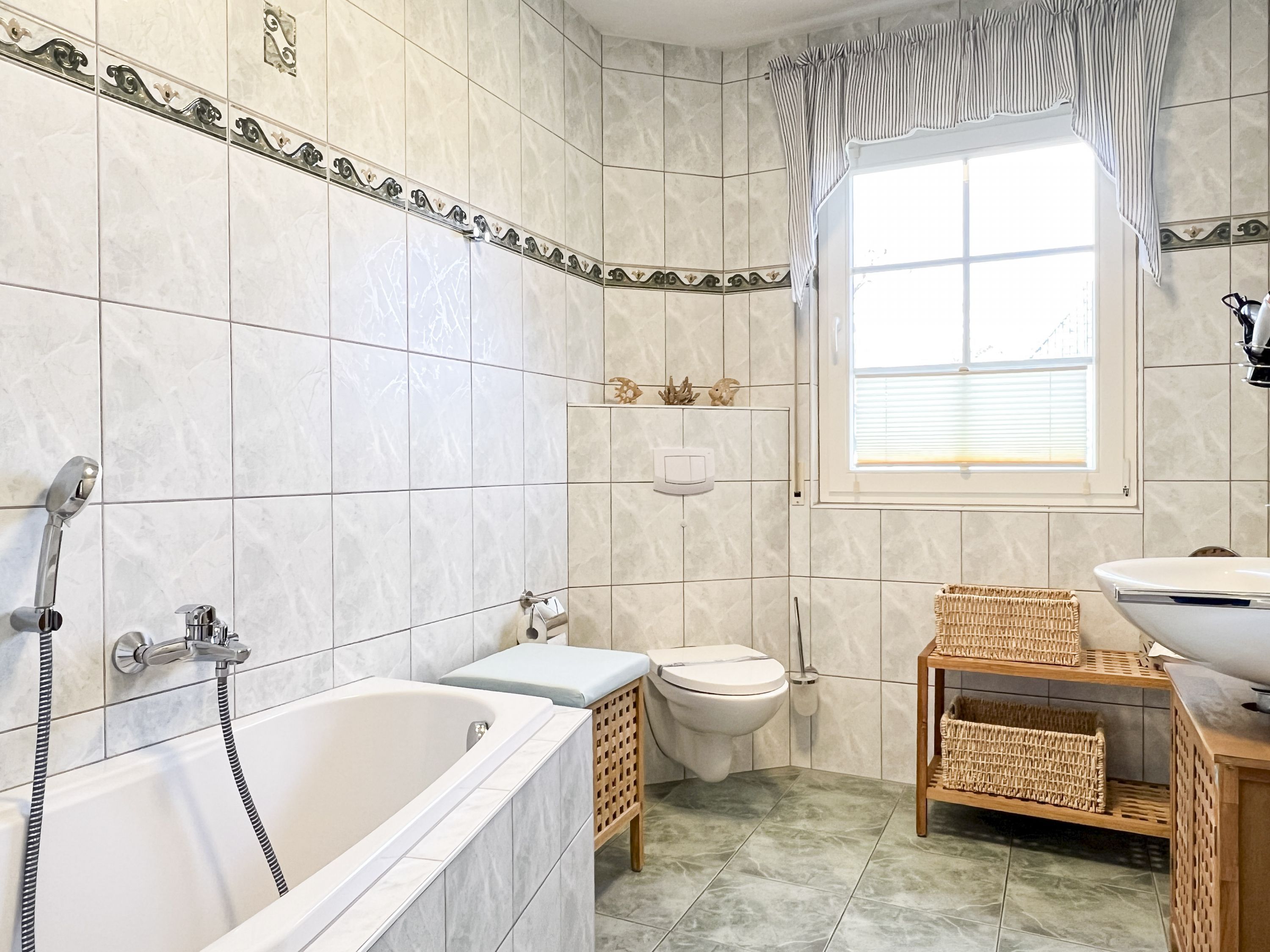 • Badezimmer: Zwei moderne Bäder, eines mit Badewanne/WC, das andere mit Dusche/WC, jeweils mit Handtuchtrockner und Haartrockner