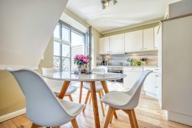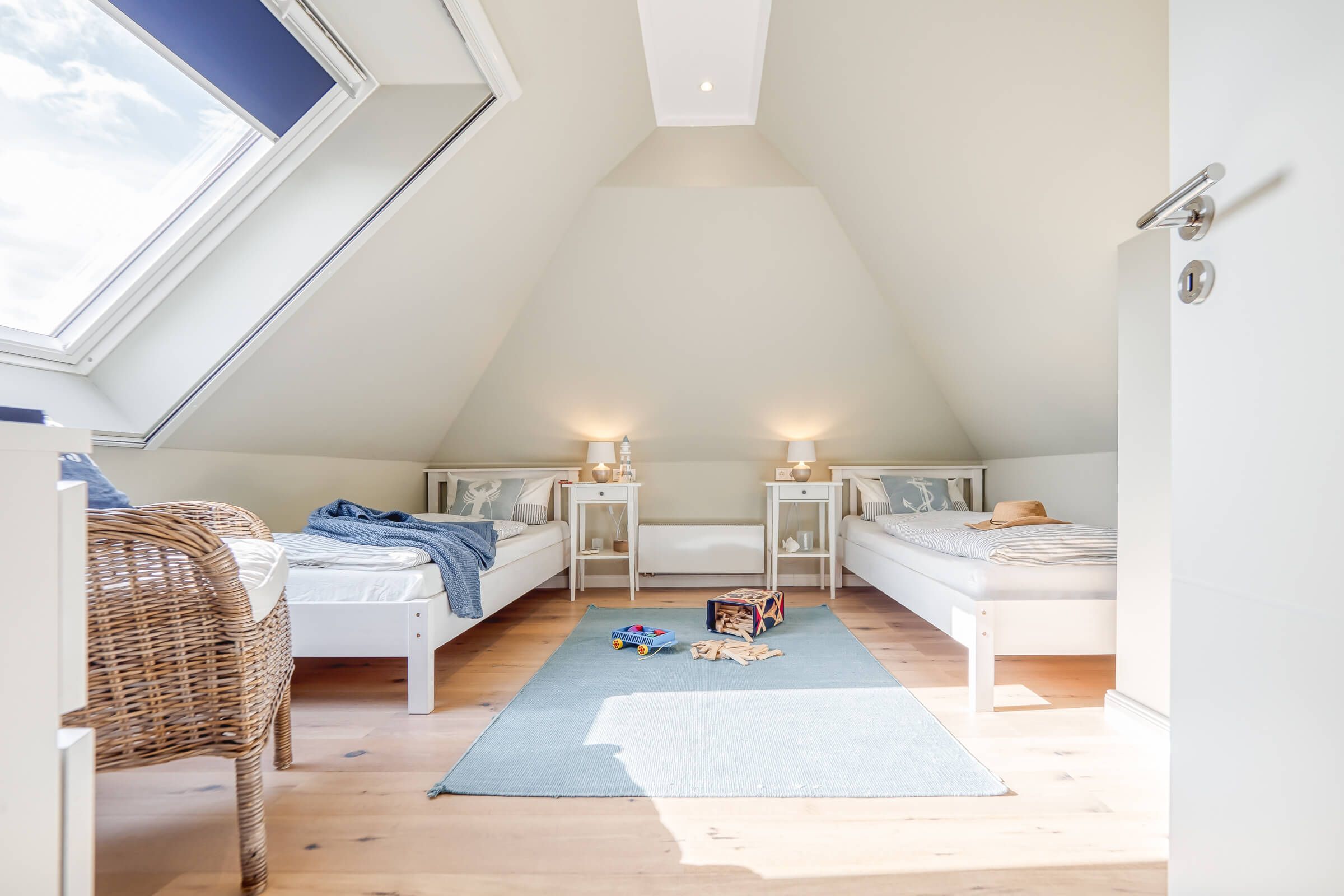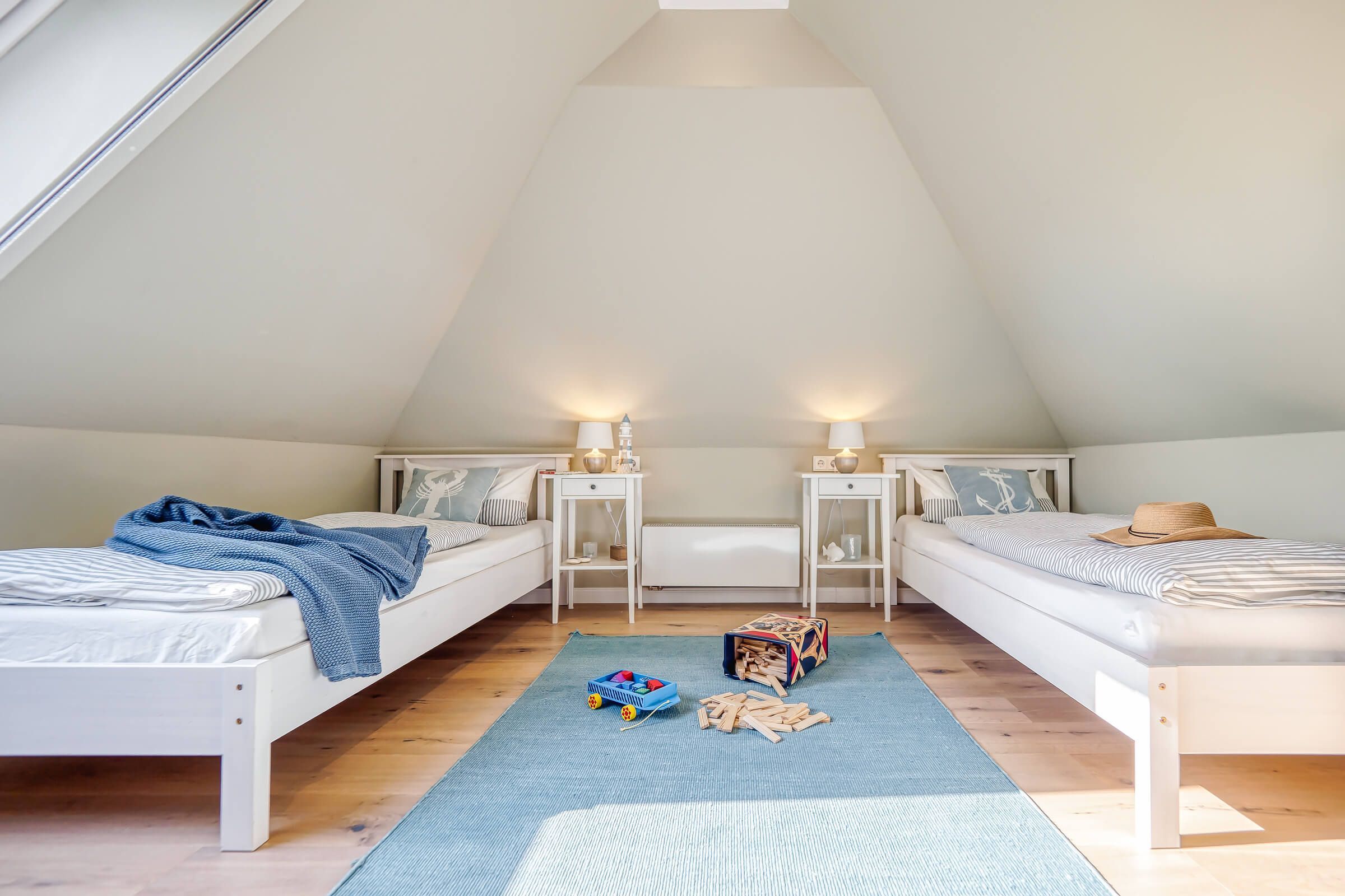 • Zwei Schlafzimmer: Ein Schlafzimmer mit luxuriösem Boxspringbett und ein Dachgeschosszimmer mit zwei Einzelbetten