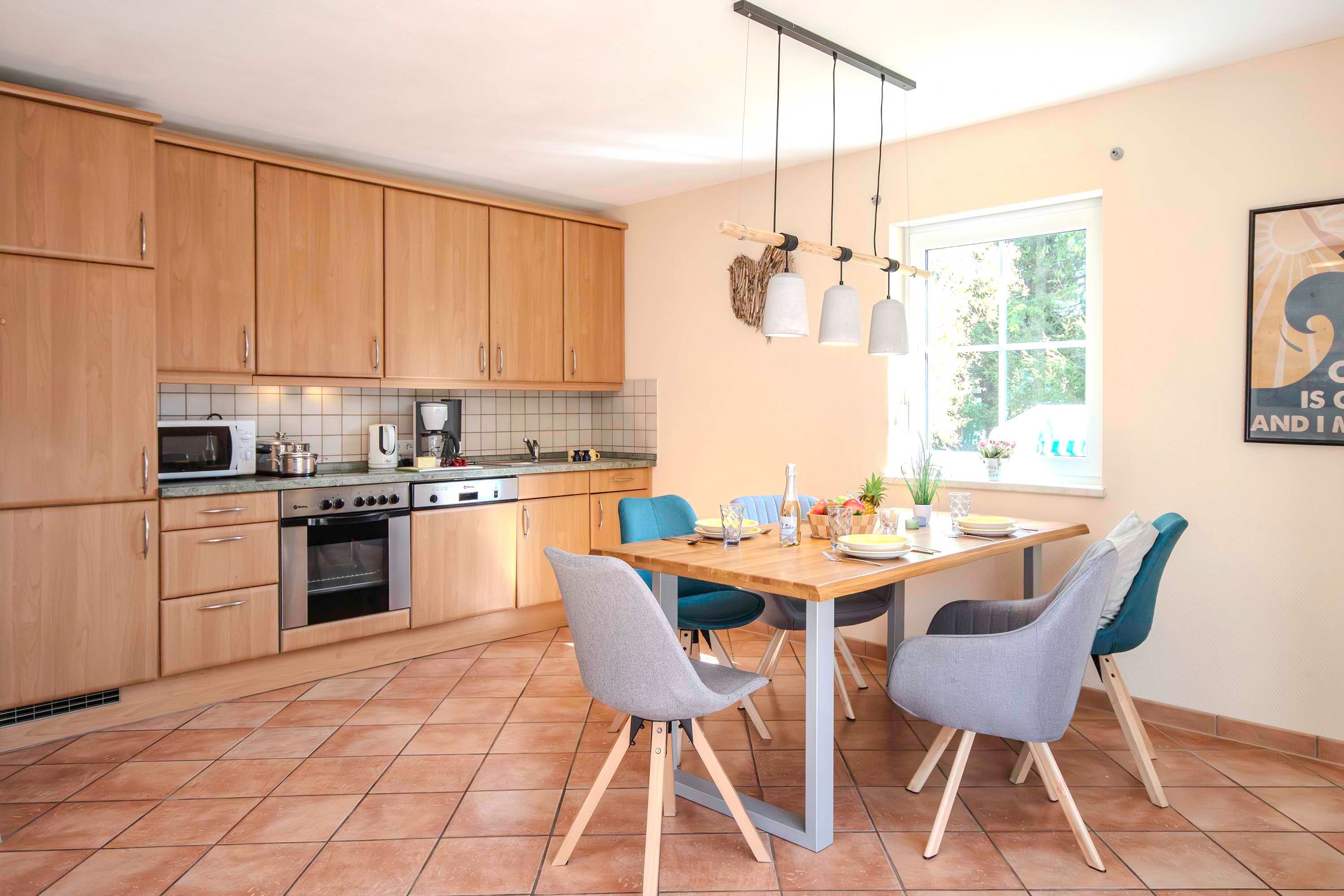 • Voll ausgestattete Küche mit Backofen, Geschirrspüler, Kühlschrank, Mikrowelle, Kaffeemaschine (Filter) und weiteren Annehmlichkeiten