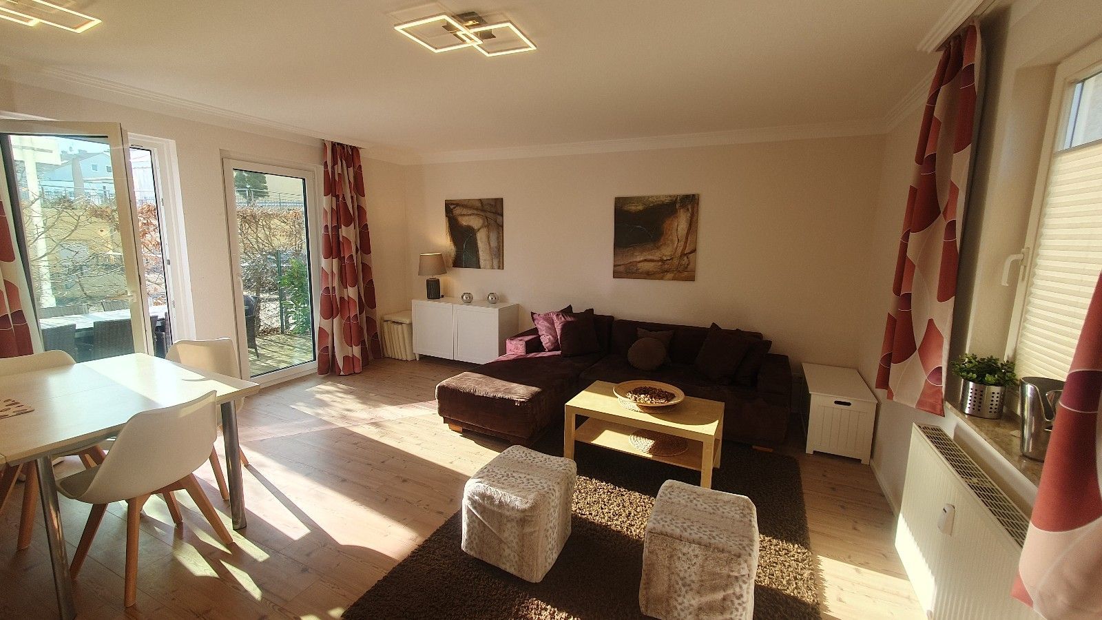 Das moderne, geschmackvoll eingerichtete Ferienhaus ist vor kurzem renoviert worden und eignet sich ideal für einen Familienurlaub. Auf dem Grundstück der Villa Malve liegt das Ferienhaus mitten im Zentrum von Bansin und zugleich nur drei Gehminuten vom Strand entfernt. 110 qm verteilen sich funktionell aber geschmackvoll auf 3 Etagen. Das erste Schlafzimmer mit Doppelbett befindet sich in der ersten Etage, das zweite Schlafzimmer mit französischem Bett und zwei Einzelbetten im Dachgeschoss - der Zugang erfolgt über das zweite Wohnzimmer über eine offene Treppe. Das zweite gemütliche Wohnzimmer liegt im Erdgeschoss und geht in einen freundlichen, hellen Essbereich über. Von dort aus gelangt man auf die zugehörige Terrasse - Lust auf ein gemütliches Frühstück im Freien oder einen heiteren Grillabend? Die separate Küche liegt ebenfalls im Erdgeschoss, ebenso ein Gäste-WC mit Waschbecken. Das geräumige Tageslichtbadezimmer mit Badewanne befindet sich im ersten Stock. In beiden Wohnzimmern kann eine Aufbettung von jeweils zwei Personen auf den komfortablen Schlafsofas vorgenommen werden. Ein Pkw-Stellplatz befindet sich direkt am Haus.